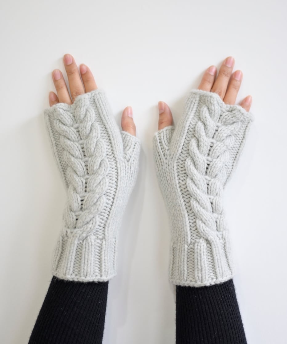 この糸で編むことにより、ソフトでバルキーな風合いとなり、とても軽く暖かいウールのアームウォーマーに仕上がっています。