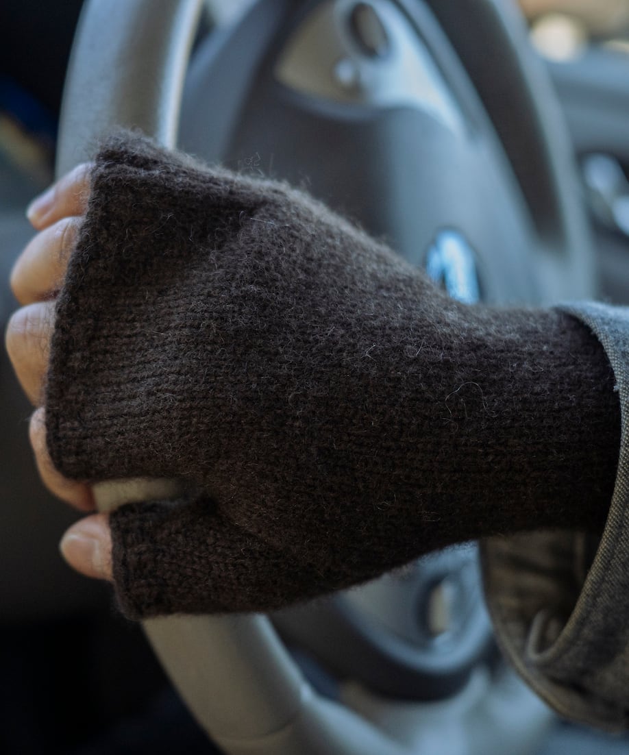 昔ながらの手編み機で、人の手で編み機のキャリッジを動かして編んで作るニット手袋です。編み機で編むときには、糸を張るテンションと、編地を下に引っ張るテンションが非常に大事です。それを人の手と目で具合を見ながら優しく編み、私たち独自の加工方法により、軽く柔らかく暖かいニット手袋ができました。