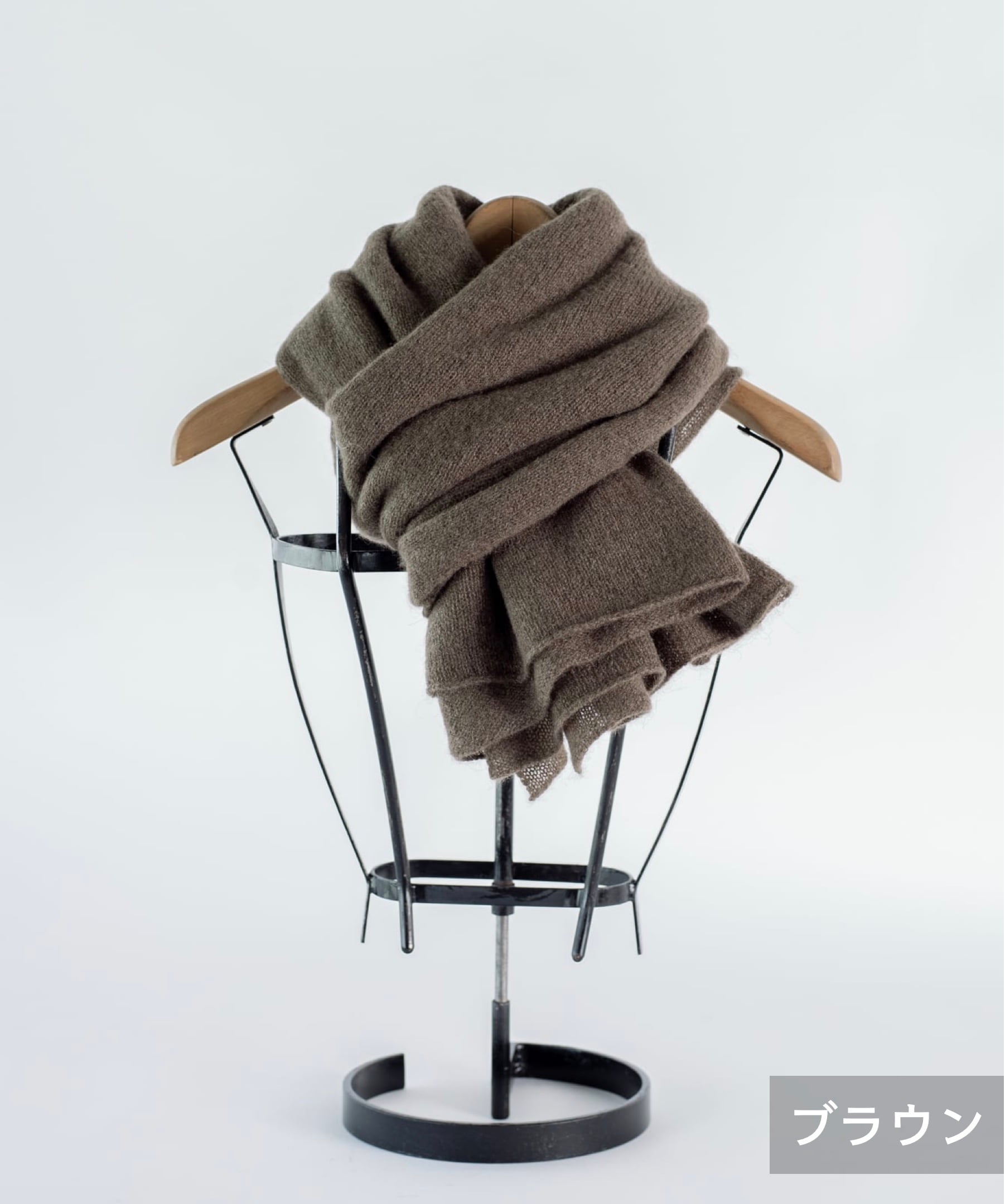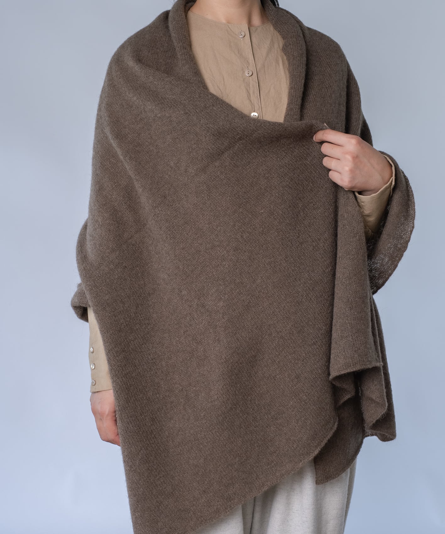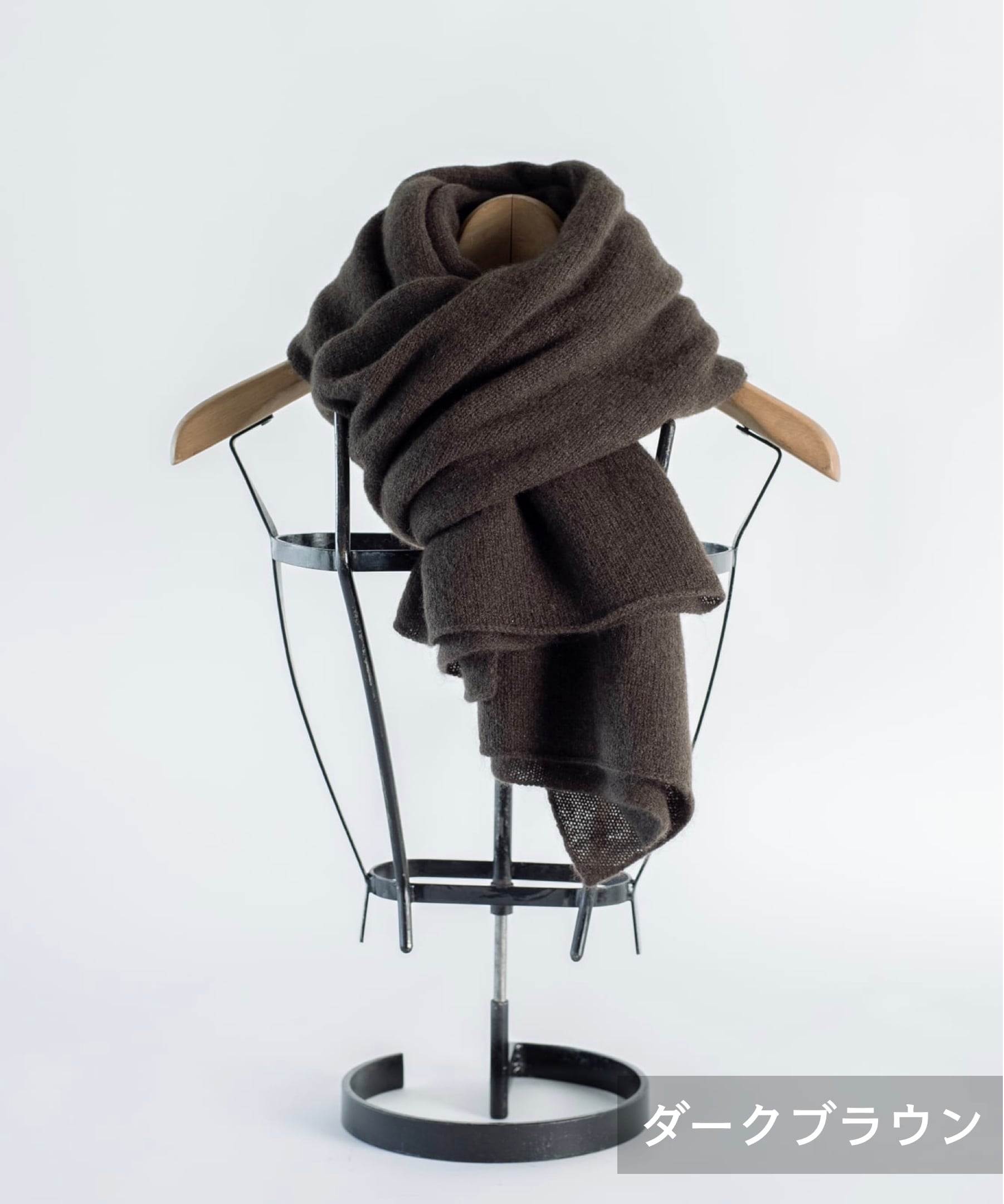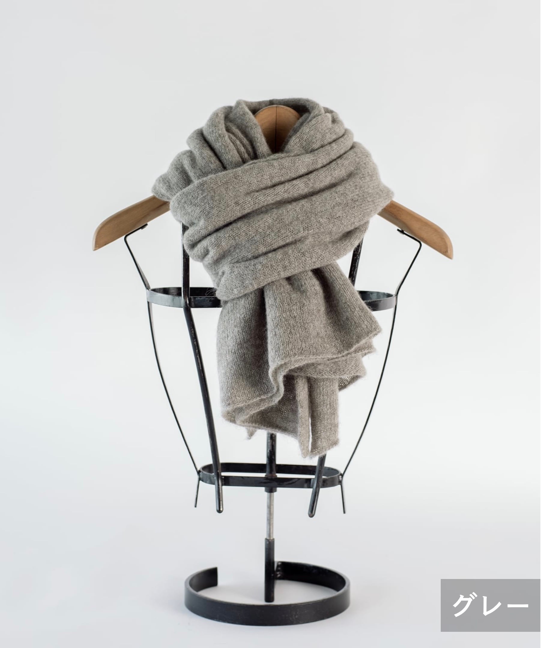 昔ながらの手編み機にて、人の手で編み機のキャリッジを動かして編んで作るストールです。編み機で編むときには、糸を張るテンションと、編地を下に引っ張るテンションが非常に大事です。それを人の手と目で具合を見ながら優しく編み、私たち独自の加工方法により、非常に軽く柔らかく暖かいストールができました。
