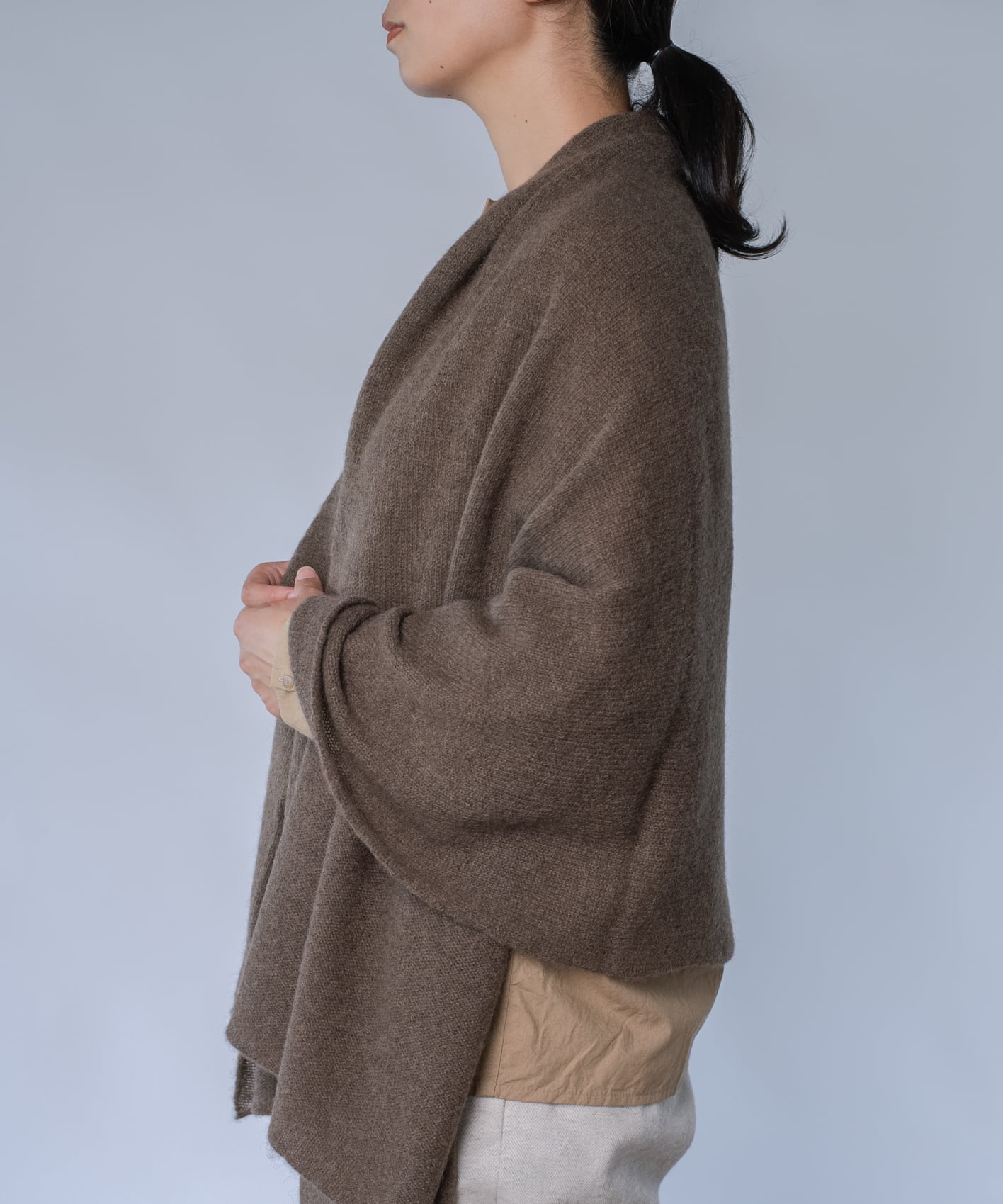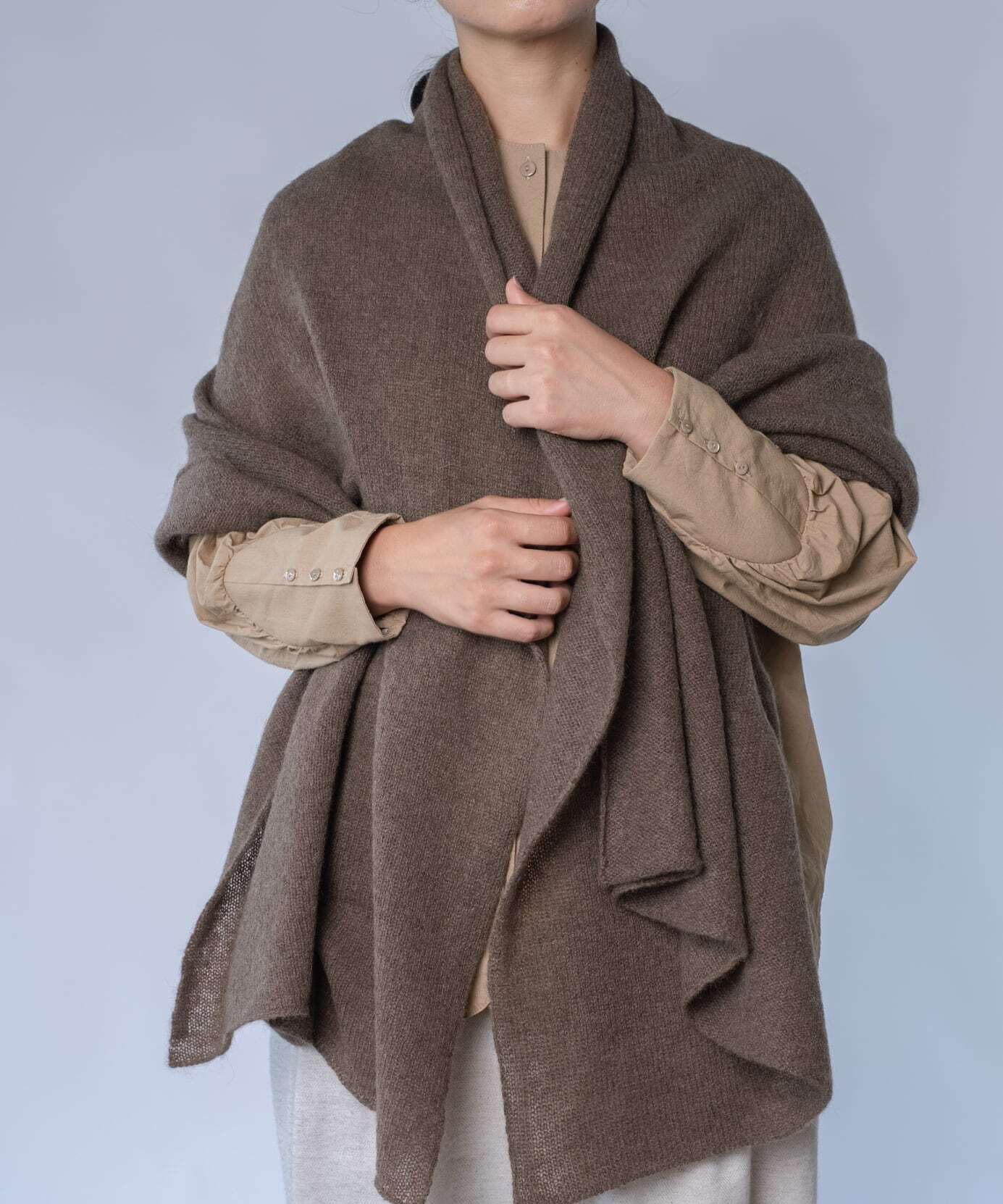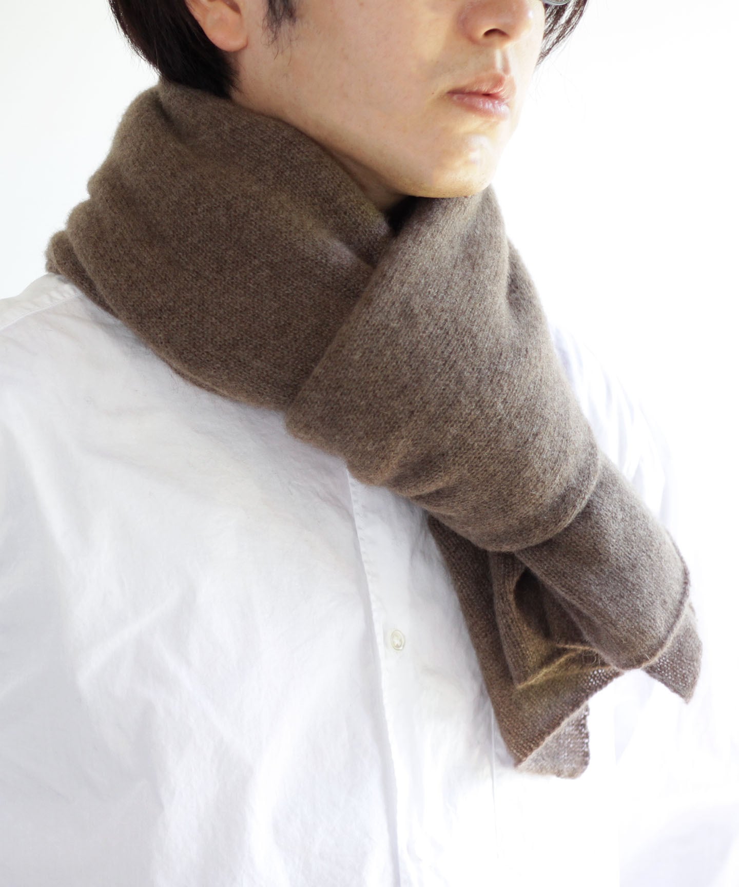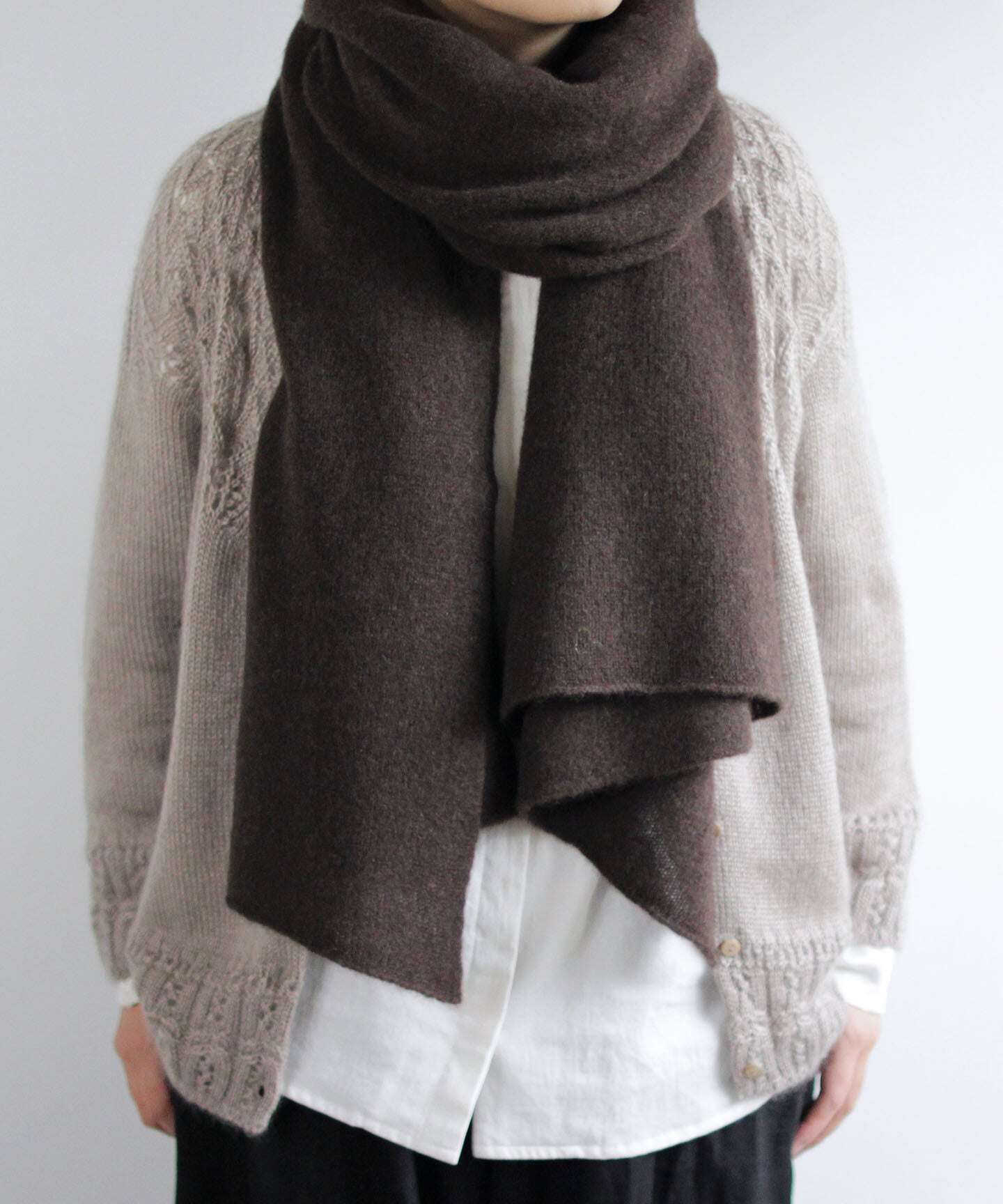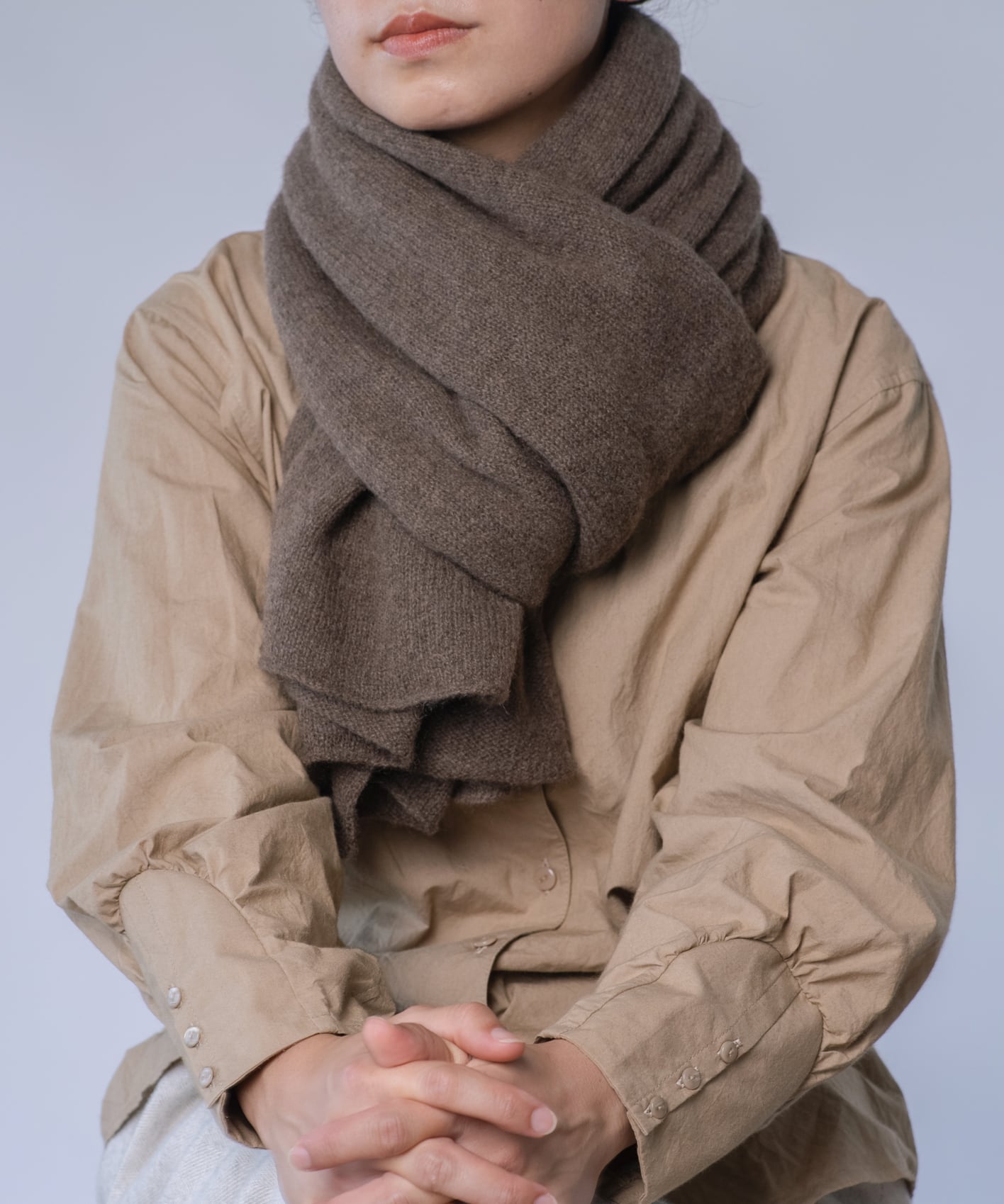 昔ながらの手編み機にて、人の手で編み機のキャリッジを動かして編んで作るストールです。編み機で編むときには、糸を張るテンションと、編地を下に引っ張るテンションが非常に大事です。それを人の手と目で具合を見ながら優しく編み、私たち独自の加工方法により、非常に軽く柔らかく暖かいストールができました。