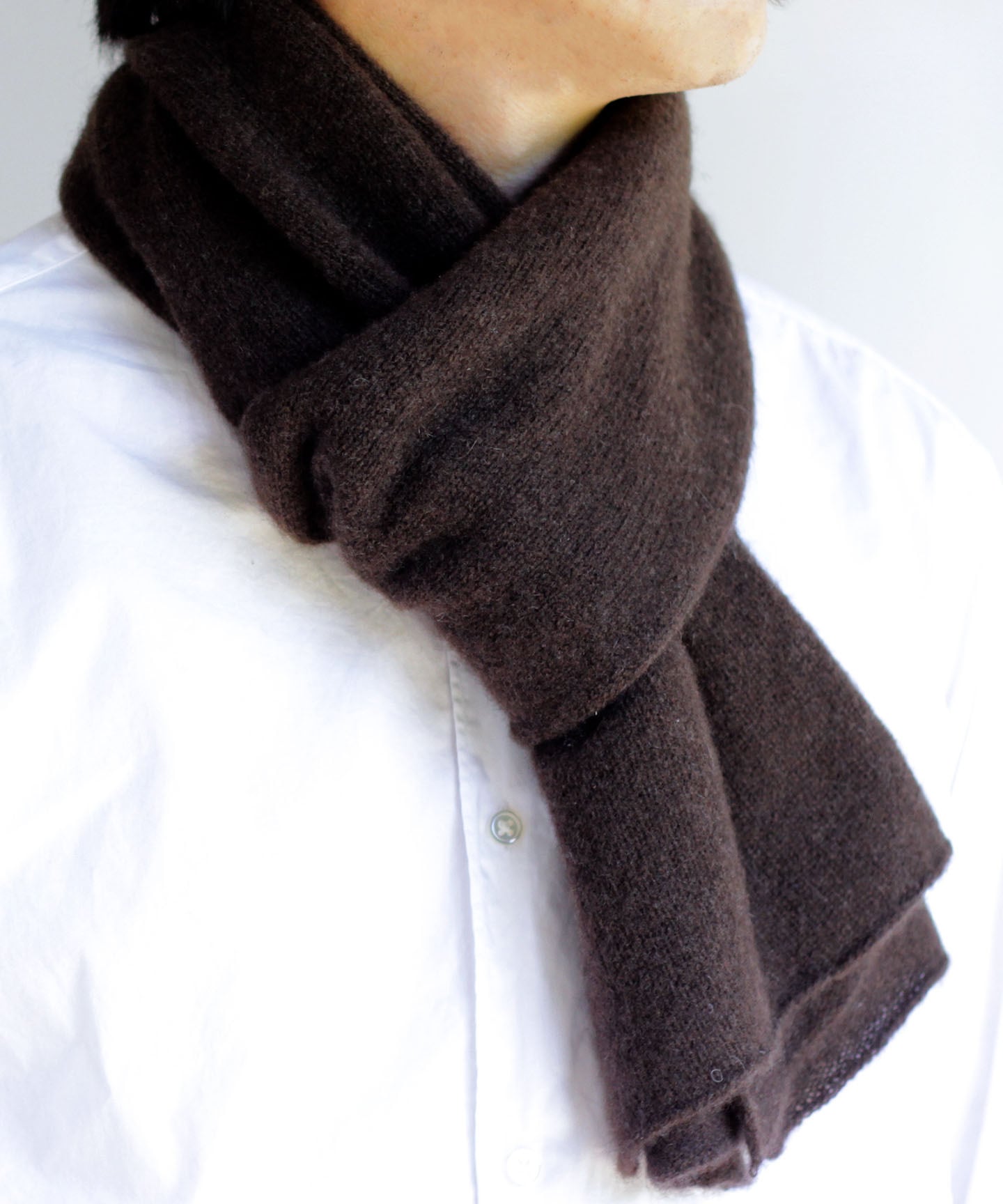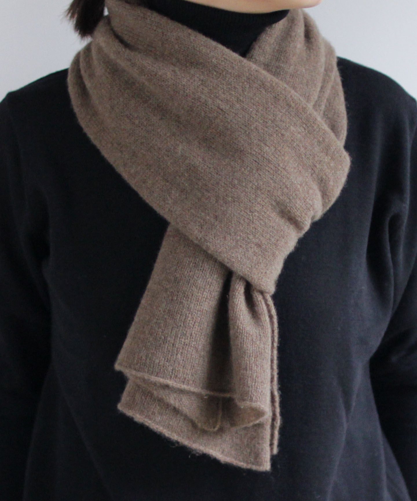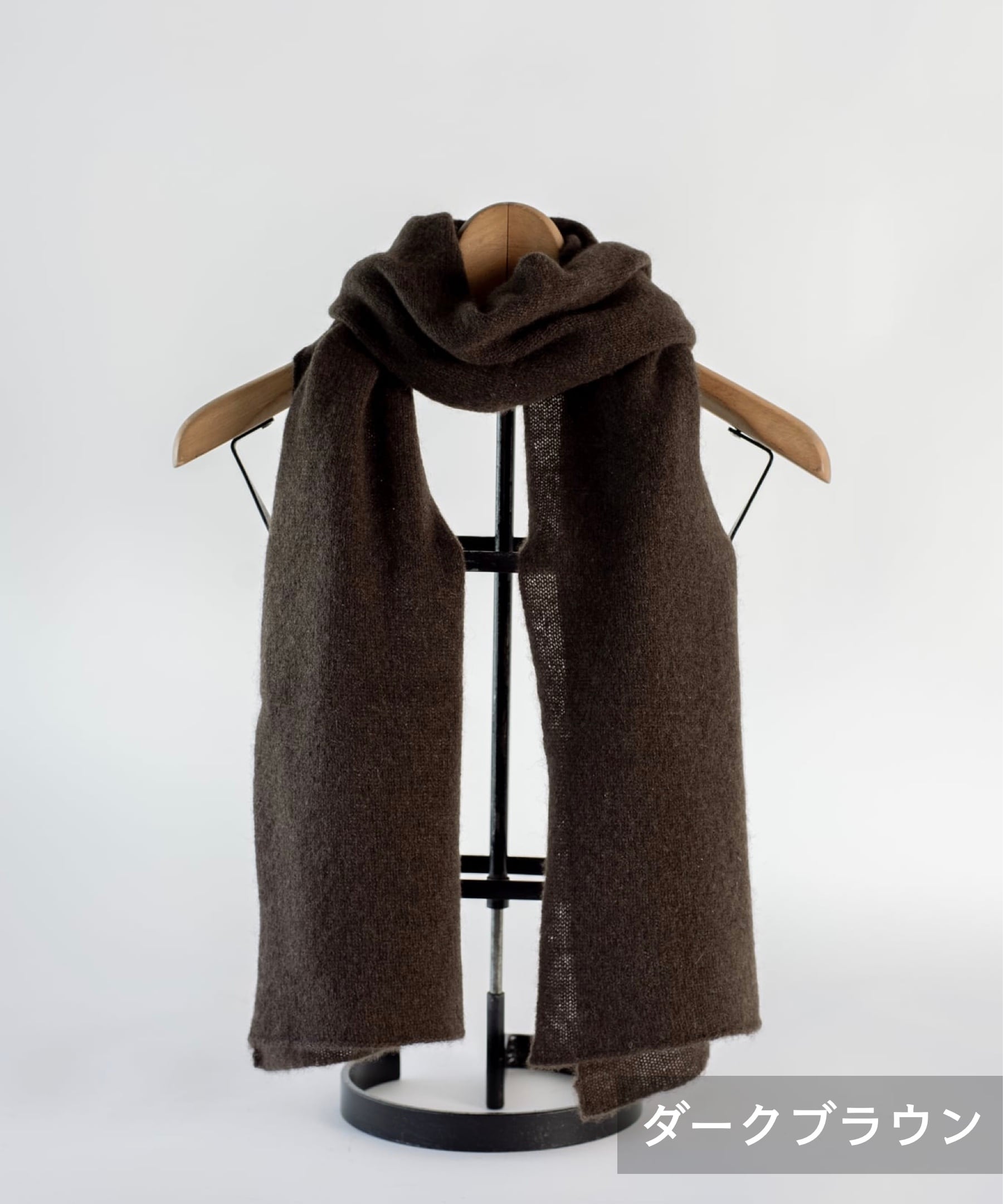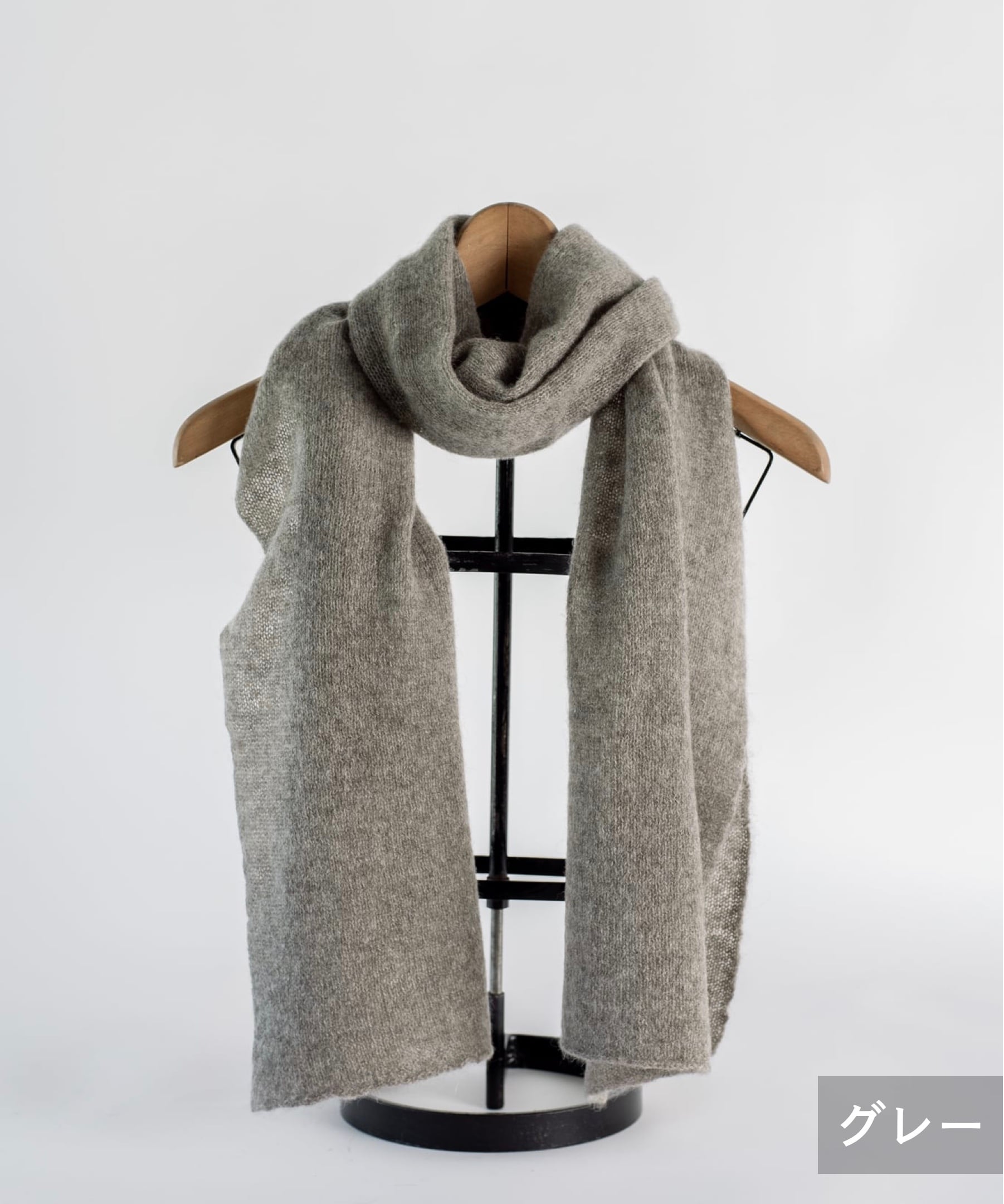 昔ながらの手編み機で、人の手で編み機のキャリッジを動かして編んで作るストールです。編み機で編むときには、糸を張るテンションと、編地を下に引っ張るテンションが非常に大事です。それを人の手と目で具合を見ながら優しく編み、私たち独自の加工方法により、軽く柔らかく暖かいストールができました。