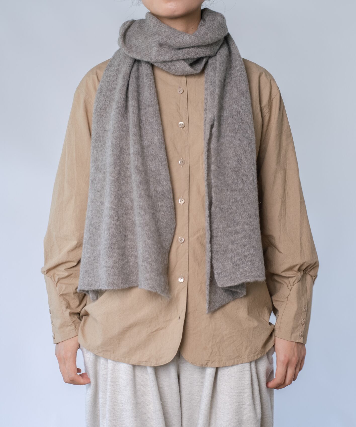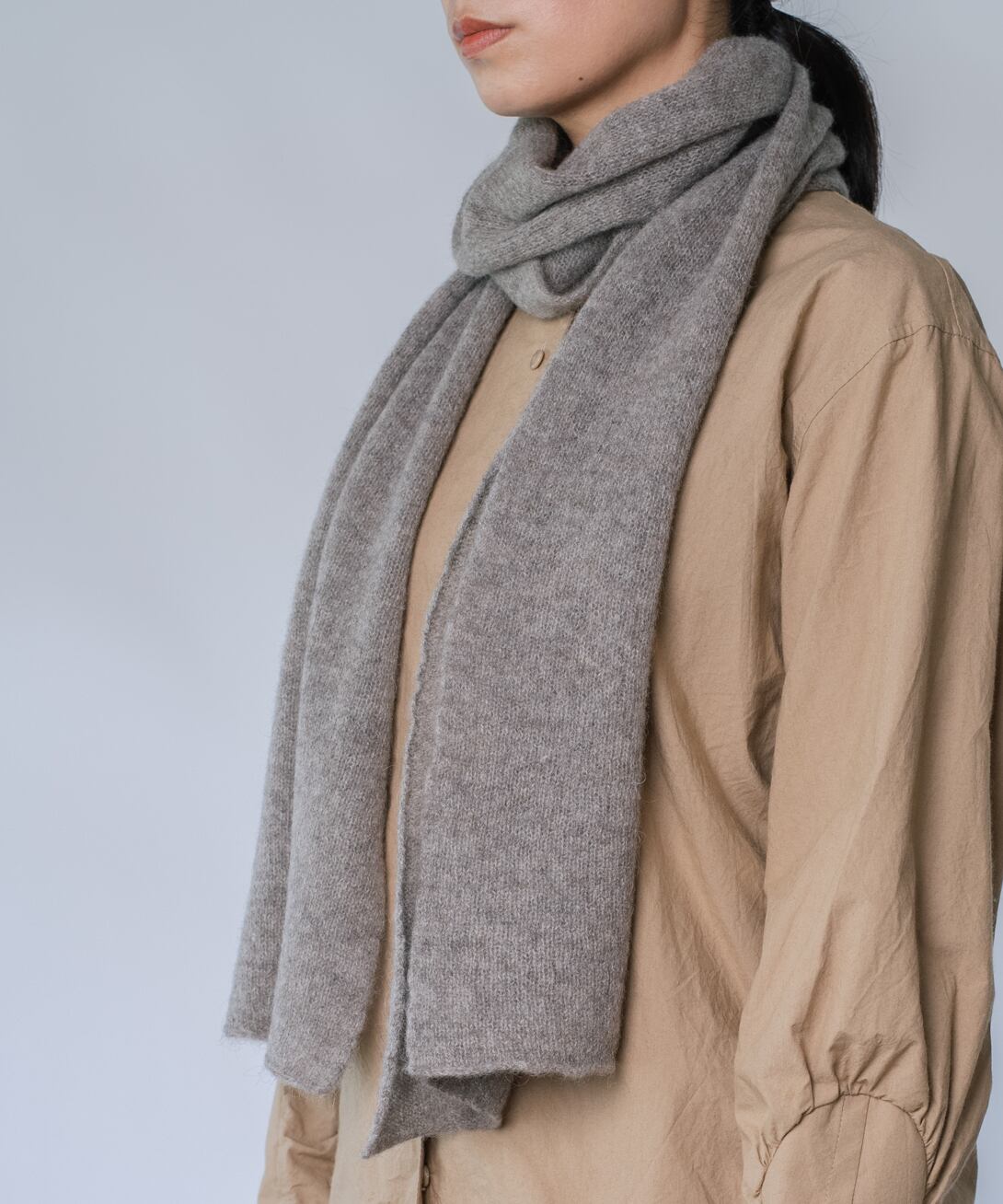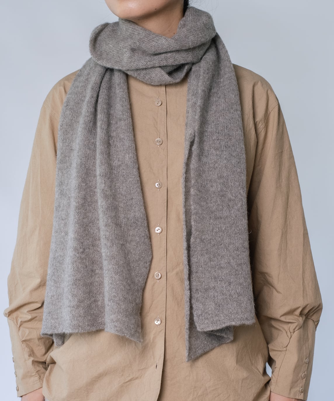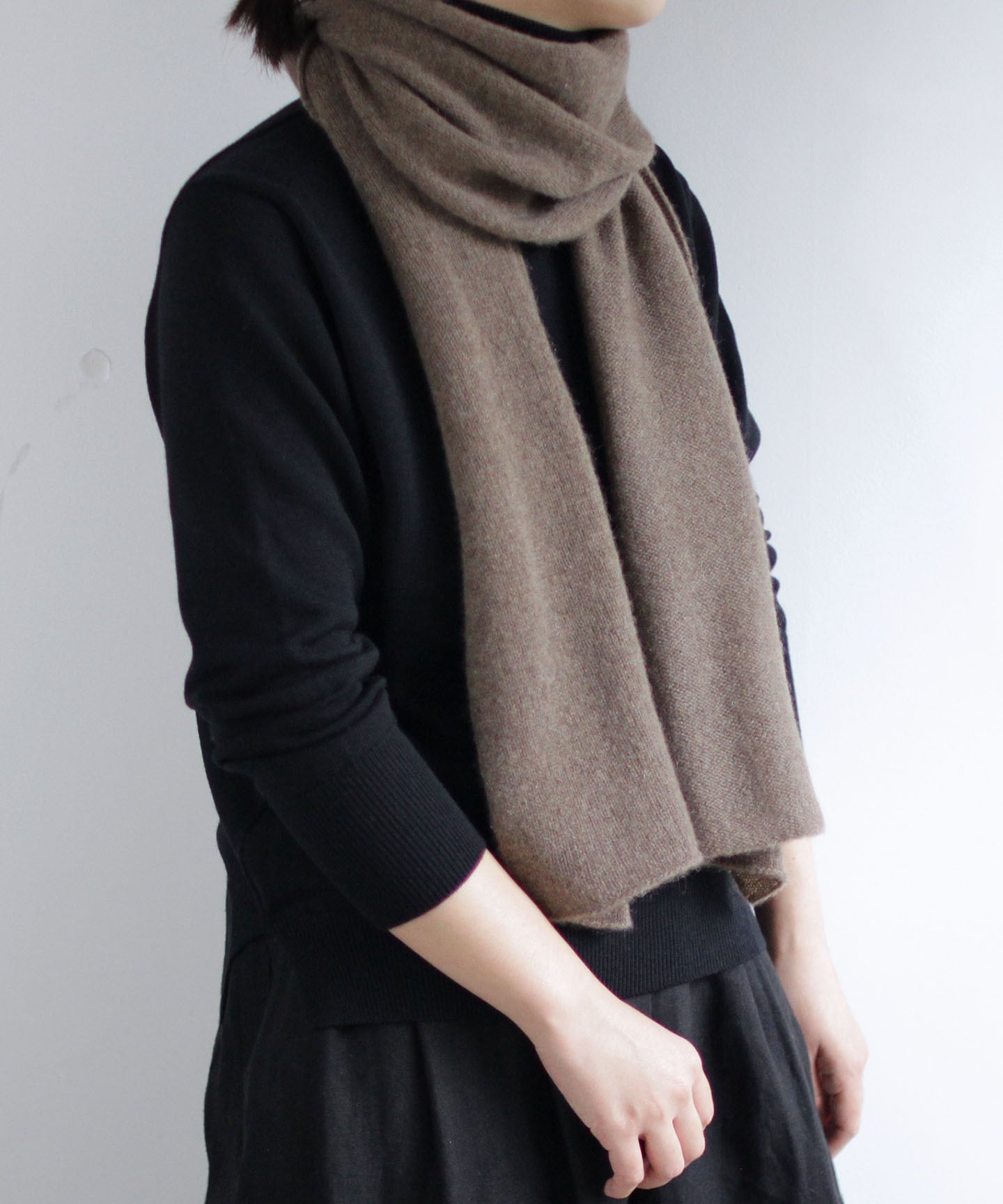 昔ながらの手編み機で、人の手で編み機のキャリッジを動かして編んで作るストールです。編み機で編むときには、糸を張るテンションと、編地を下に引っ張るテンションが非常に大事です。それを人の手と目で具合を見ながら優しく編み、私たち独自の加工方法により、軽く柔らかく暖かいストールができました。