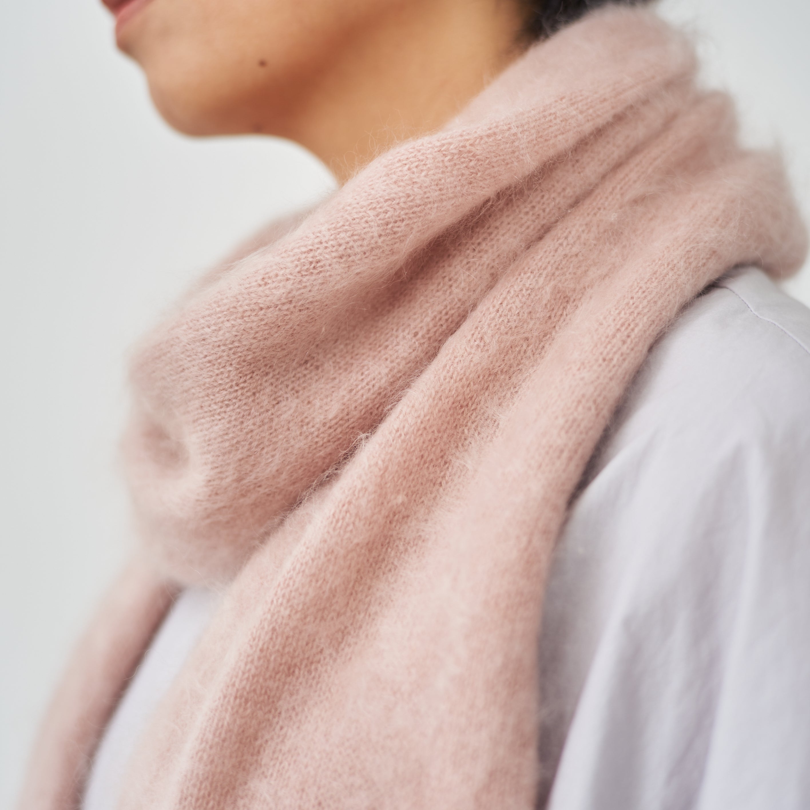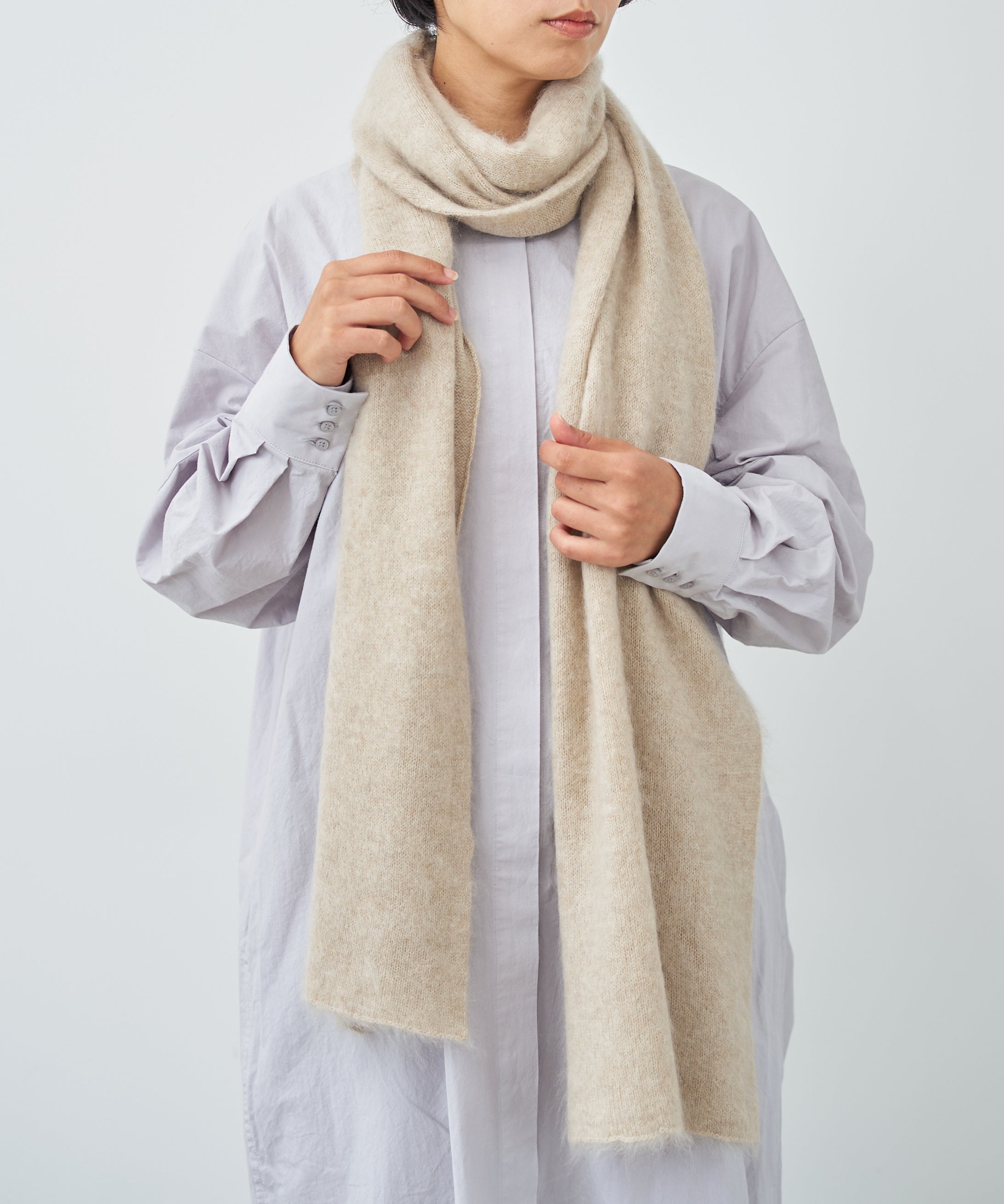 大事です。それを人の手と目で具合を見ながら優しく編むことによって、非常に軽く柔らかく暖かいスヌードができました。