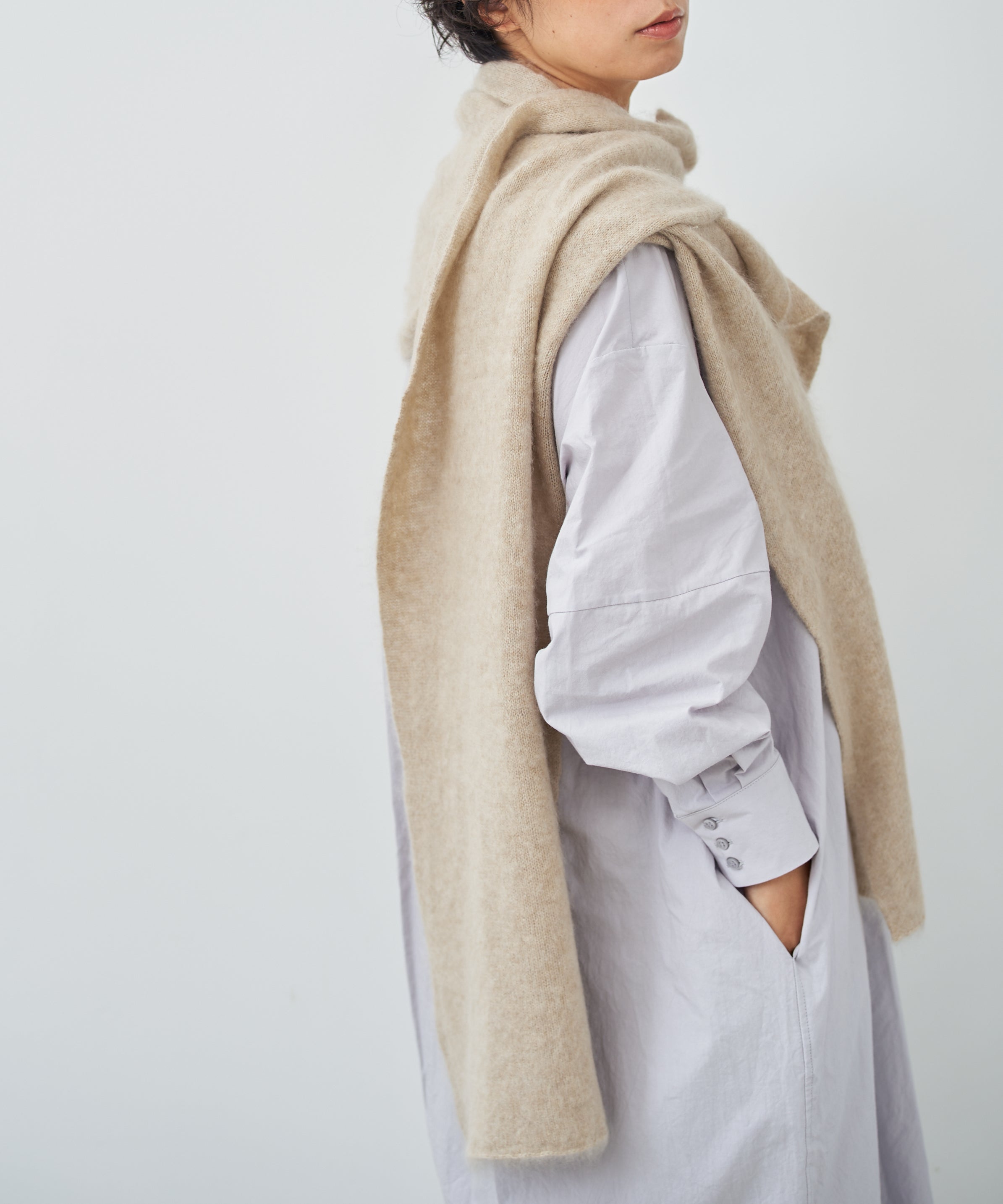 ・洗ったら軽く脱水をして、日陰で干してください。吊るして干すとストールの丈が長く伸びてしまう場合がありますが、垂直方向に軽く引っ張ることである程度寸法が戻ります。