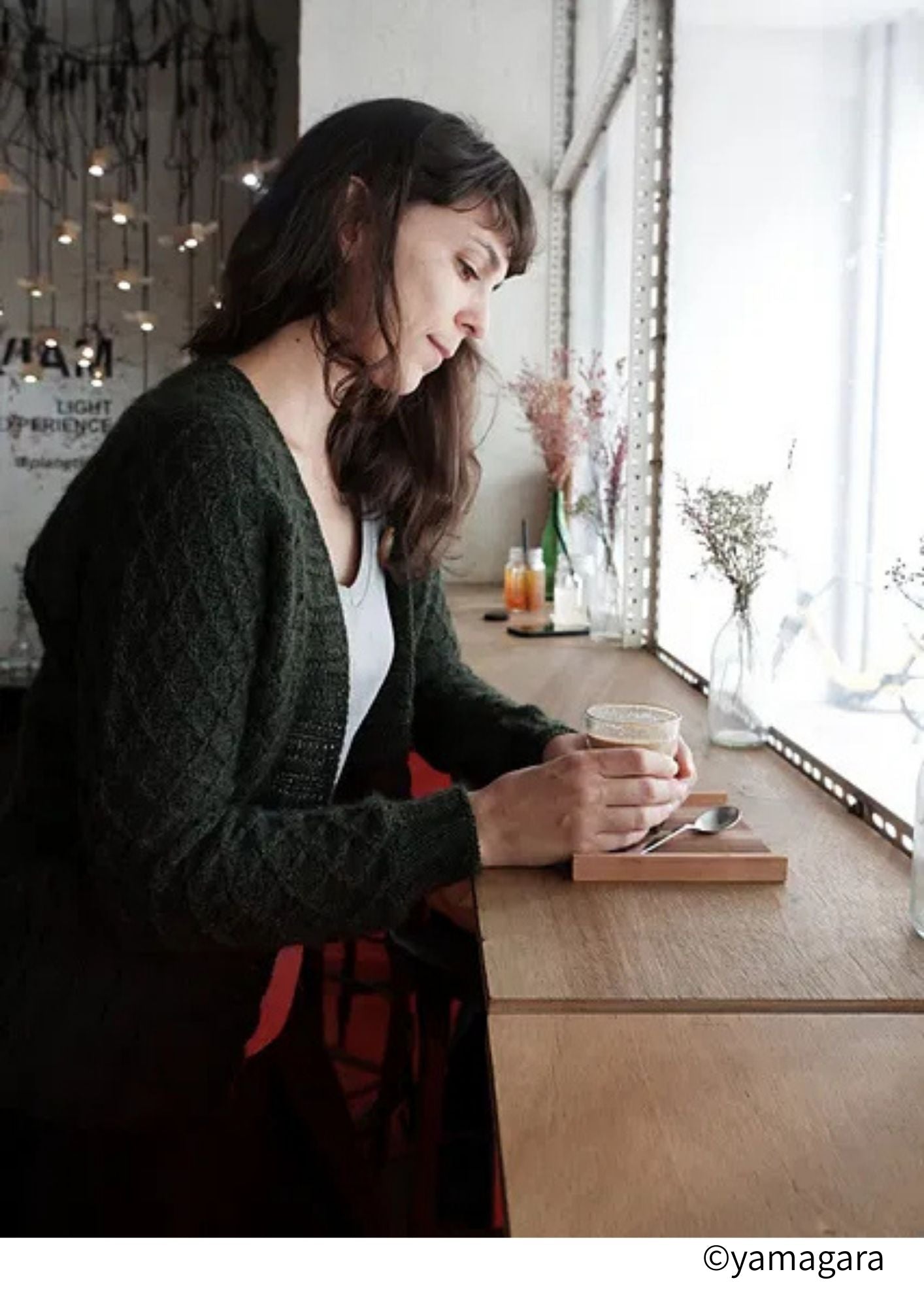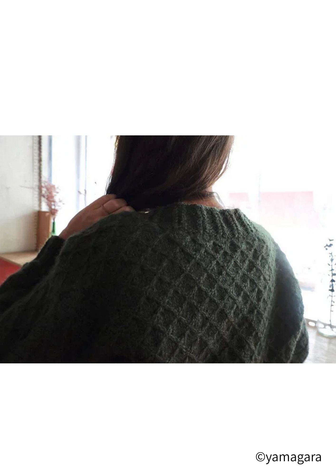 Jujiseiは裾と袖口に施した長いゴム編みと, 身頃・幅広の袖全体に渡る格子のレース模様を 組み合わせています. ドルマンスリーブには格子のレース模様が途 切れることなく続き, その形は優しさ, 柔らか さをより一層引き立てています. また, 襟と前立て部分のゴム編み (braided ribbing)がこのカーディガンを上 品に仕上げています