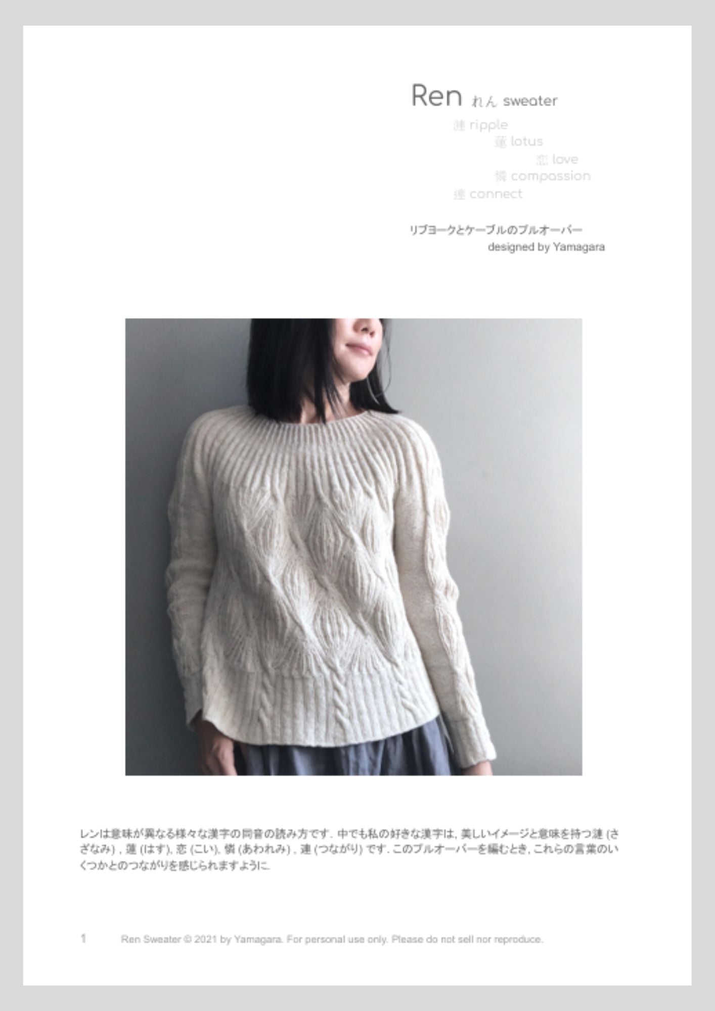 レンは意味が異なる様々な漢字の同音の読み方です. 中でも私の好きな漢字は, 美しいイメージと意味を持つ漣 (さざなみ) , 蓮 (はす), 恋 (こい), 憐 (あわれみ) , 連 (つながり) です. このプルオーバーを編むとき, これらの言葉のいくつかとのつながりを感じられますように.とデザインしたアイテムです。