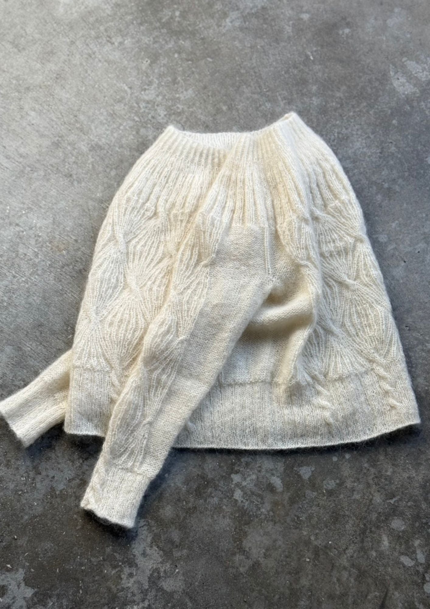 トップダウン式に編むセーターです. ヨークおよび模様内の増し目にはかけ目 (YO) と逆向きのかけ目 (RYO) を使います. 襟下がりはドイツ式引返し編みで作ります. 身頃と袖のリブケーブルの模様はチャートを見て編みます。