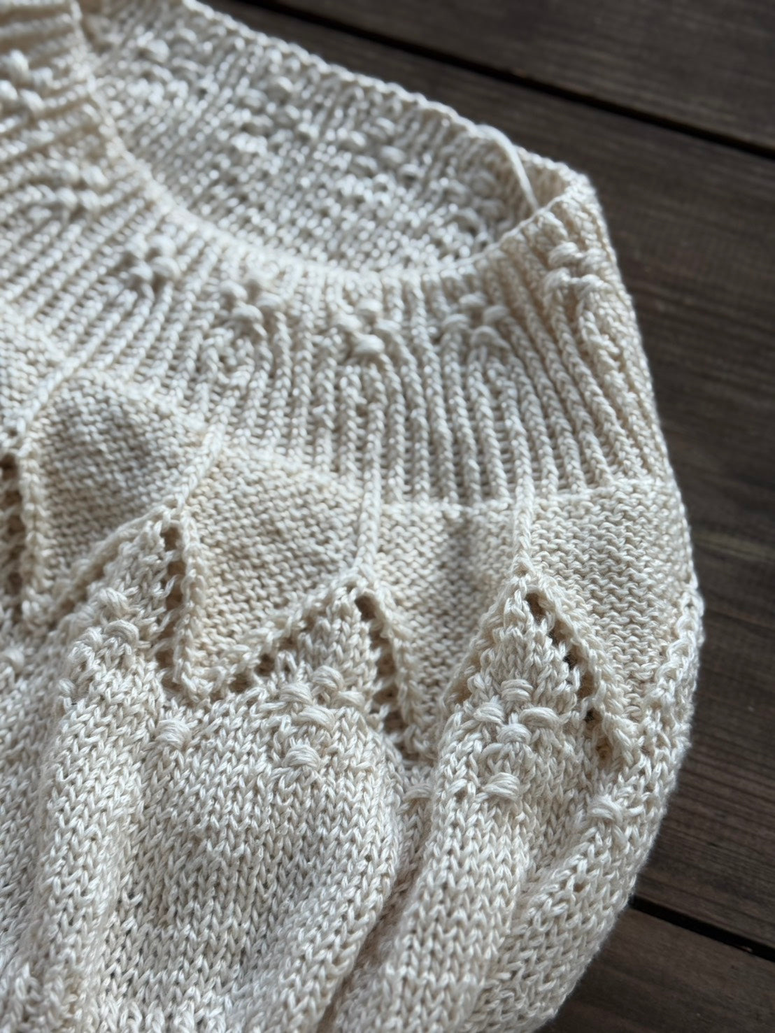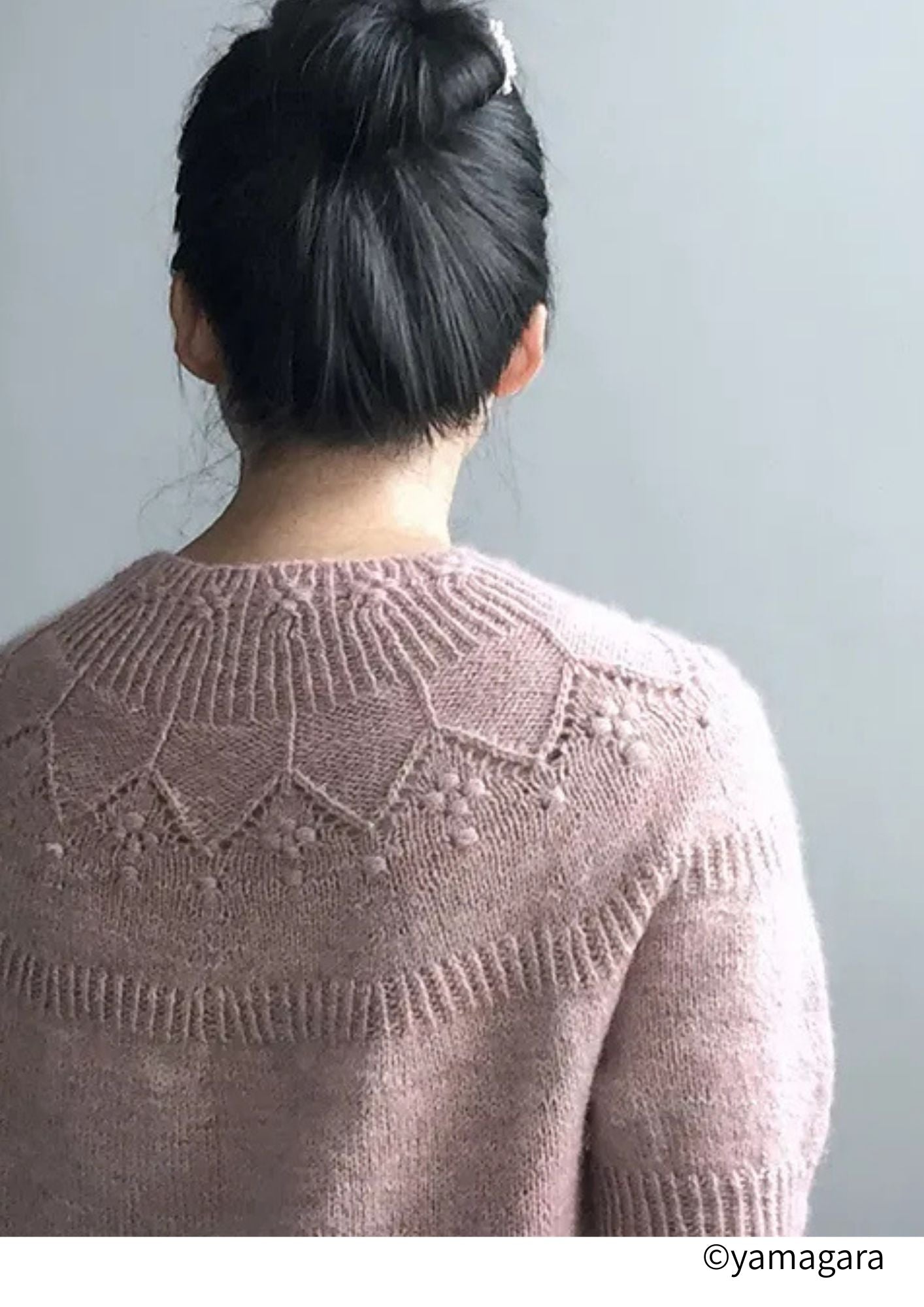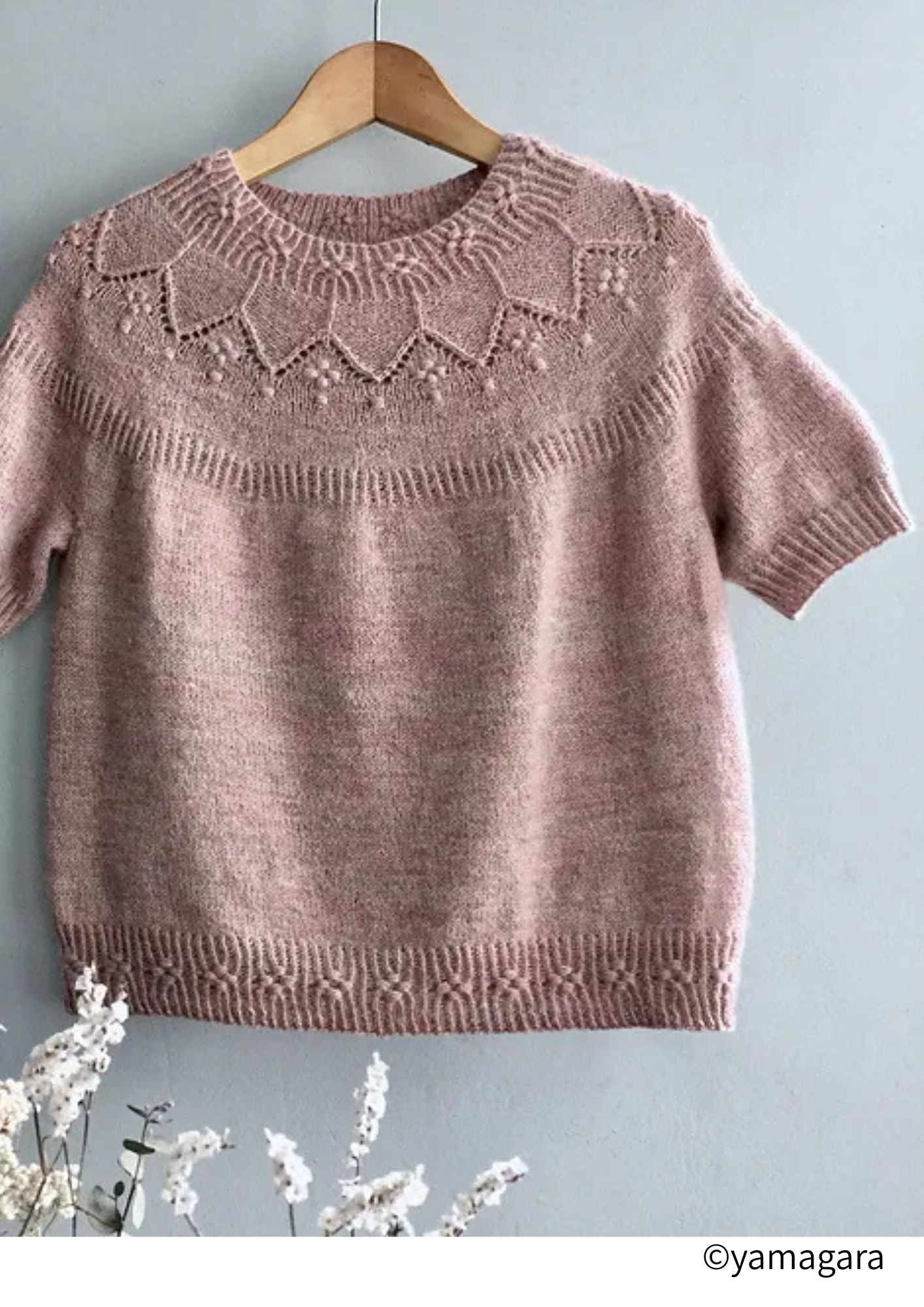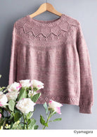 シンプルなレース模様とノット編みのポブルが印象的な、丸ヨークのセーターです。