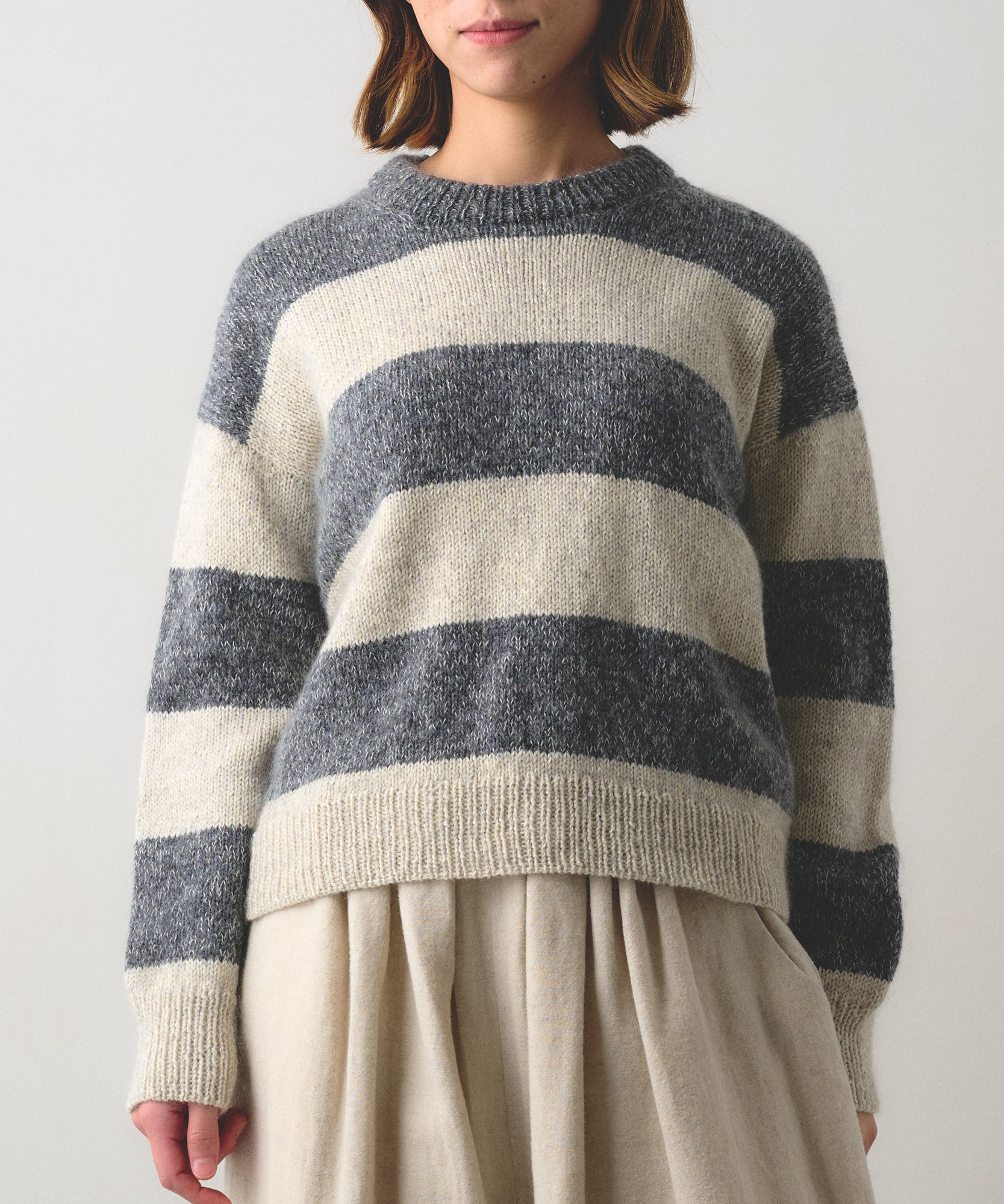 JENNA SWEATERは軽快なピッチで繰り返されるストライプを2色で仕上げるセーターです。細めから極太まであるストライプから好みのタイプを選んで作ります。