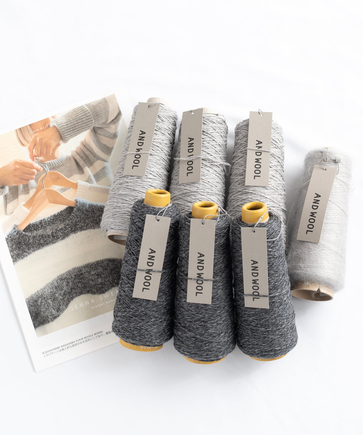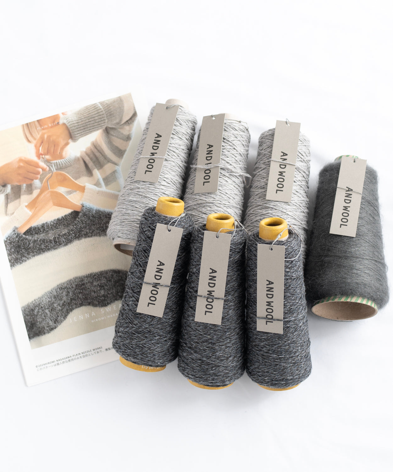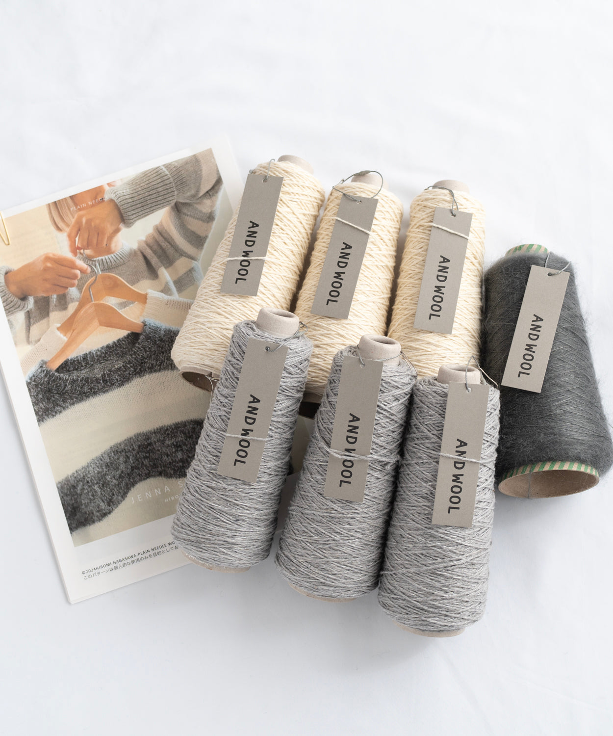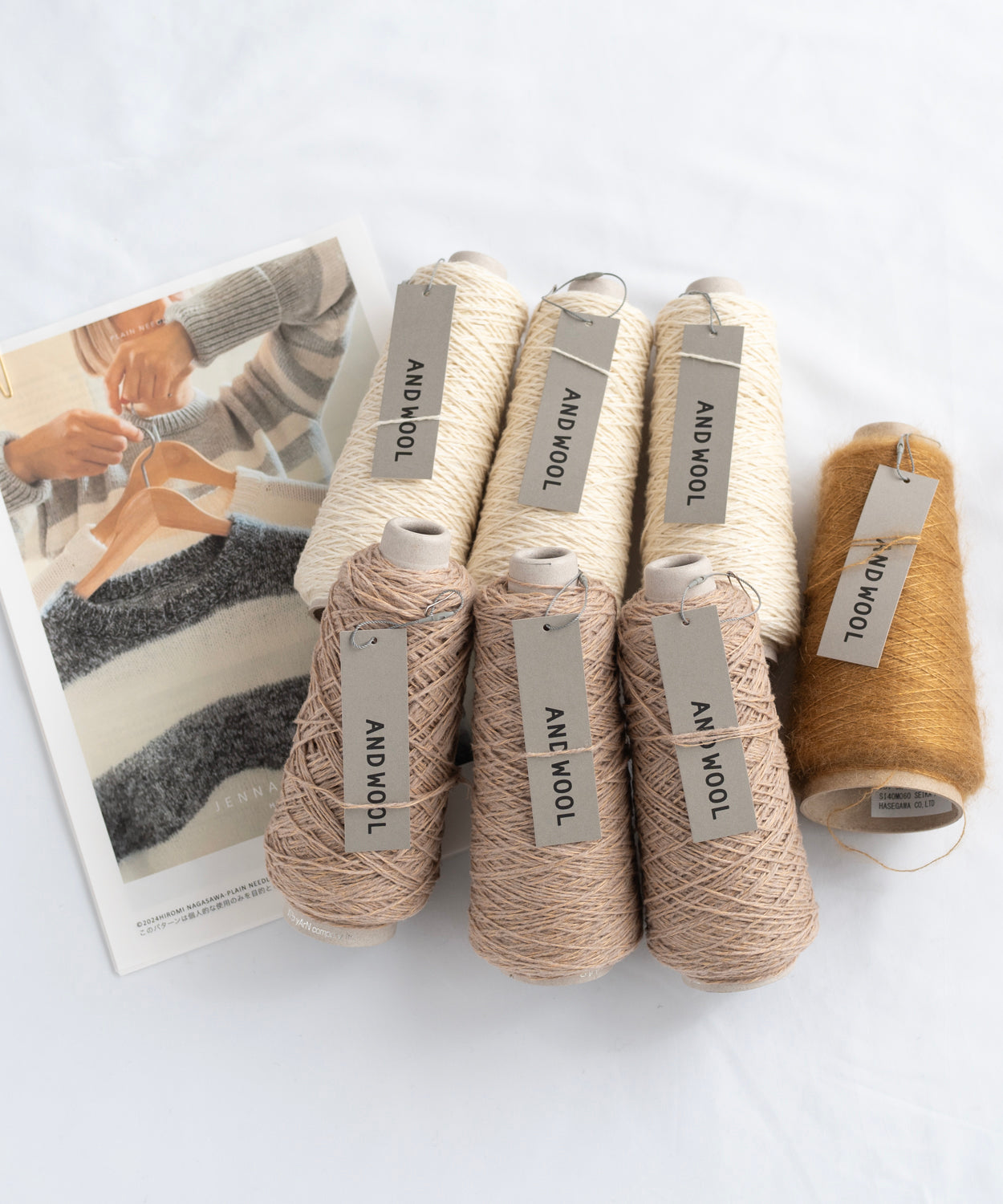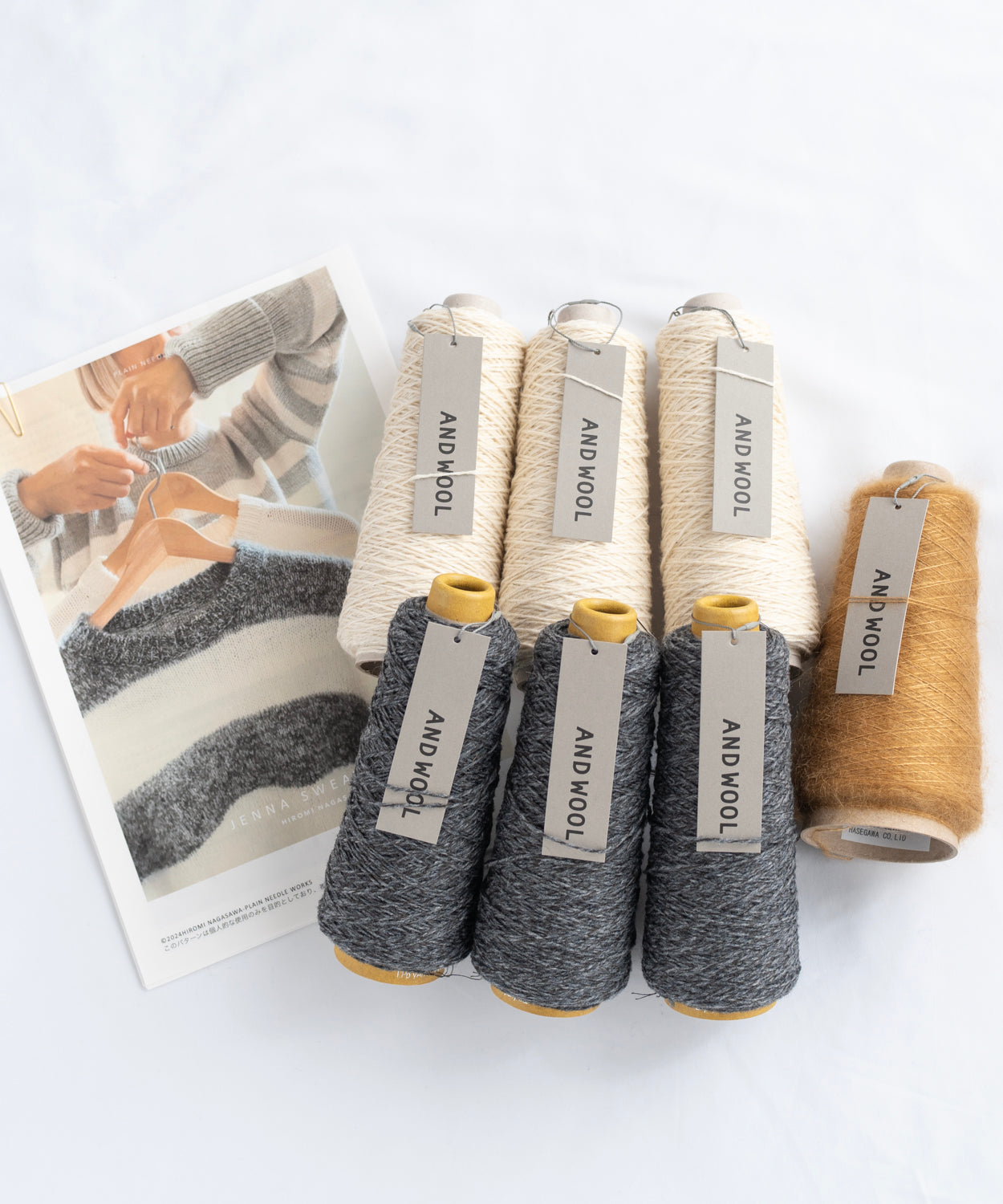ANDWOOLのおススメ糸 【NO.33ジャパンウールリネン糸(MC色用:100g・約250m✕3個入り約750m・CC色用:100g・約250m✕3個入り約750m)】と【NO.31シルクモヘヤ糸(100g・約1200m✕1個)】の着分糸セットです。(サイズ3まで対応)