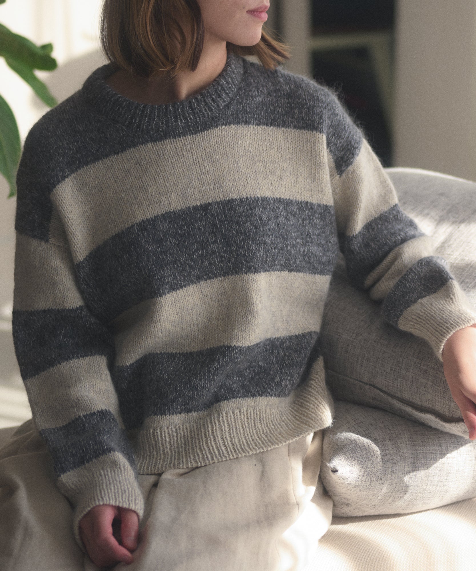 JENNA SWEATERは軽快なピッチで繰り返されるストライプを2色で仕上げるセーターです。細めから極太まであるストライプから好みのタイプを選んで作ります