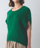 幅広のモックネック、重ね着を楽しめるゆとりと肩と体を繭のようにゆったりと包むシルエットでゆったりとしたサイズ感で、さっと編んでぱっと着られる、スカートにもパンツにも合わせやすい、気軽なベストです。
