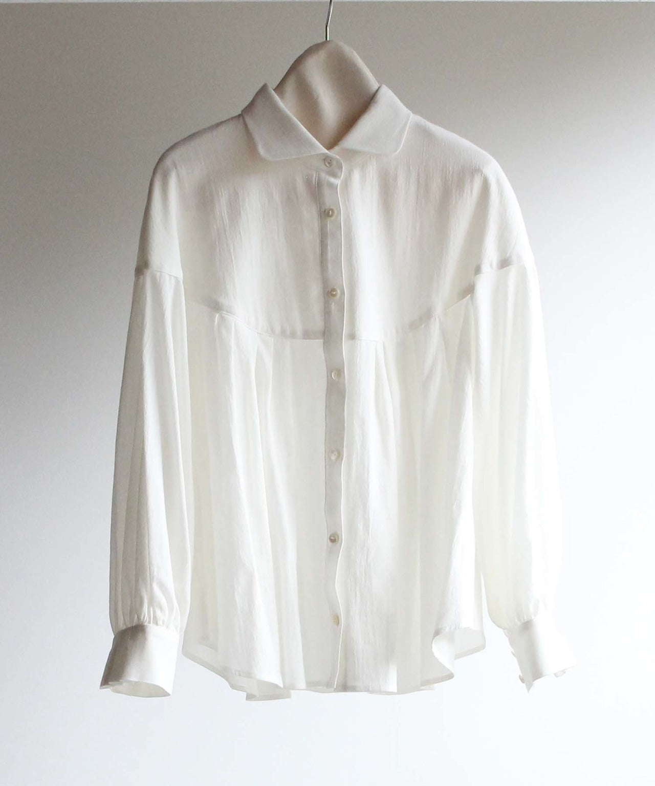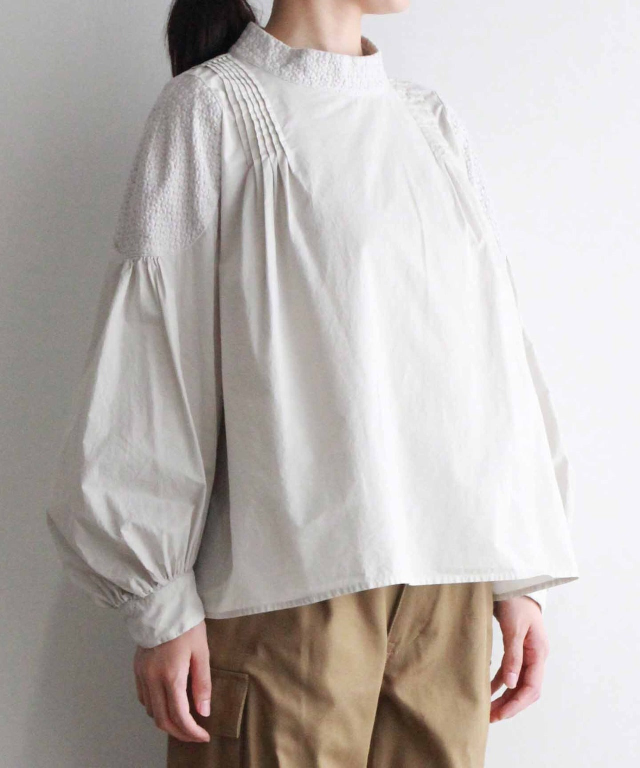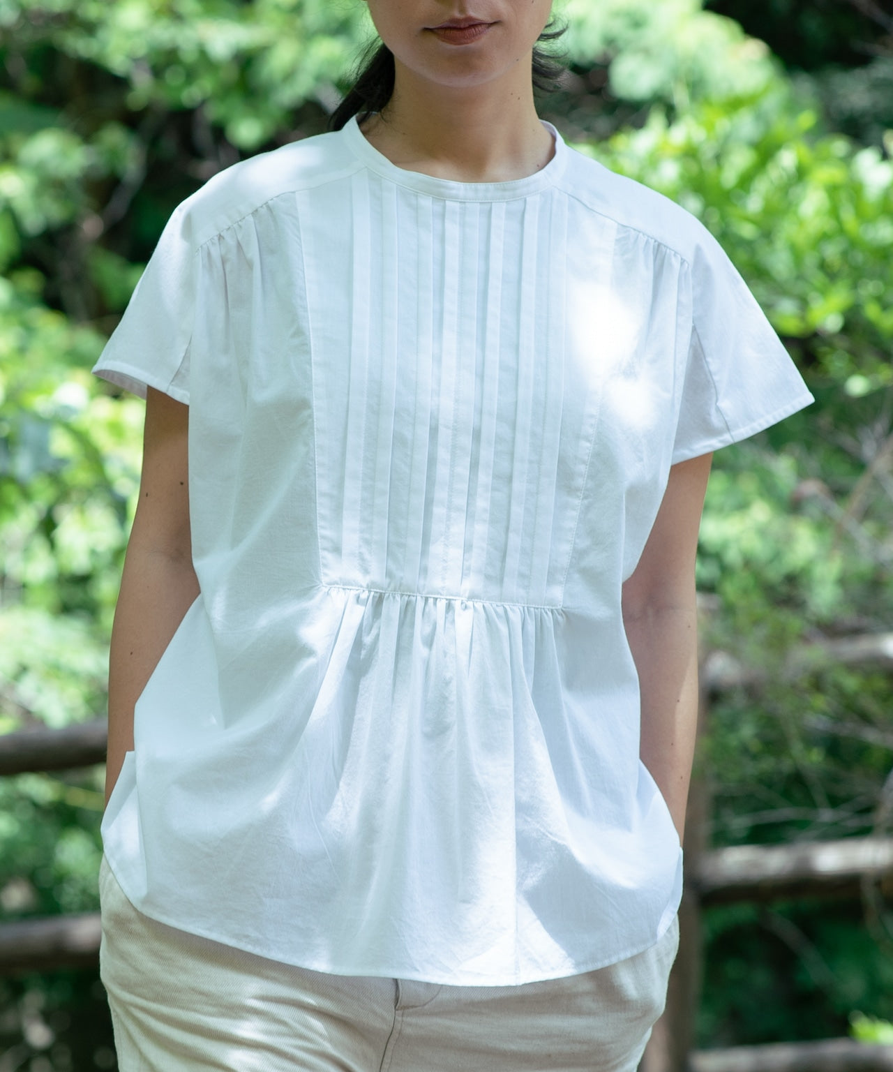〈コットン100%極細糸織りブロード生地〉小さめ衿ギャザー入りプリーツデザインブラウス (mue106)