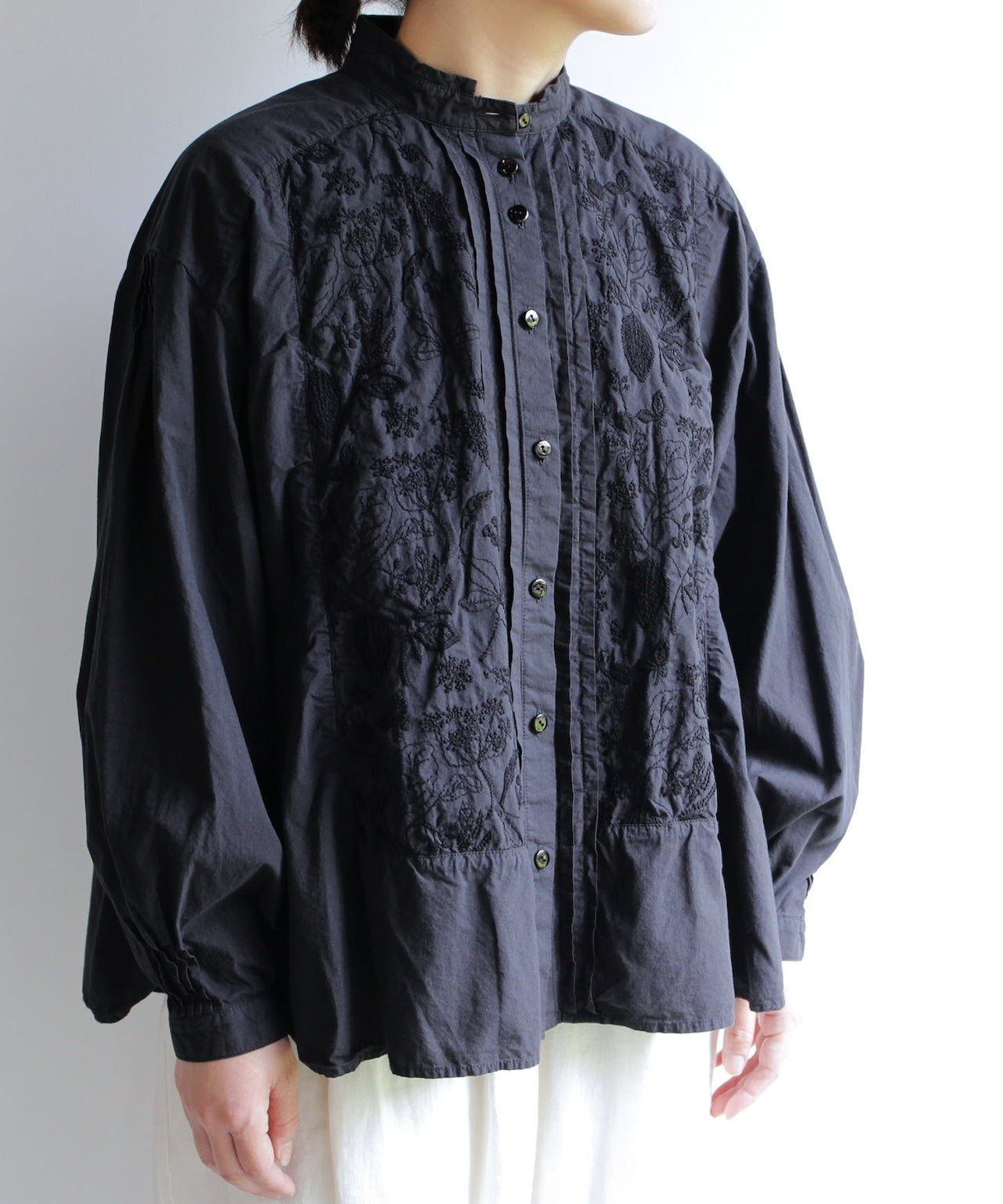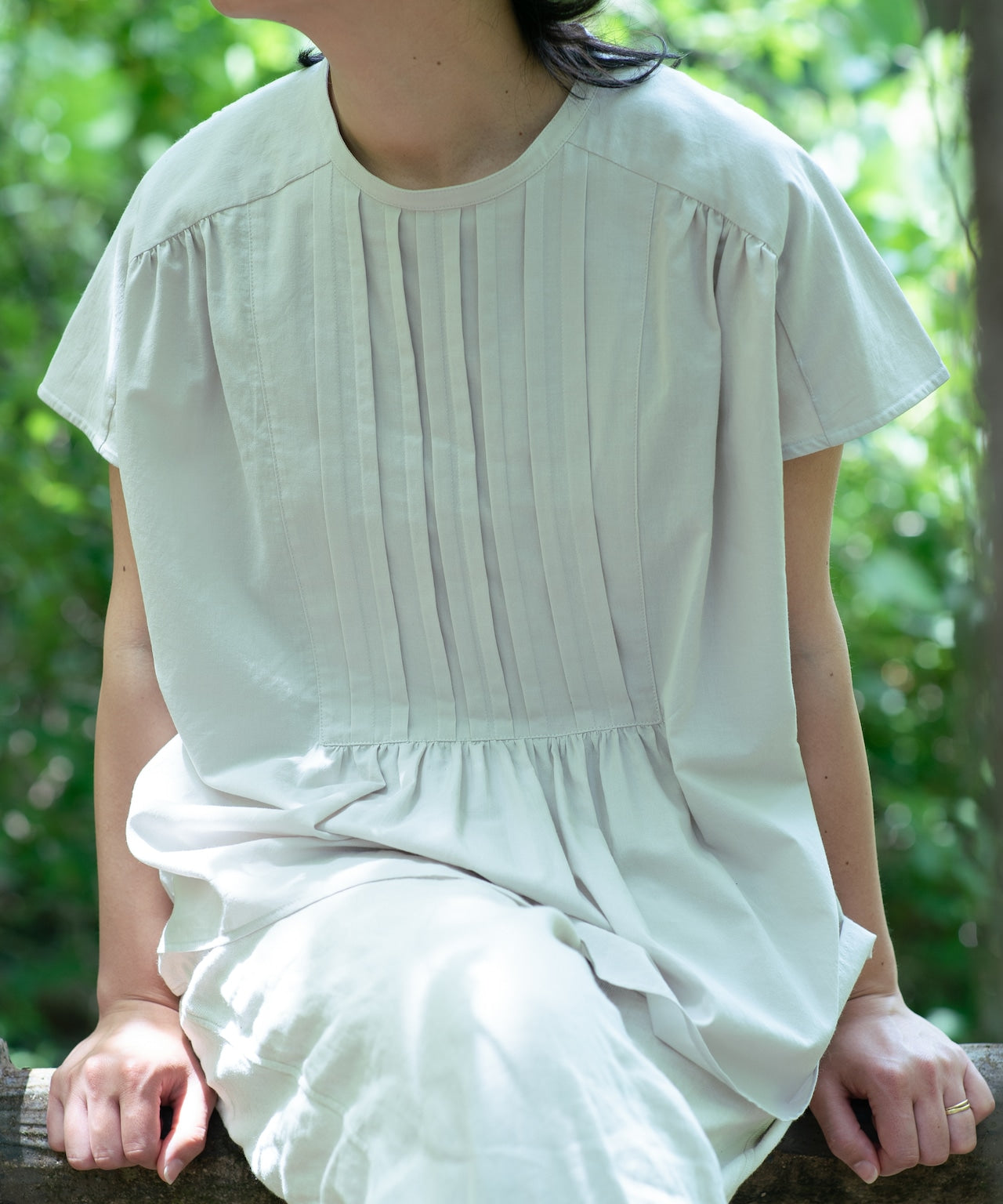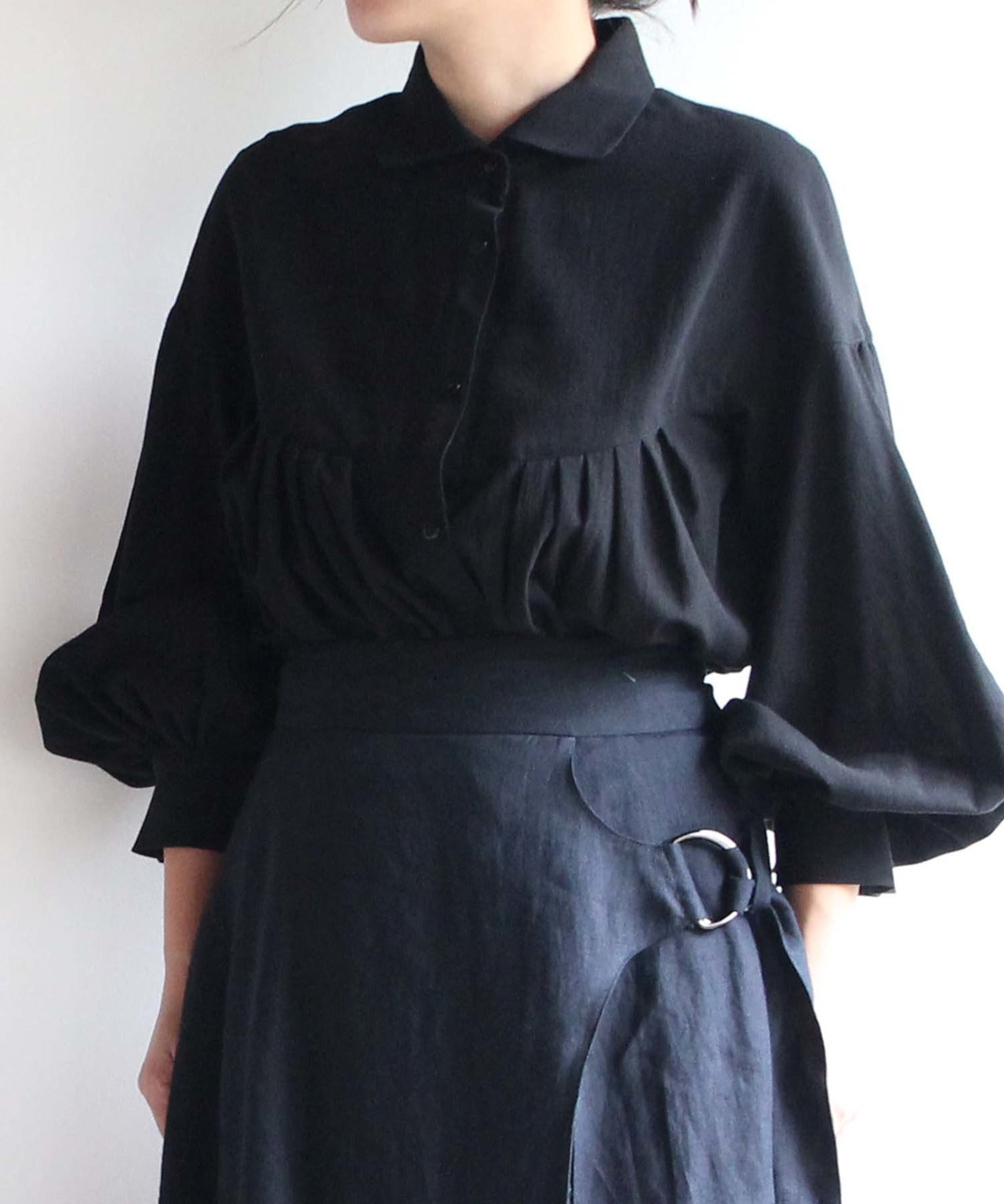 〈コットン100%極細糸織りブロード生地〉小さめ衿ギャザー入りプリーツデザインブラウス (mue106)