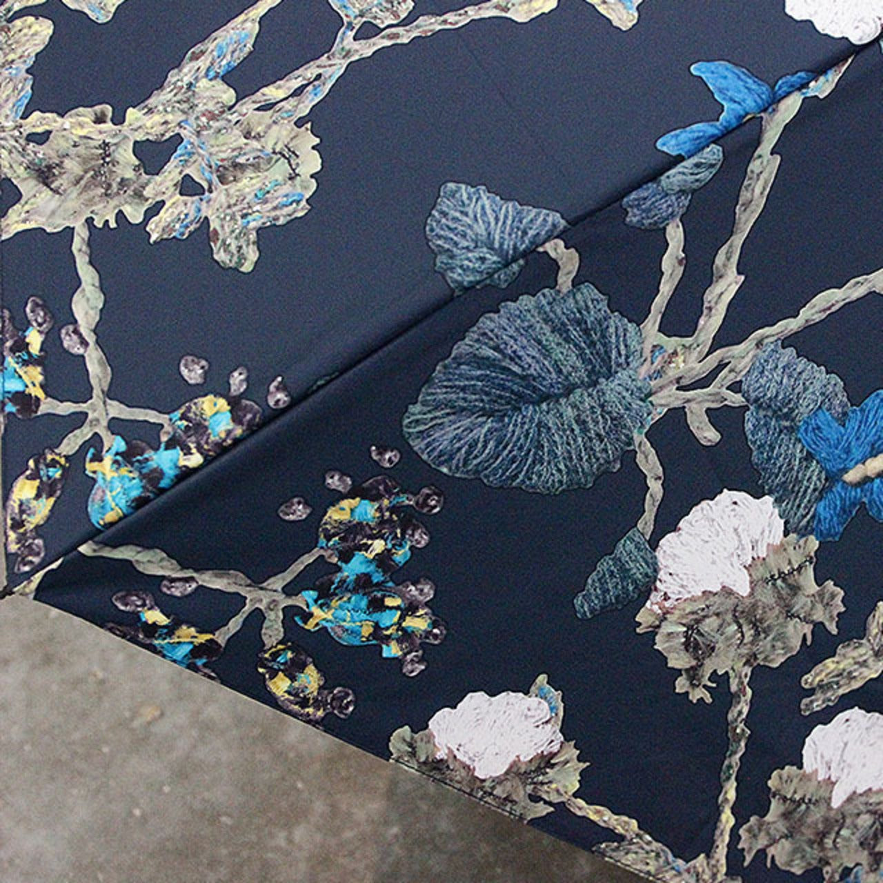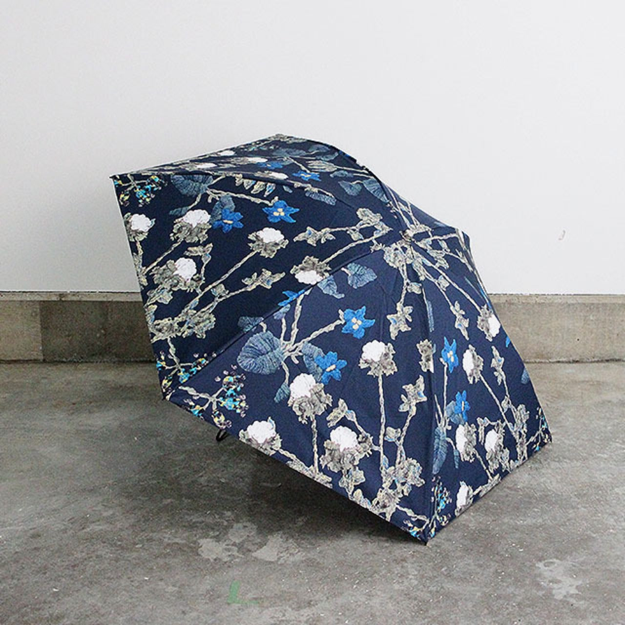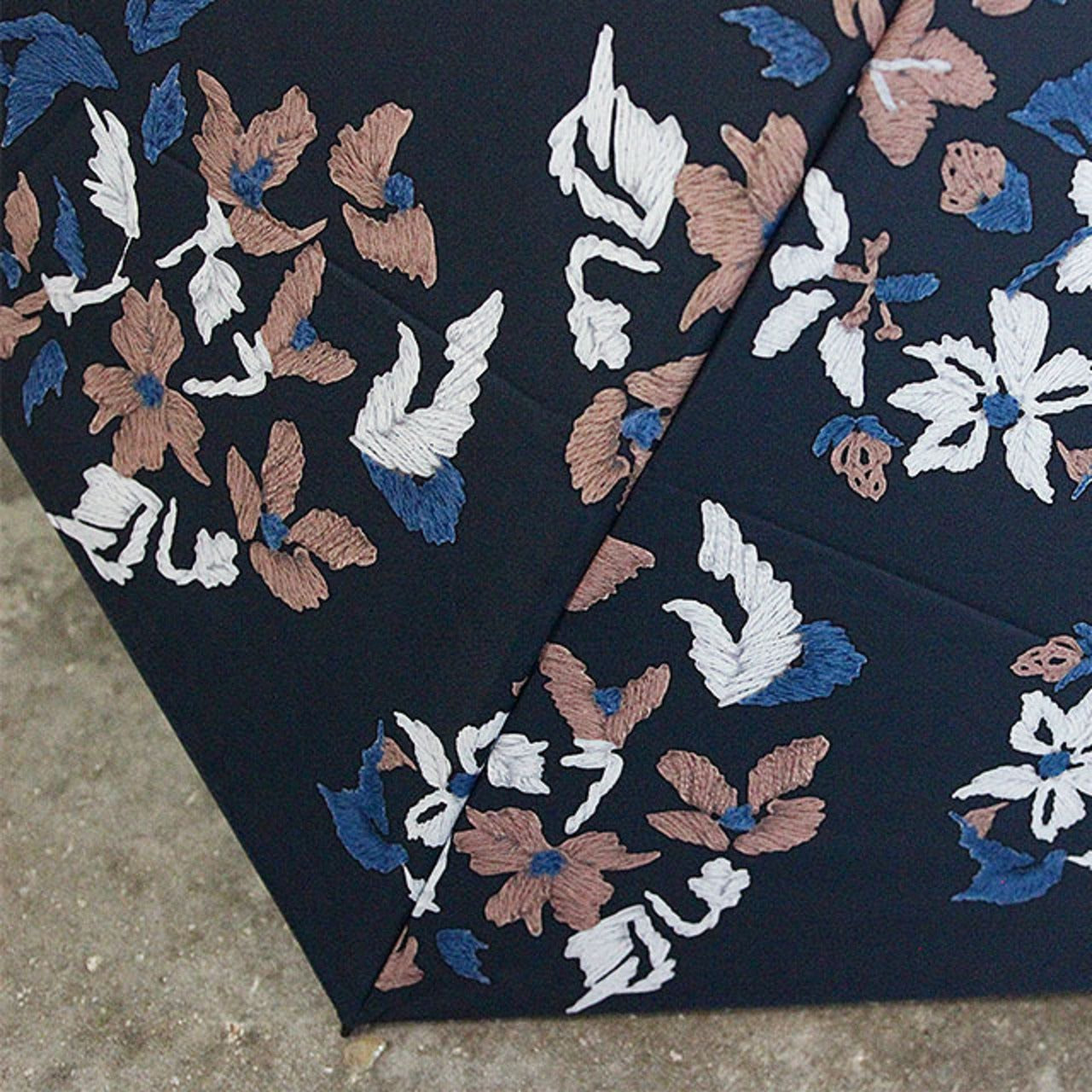 道草花刺繍柄をプリントした雨天兼用日傘(折りたたみ傘) ネイビー