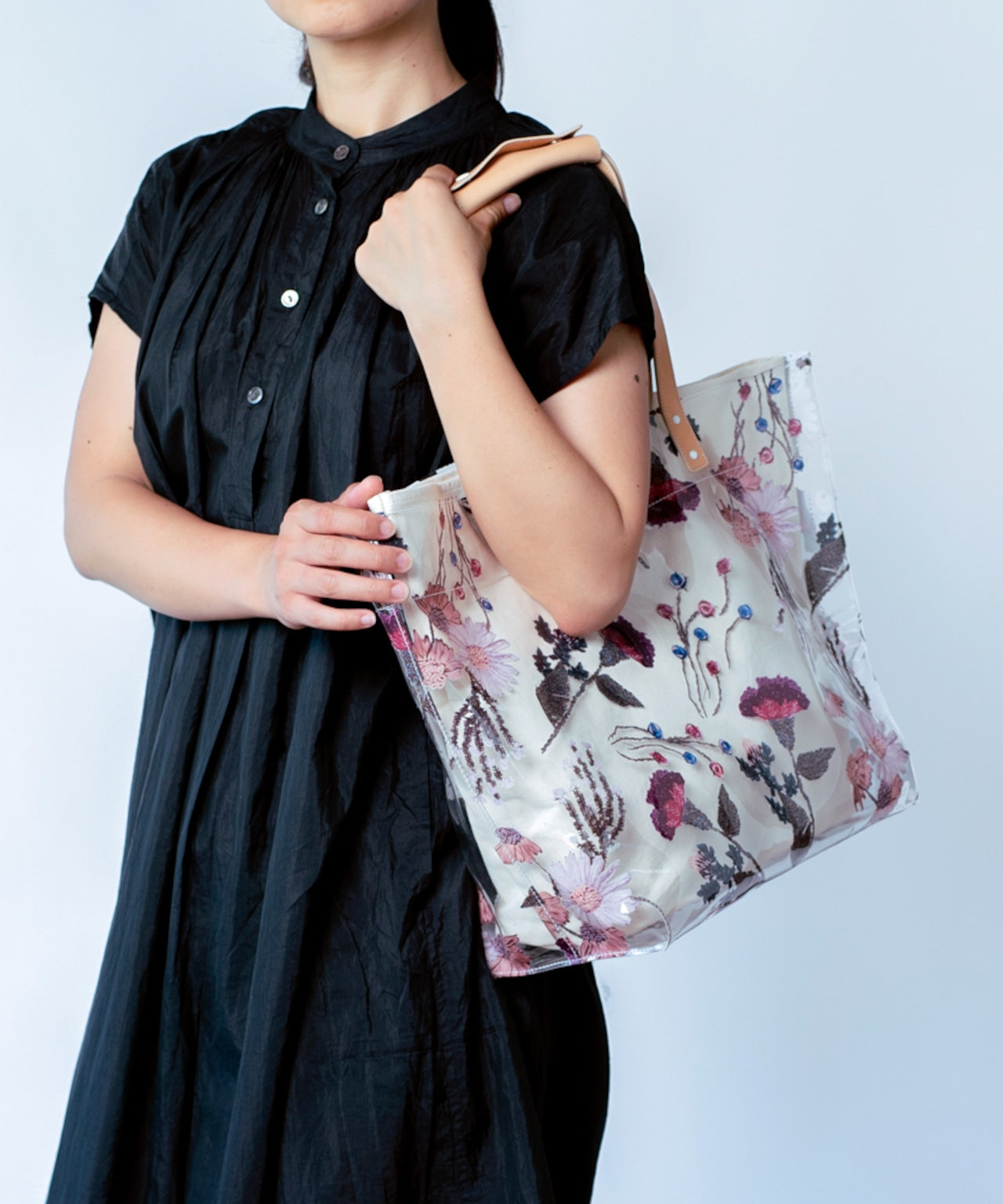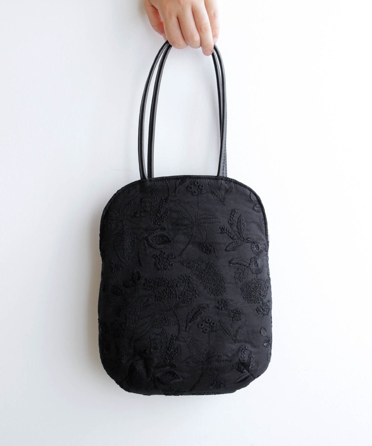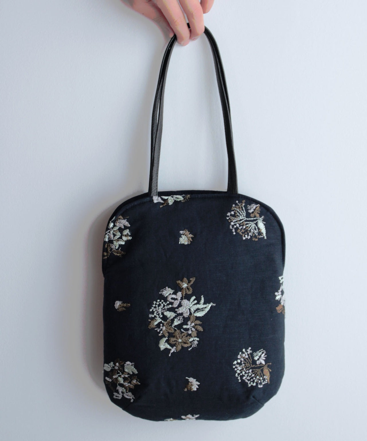 〈マチなしフラット〉〈長財布・ペットボトル可〉〈持ち手レザー〉フラワーノット刺繍 ミニサイズバッグ (bag012)