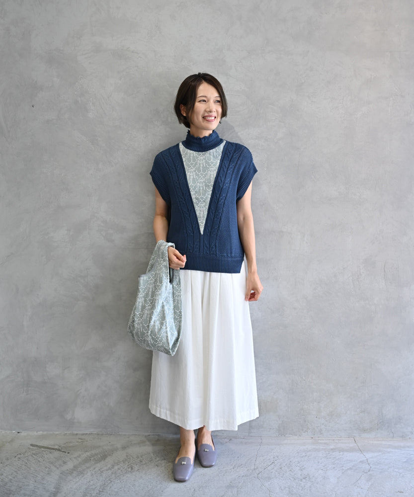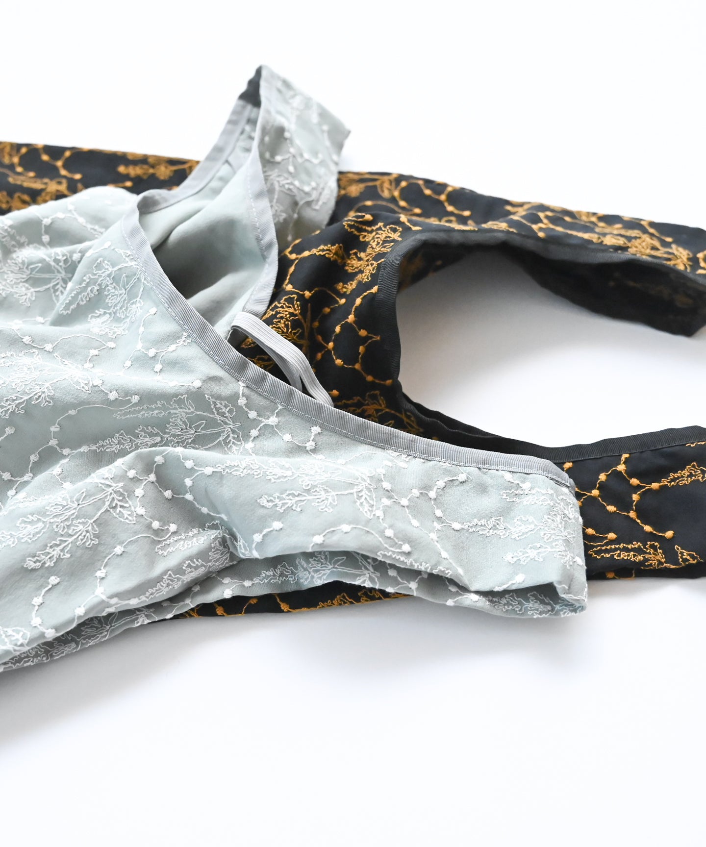 ドライタッチで軽く柔らかい薄手の繊細なコットンシフォン生地に、太番手のコットン刺繍糸で刺繍をすることで、より線が際立つデザインに仕上げました。