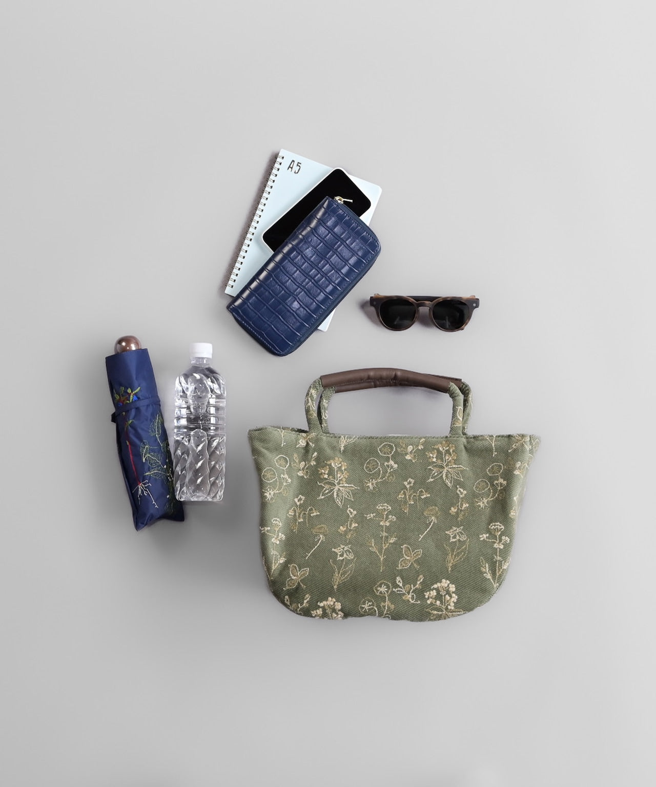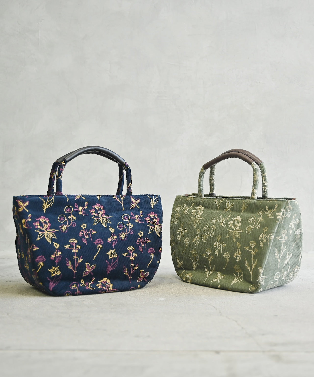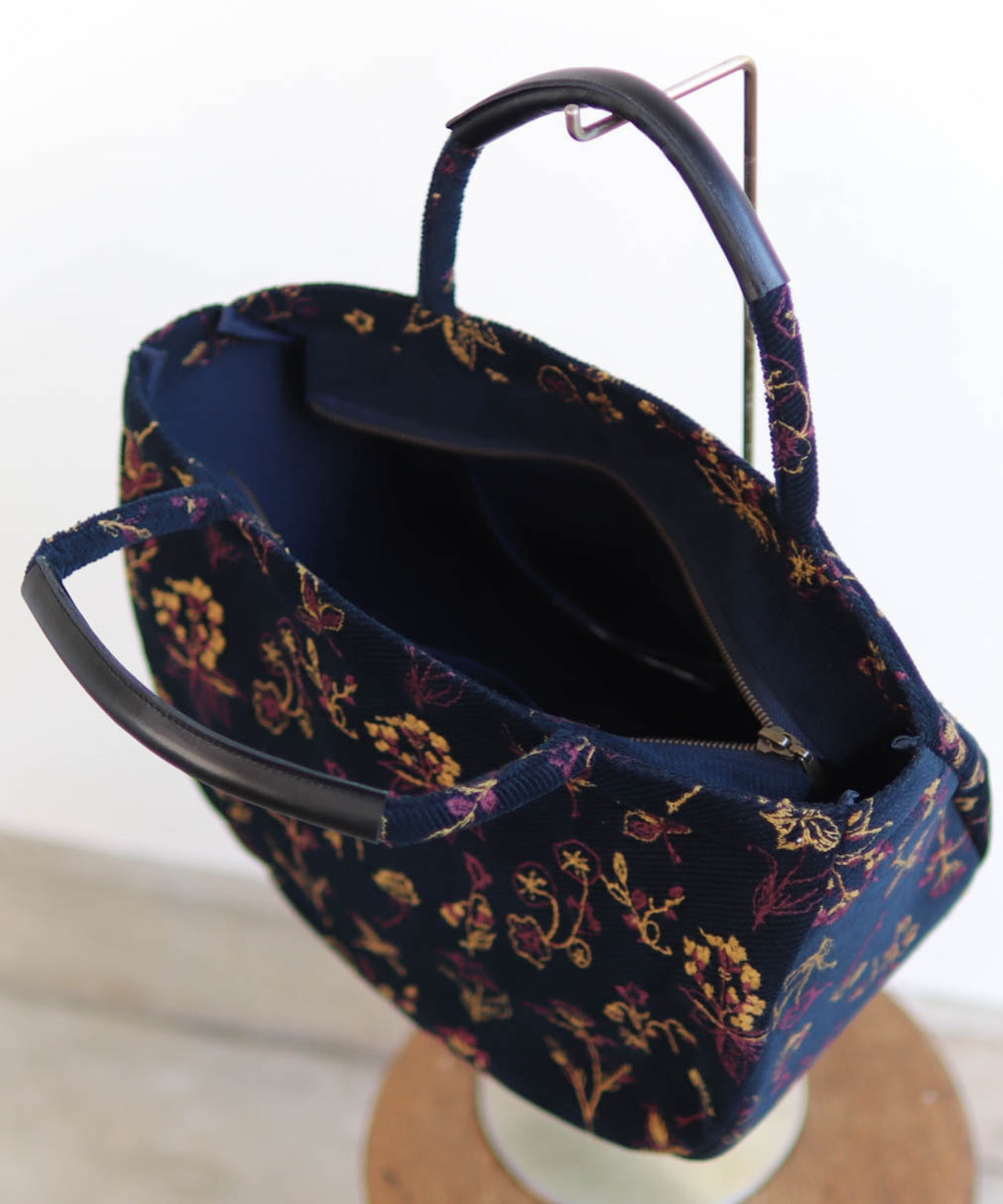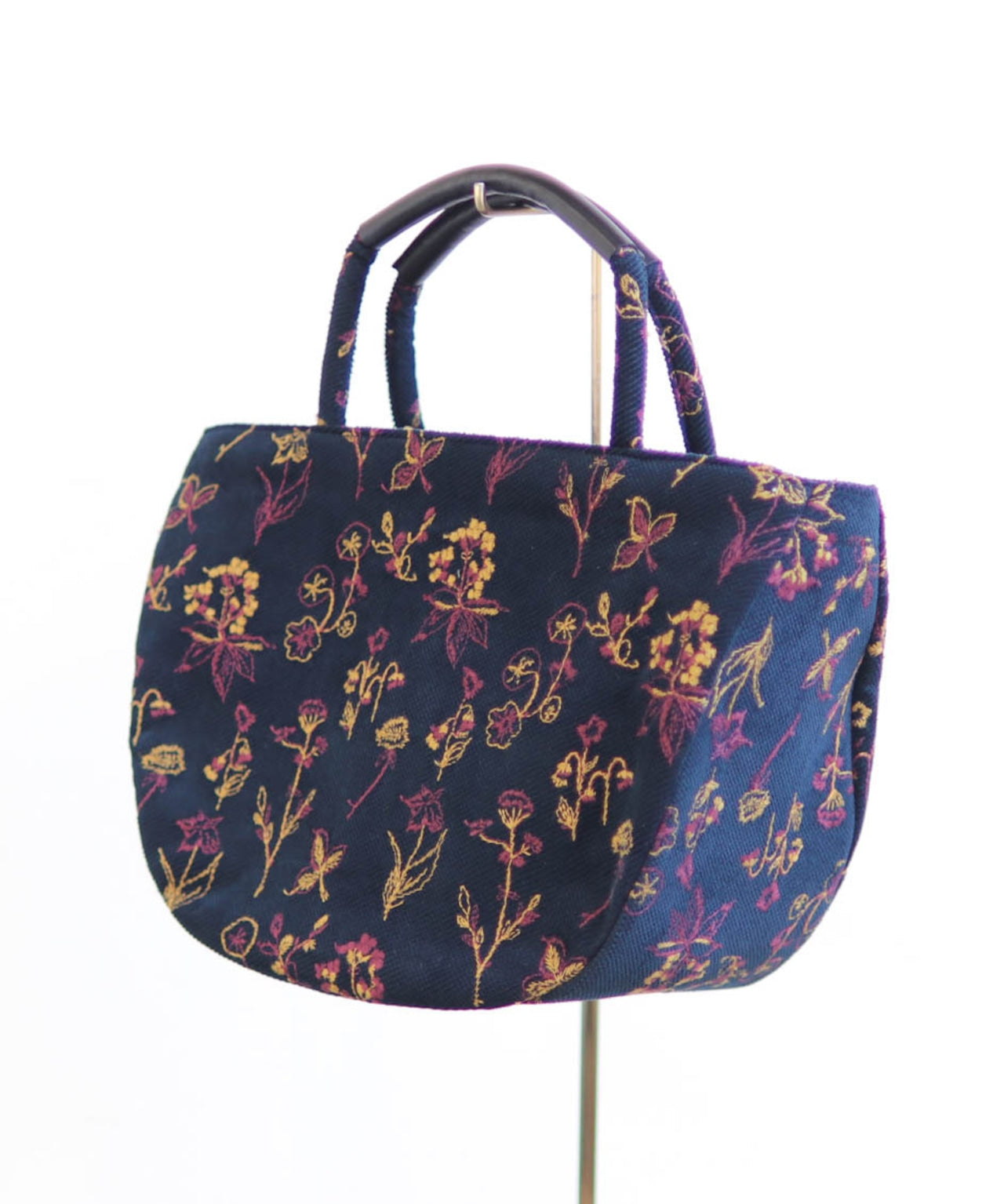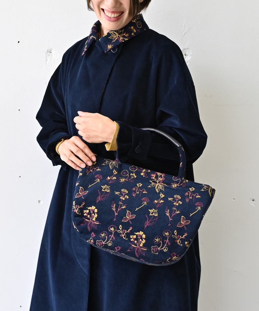 〈肩かけ可〉〈A4書類可〉〈たっぷりマチあり〉〈ファスナー開き〉〈内外ポケットあり〉〈持ち手レザー〉花刺繍 半円バッグ (bag033)