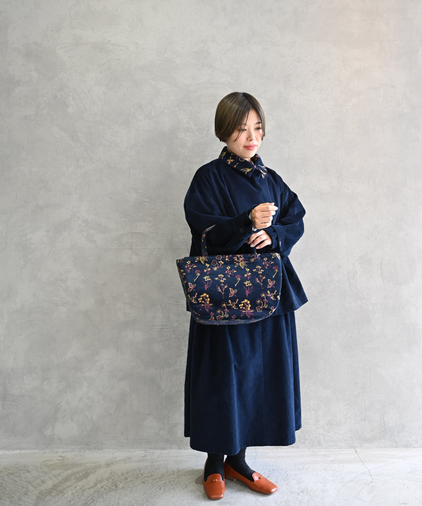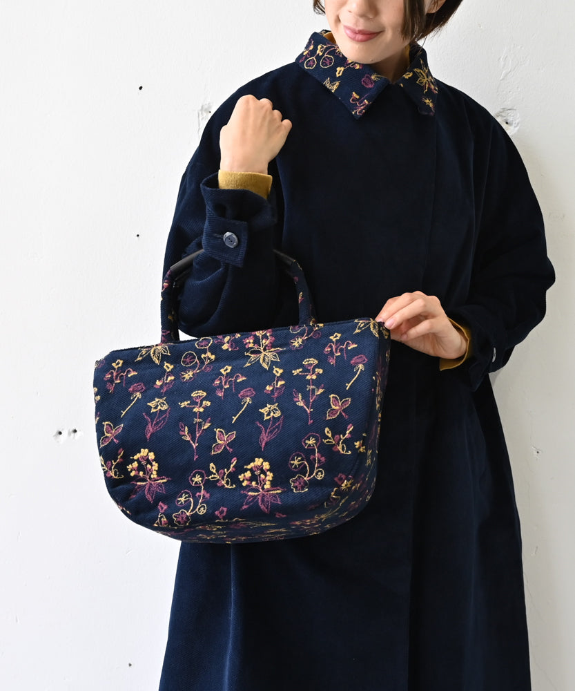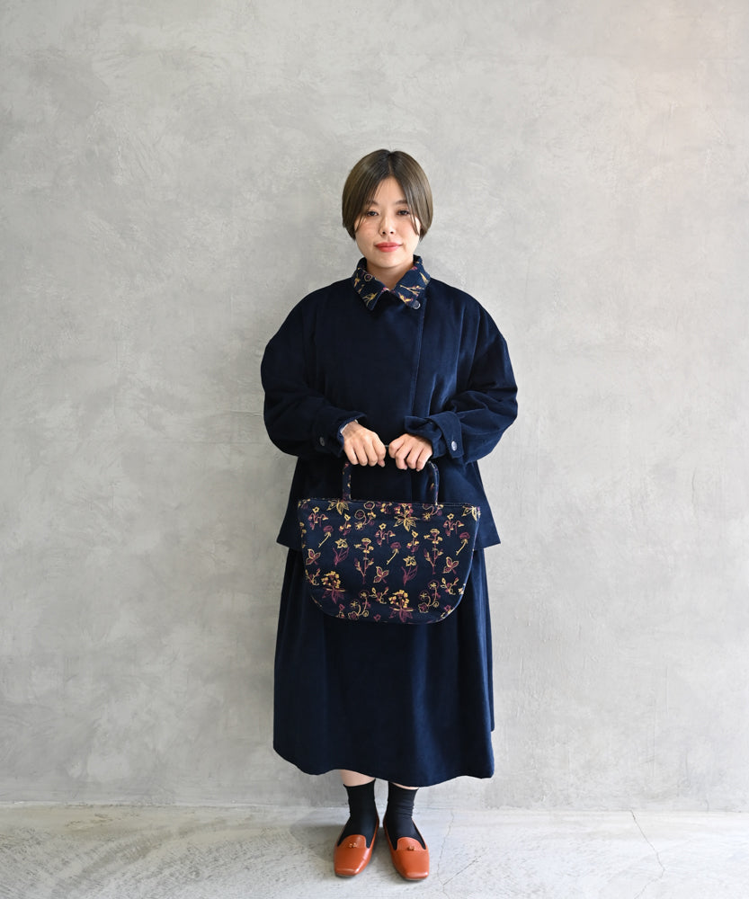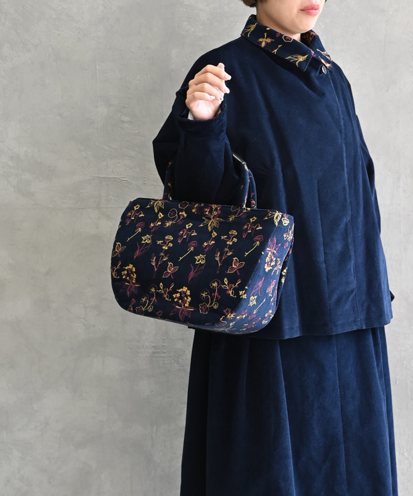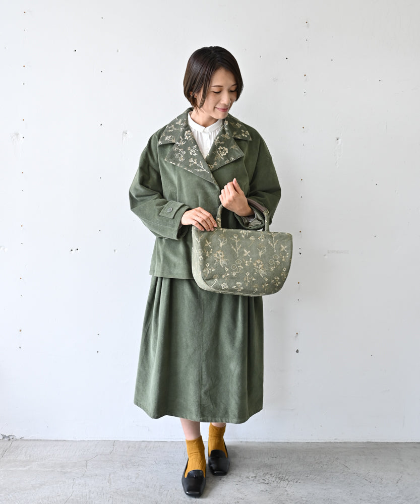 どこかノスタルジックでクラシックな、インテリアをも思わせるような刺繍が美しい、少し凹凸感のあるコットンのコーデュロイ生地です。