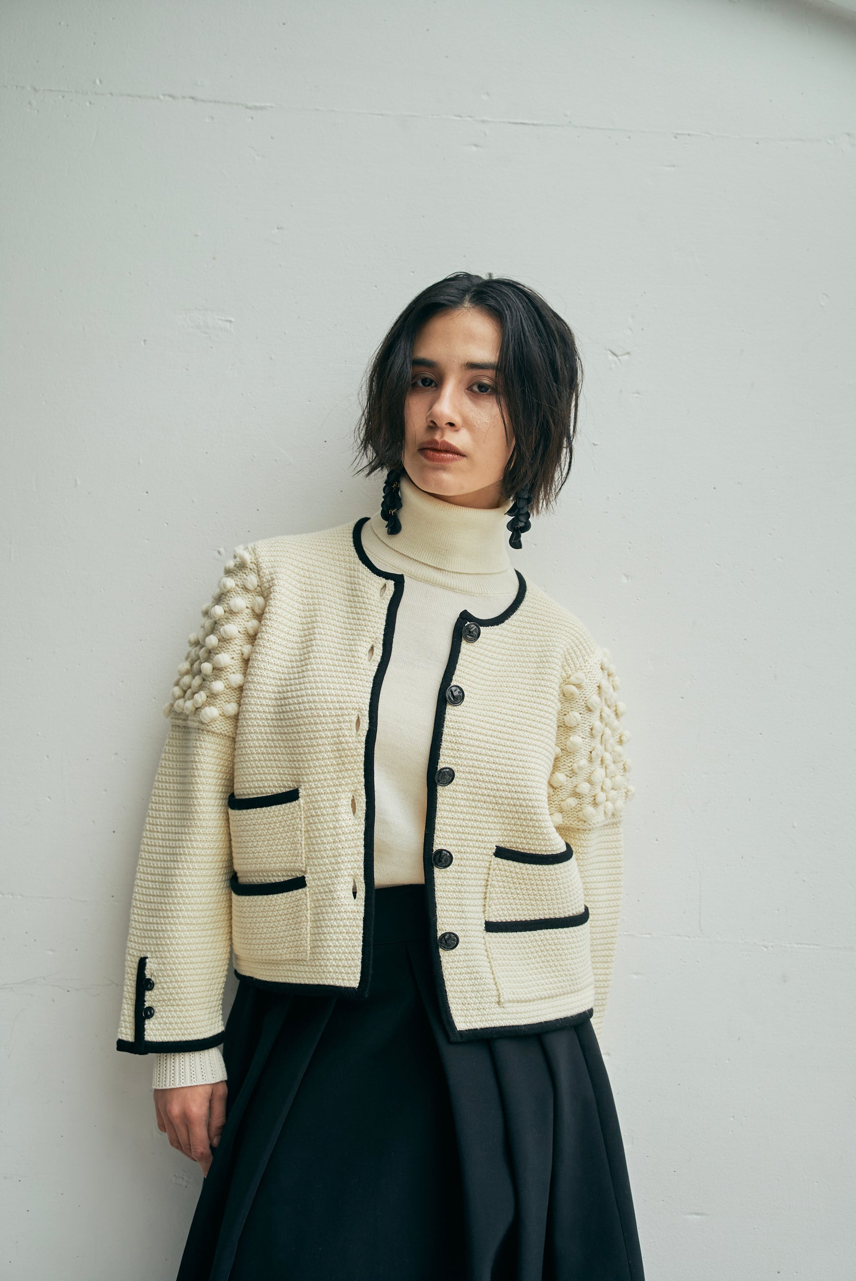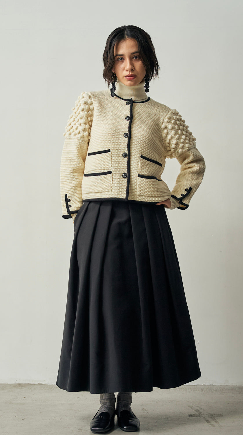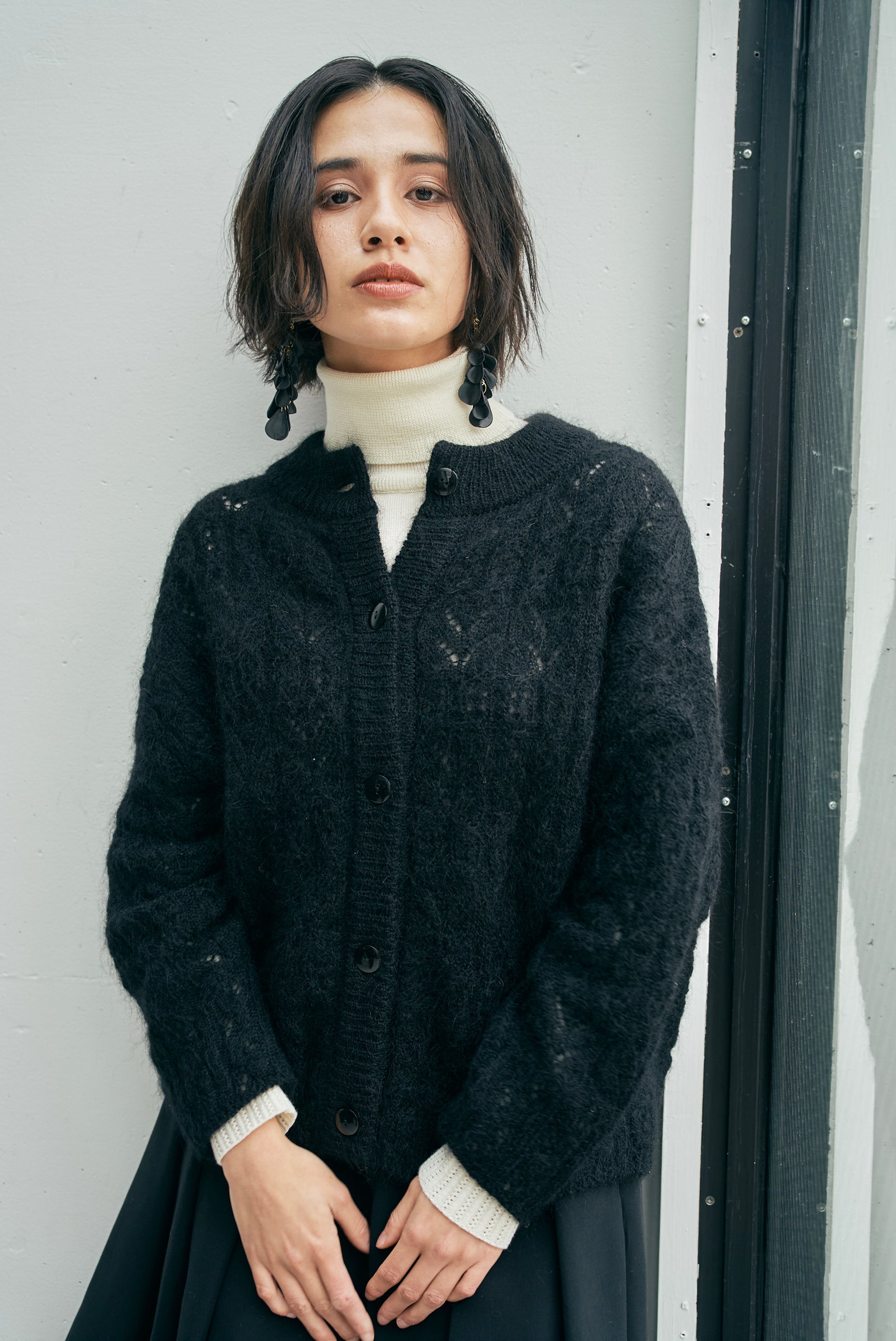 〈高品質シルク&アンゴラ山羊モヘヤ〉模様編み ボリュームスリーブカーディガン (mug417)