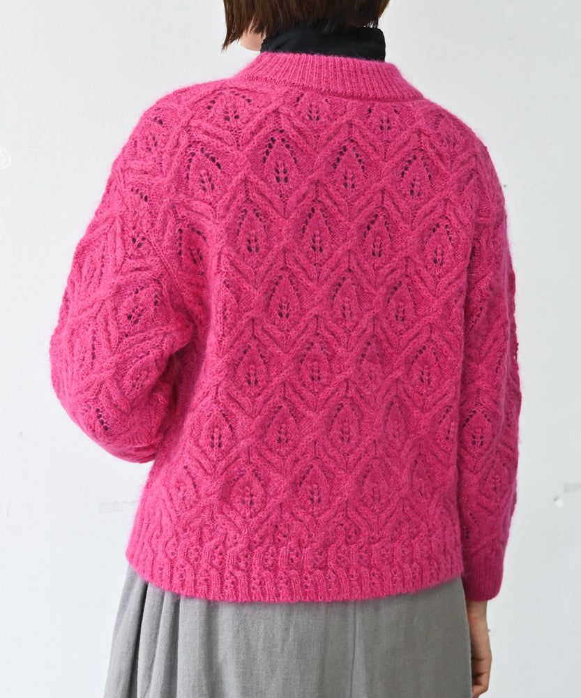〈キッドモヘヤ×ウール×アルパカ×シルク〉リーフ模様編み カーディガン (muk405)