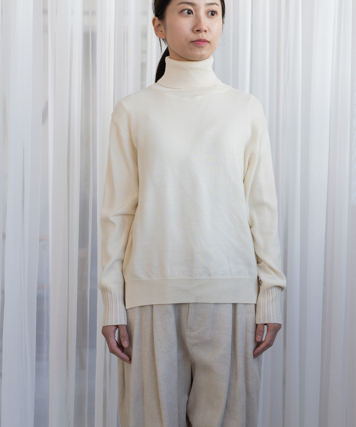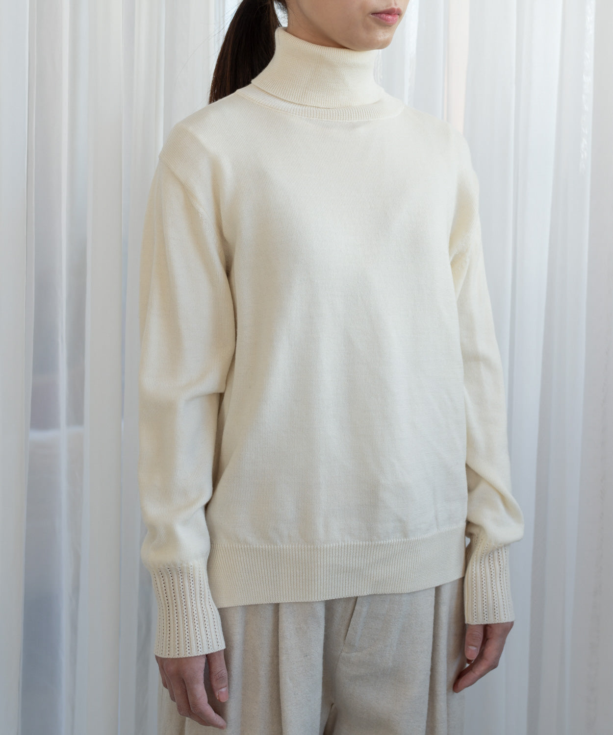 上品で洗練されたデザインの、「ベーシックな洗えるニットタートル」です。シンプルながらも、袖に施された繊細な透かし編みの模様が抜け感とフェミニンさをプラスし、大人の女性らしいエレガントな雰囲気を演出します。