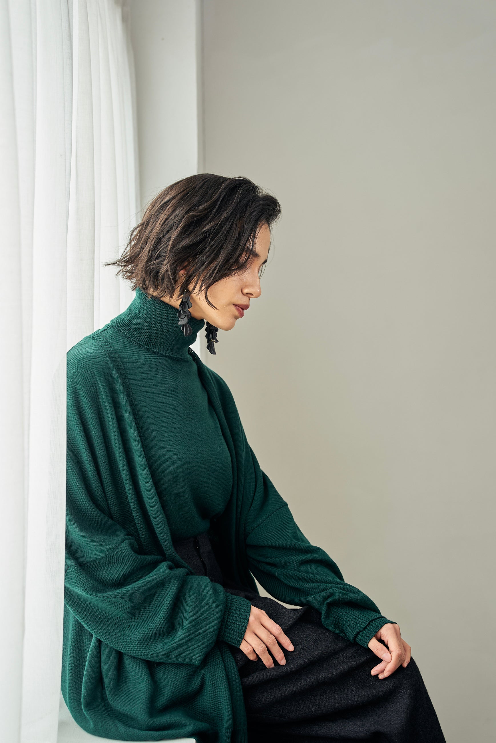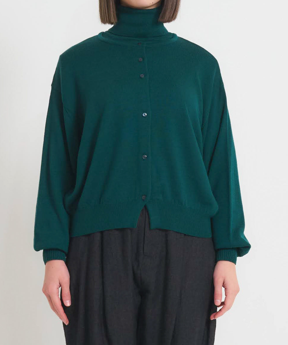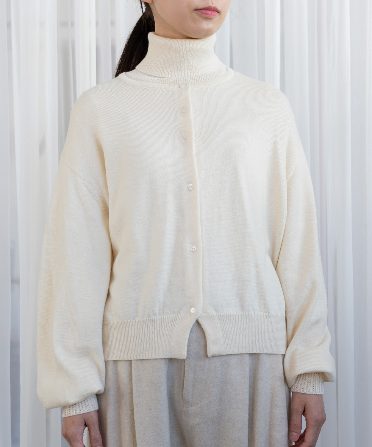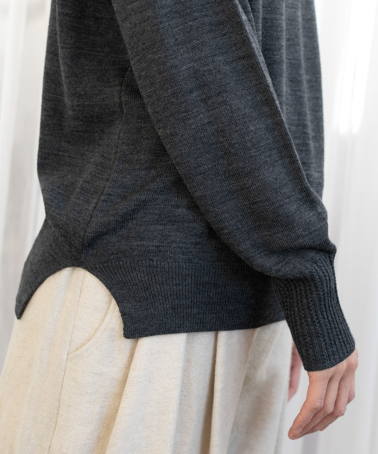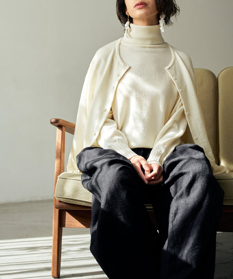 厳選されたエクストラファインメリノウールをつかって、イタリア・ビエラスタイルのレシピに基づいて国内メーカーがつくった上質な毛糸を、ハイゲージに編み上げました。空気をたっぷりと含み、ふっくらとした温かみのある風合いと、何よりなめらかで上品な光沢がとても特徴的です。