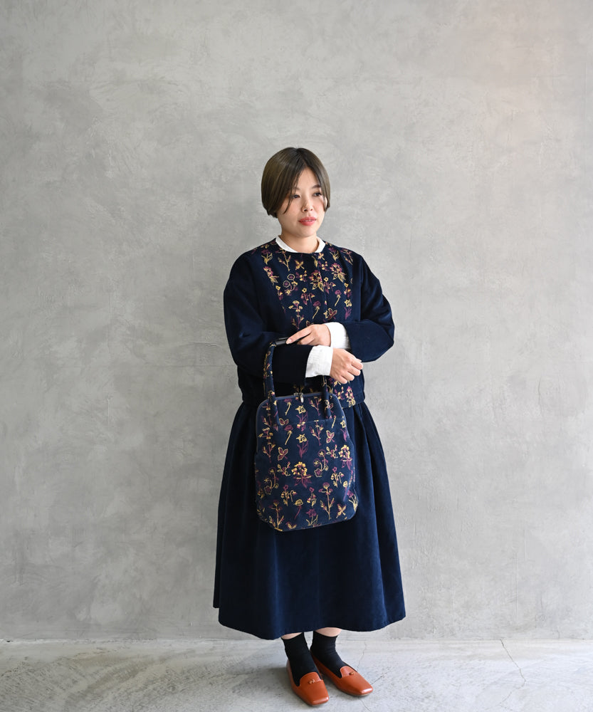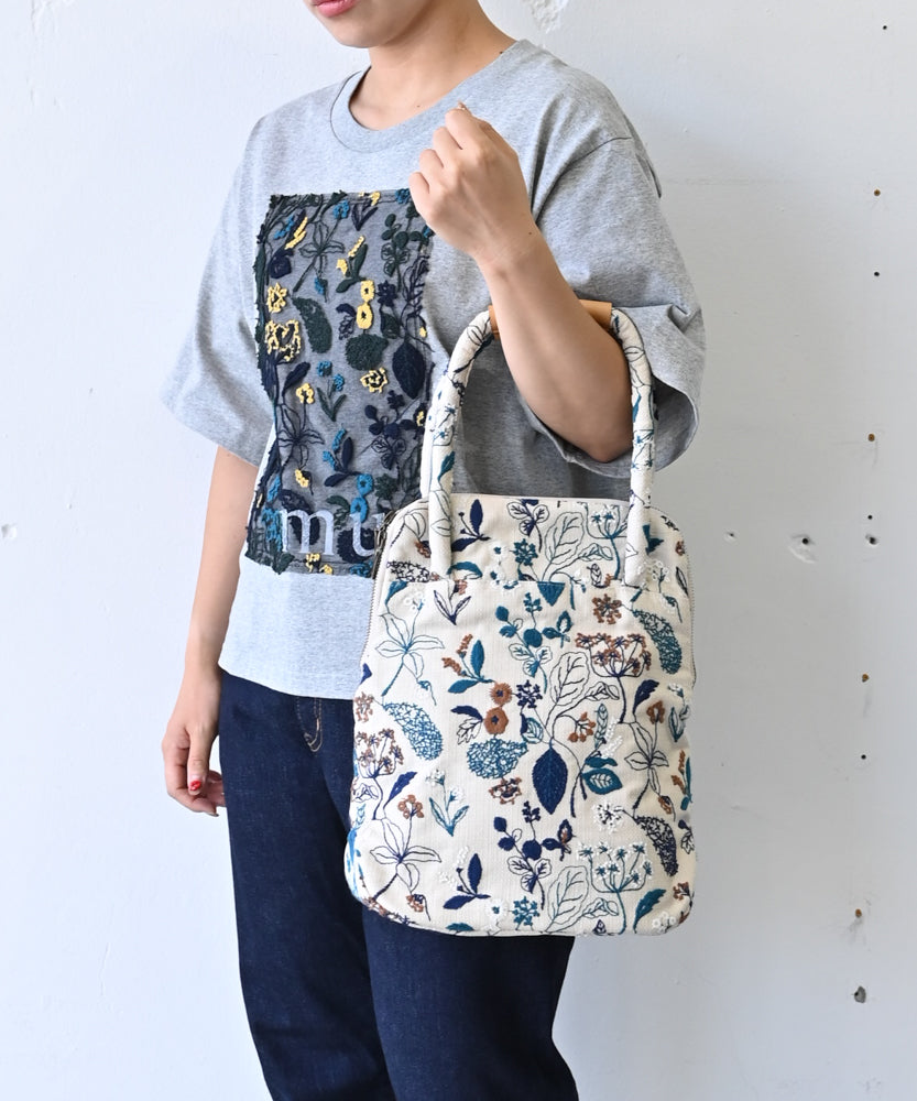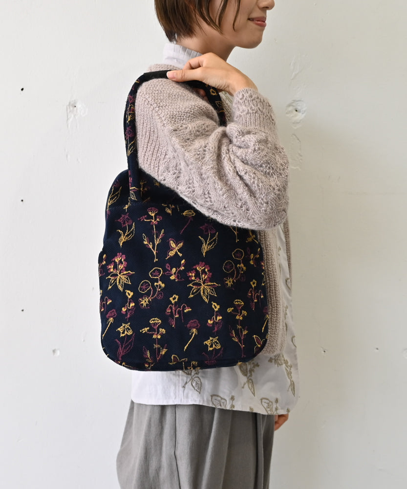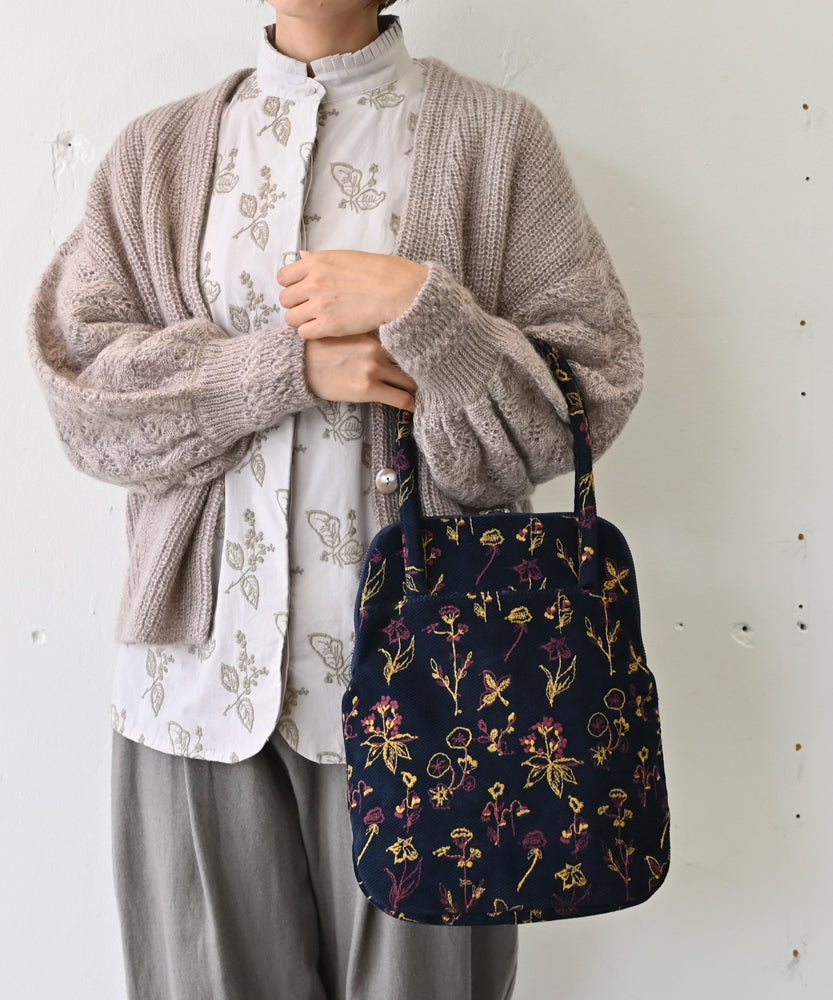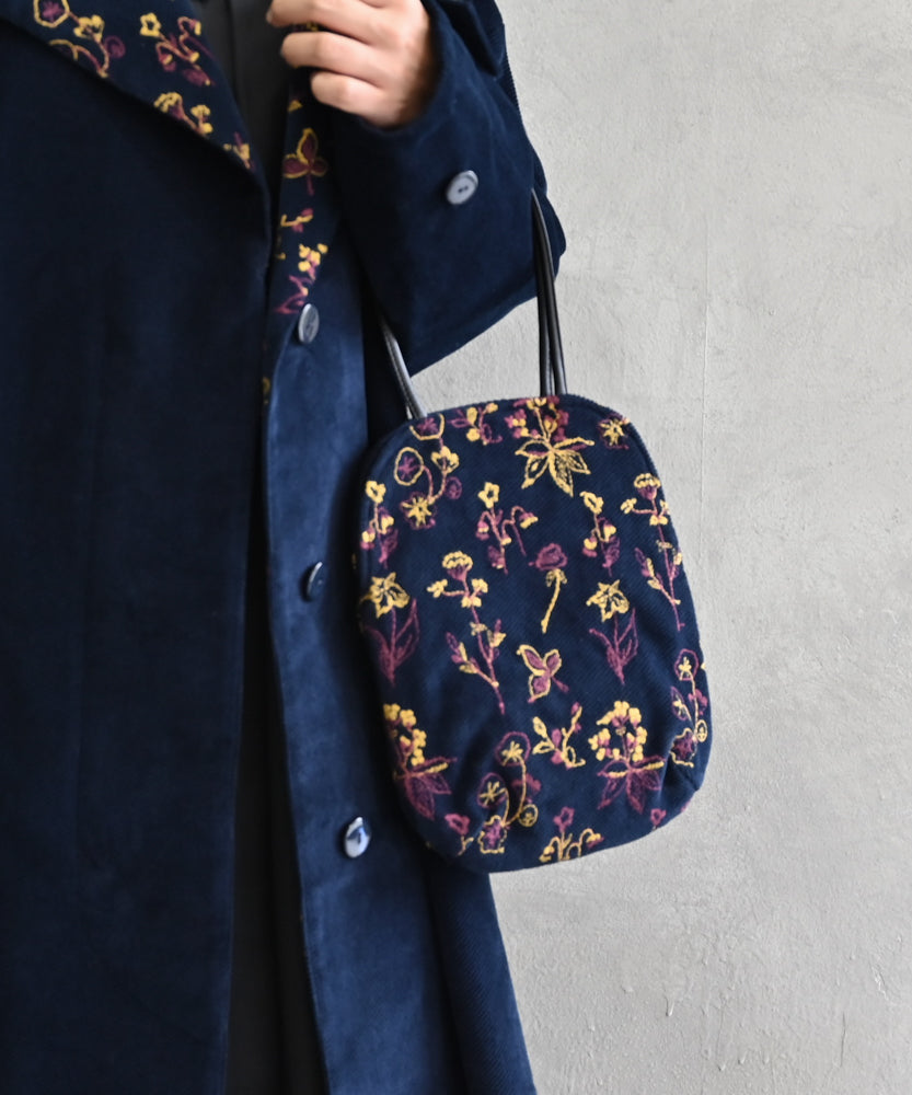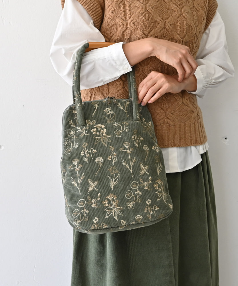 コットンコーデュロイ 花刺繍のミニサイズバッグ (bag030)