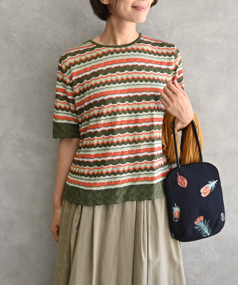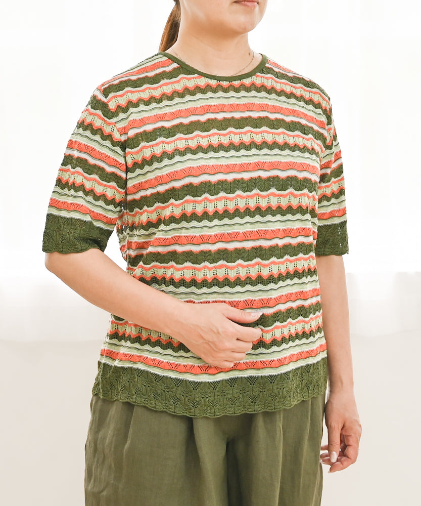 〈最高級品質シルク100%〉透かしレース編み シルクマルチボーダー半袖プルオーバー (mub923)