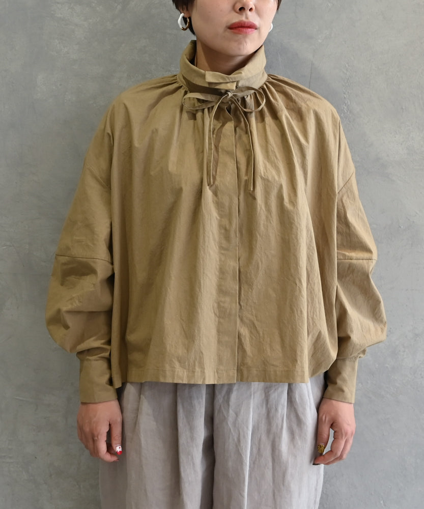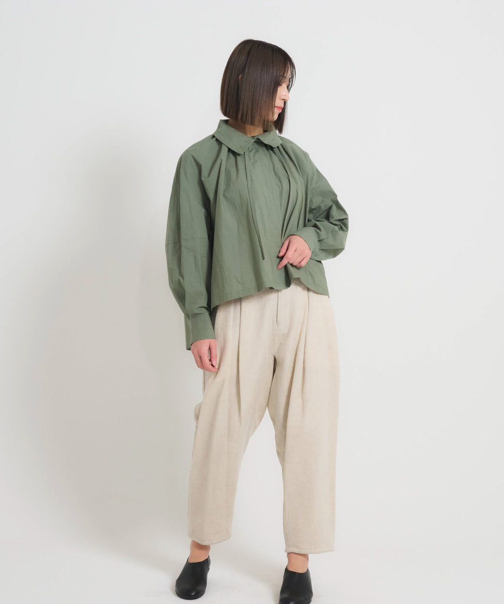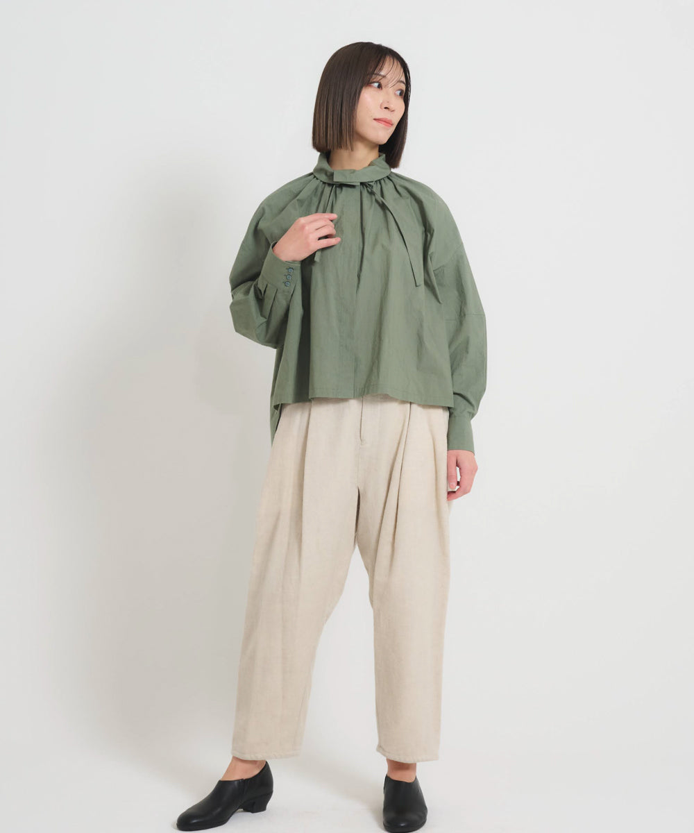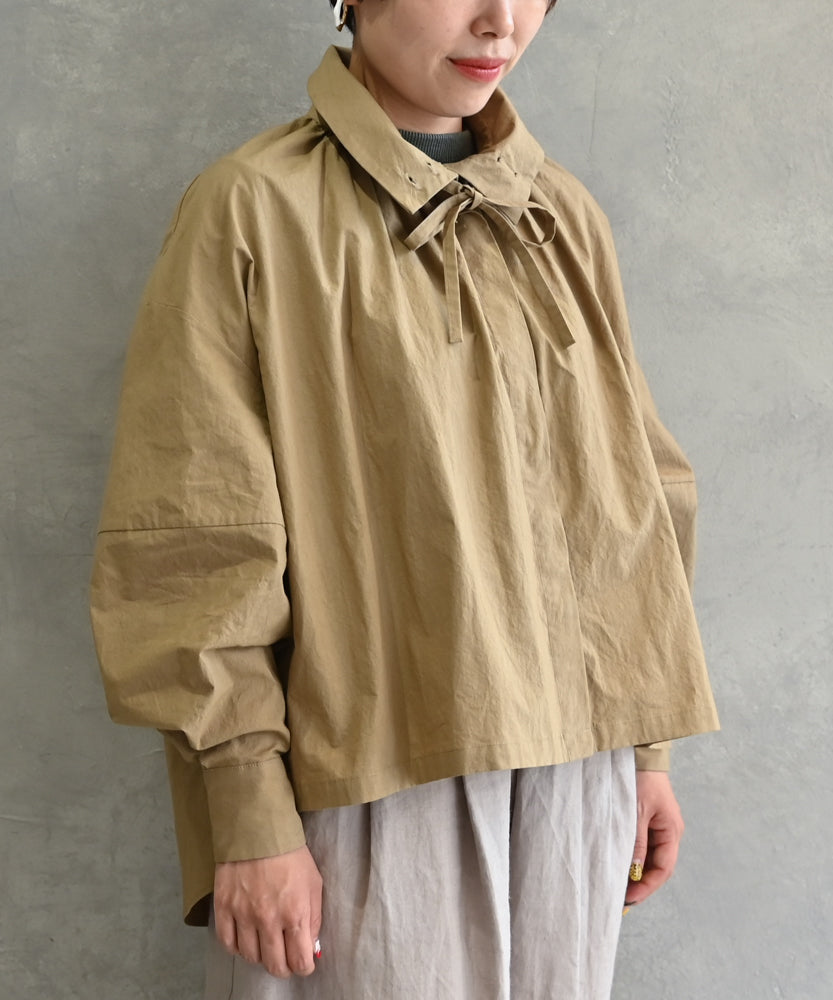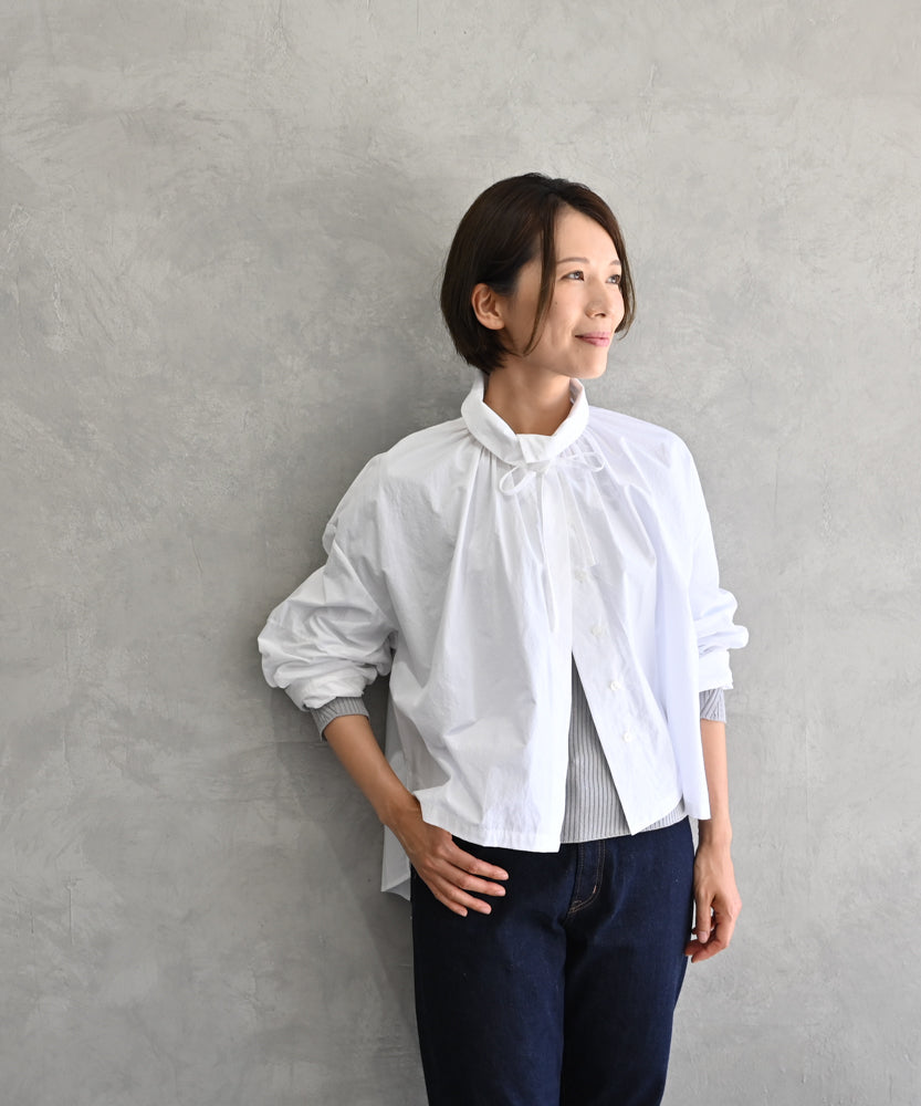 こちらは、衿の形が特長のmuucらしいデザインです。衿を立てても折っても着ていただけますし、さり気ないリボンを結んだり絞ったり垂らしたりでき、ボタンを留めるのはもちろん、前開きなのでボタンを開けて羽織りとしても着ていただけますので、様々なスタイリングをお楽しみいただけます。肩回りや身幅にゆとりをたっぷり入れていますので様々な体型の方に着ていただけます。