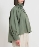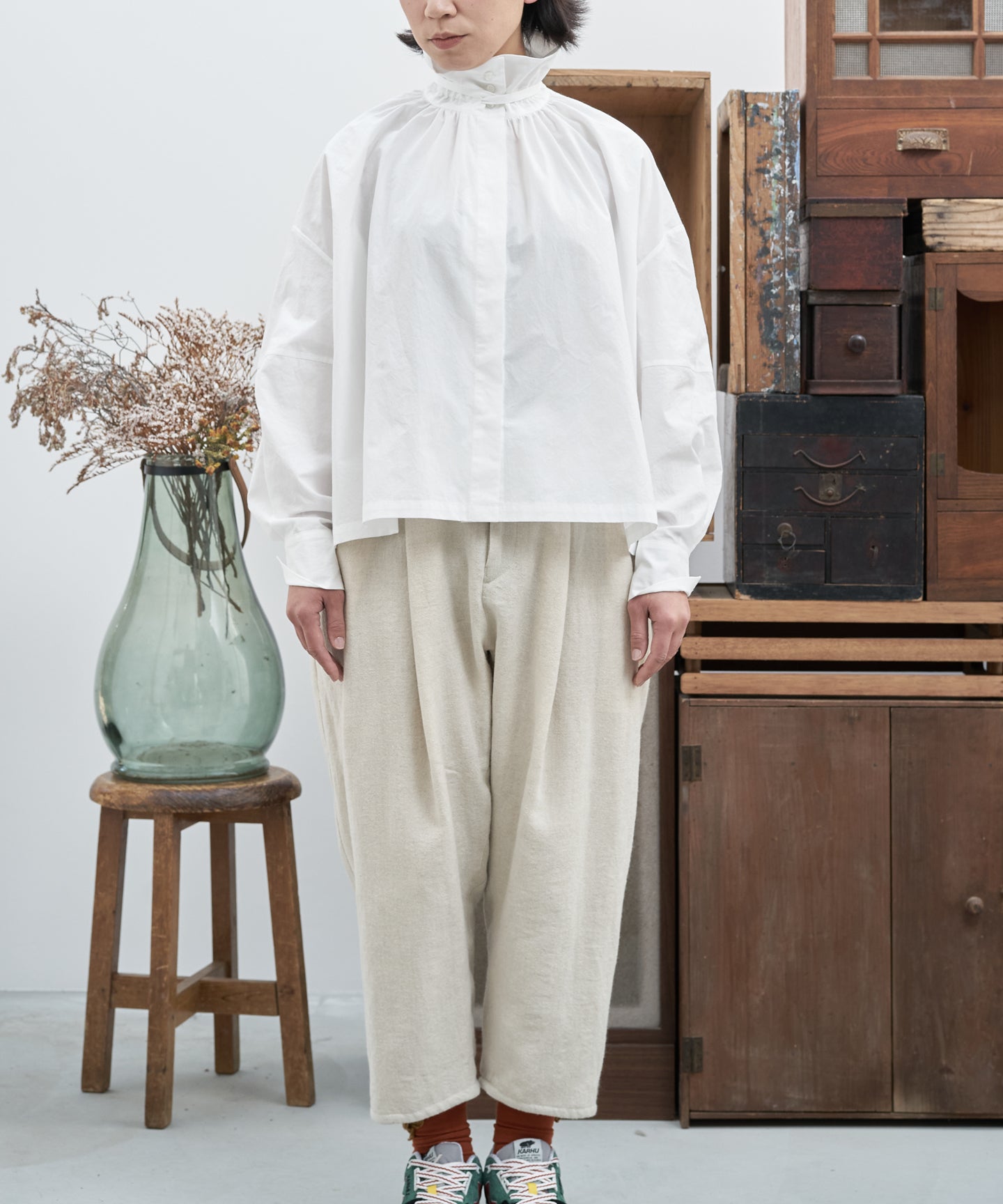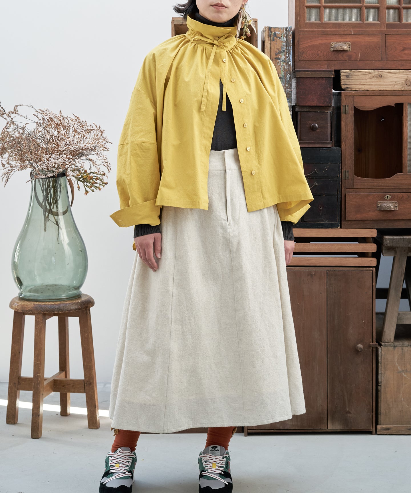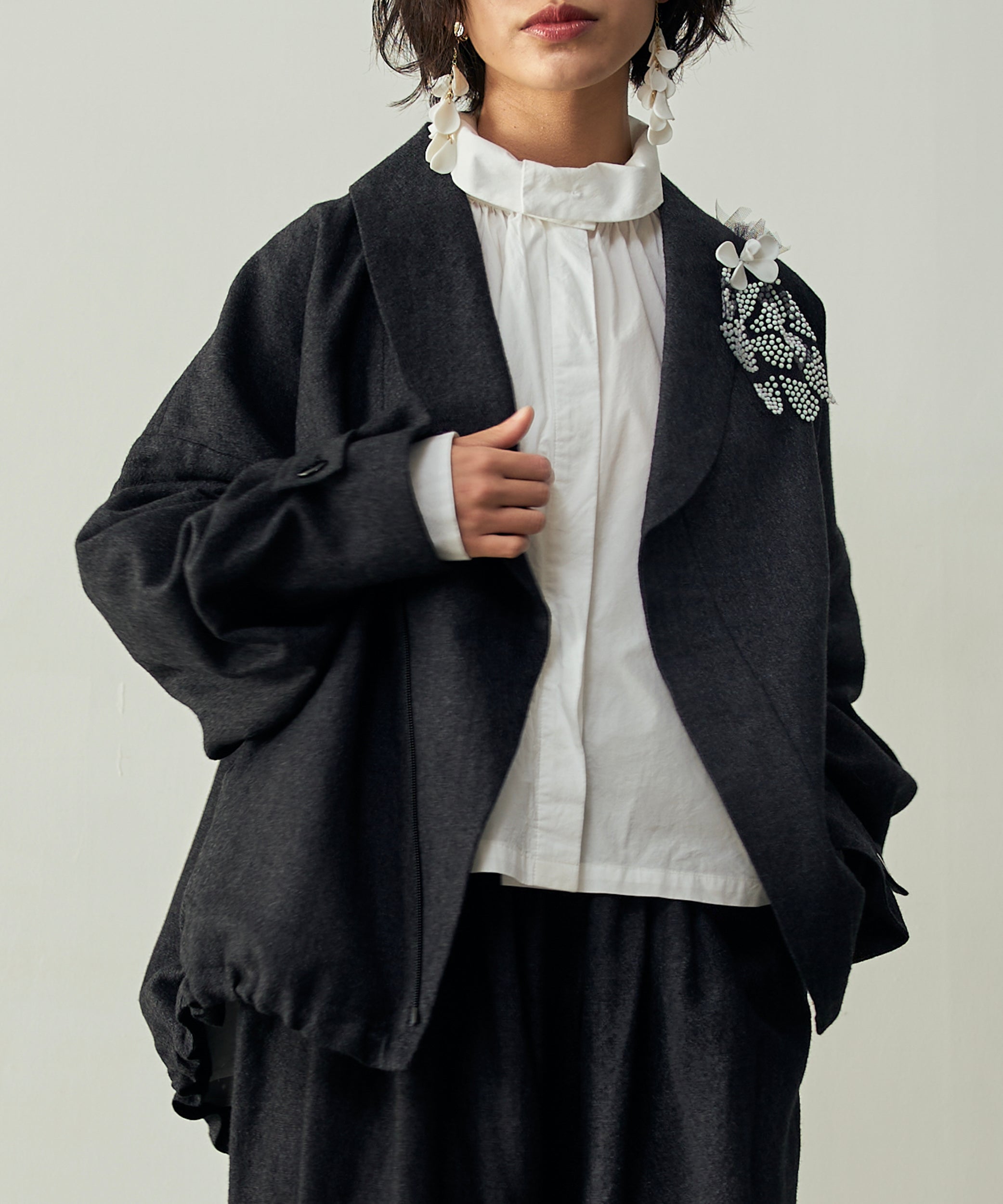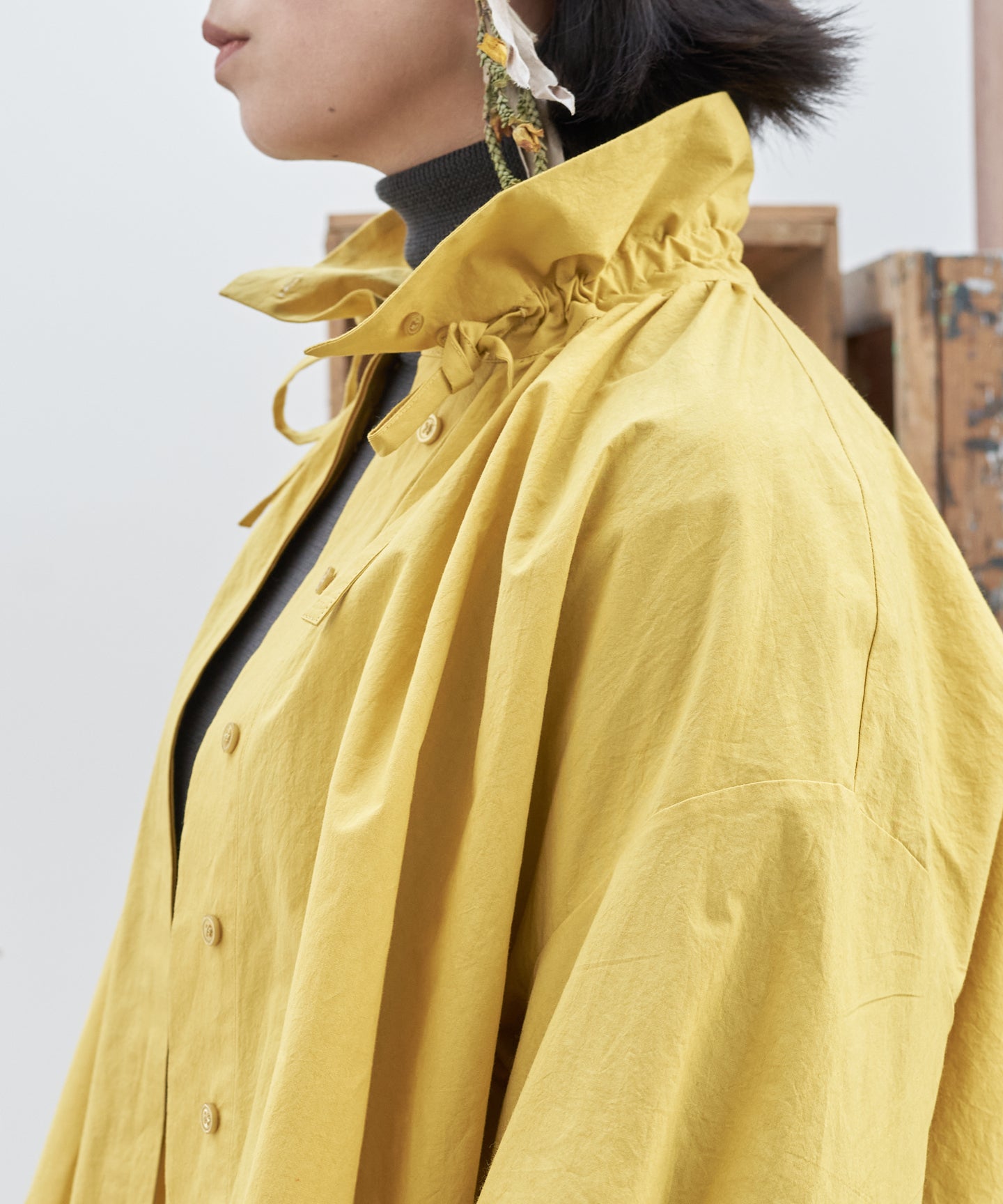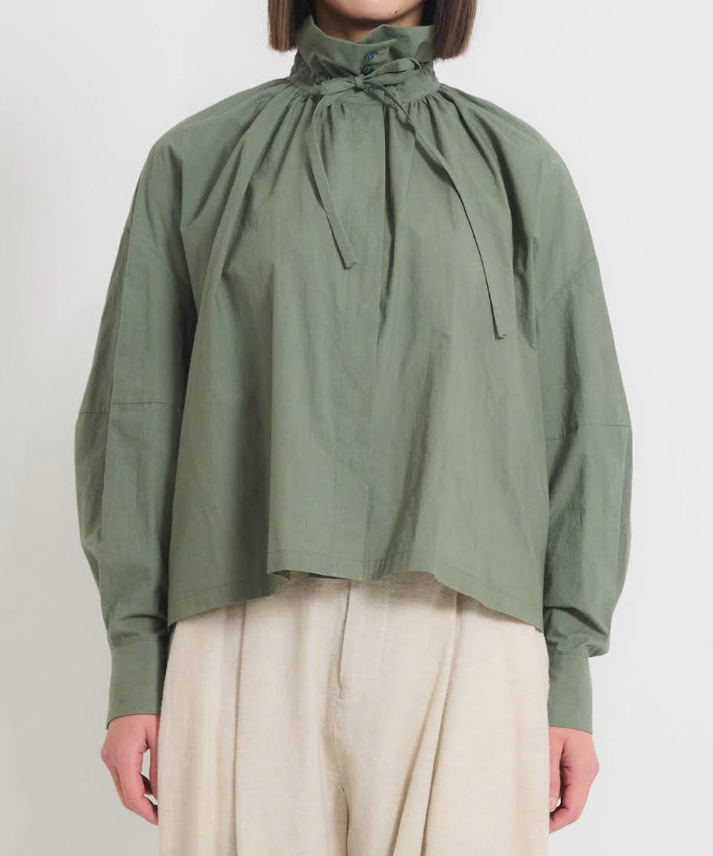 こちらは、衿の形が特長のmuucらしいデザインです。衿を立てても折っても着ていただけますし、さり気ないリボンを結んだり絞ったり垂らしたりでき、ボタンを留めるのはもちろん、前開きなのでボタンを開けて羽織りとしても着ていただけますので、様々なスタイリングをお楽しみいただけます。肩回りや身幅にゆとりをたっぷり入れていますので様々な体型の方に着ていただけます。