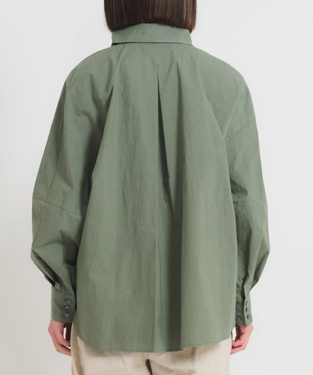 こちらのシャツブラウスは、静岡県浜松の遠州織物の上質なコットン生地を使用しています。柔らかいのにハリがあり、しっとりしているのにドライな感触もある、不思議な手触りが心地良い生地です。表面に細かなシワ加工があり、ナチュラルな風合いをお楽しみいただけます。