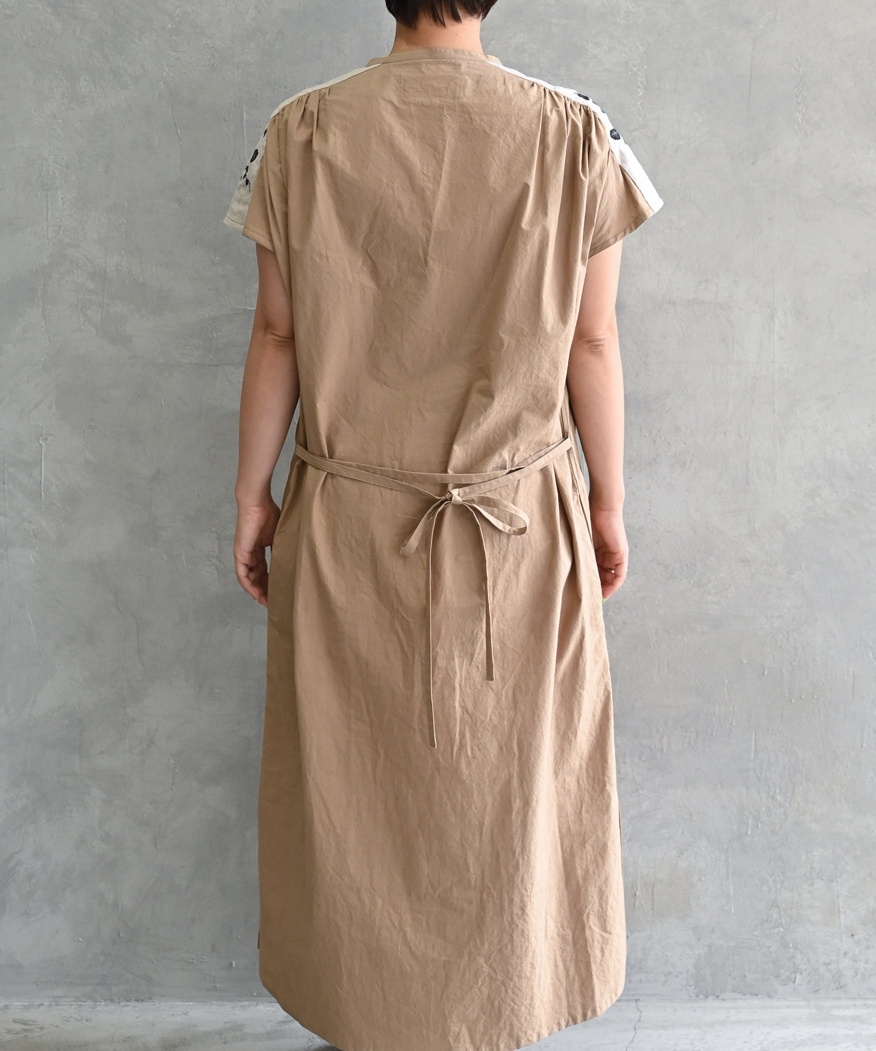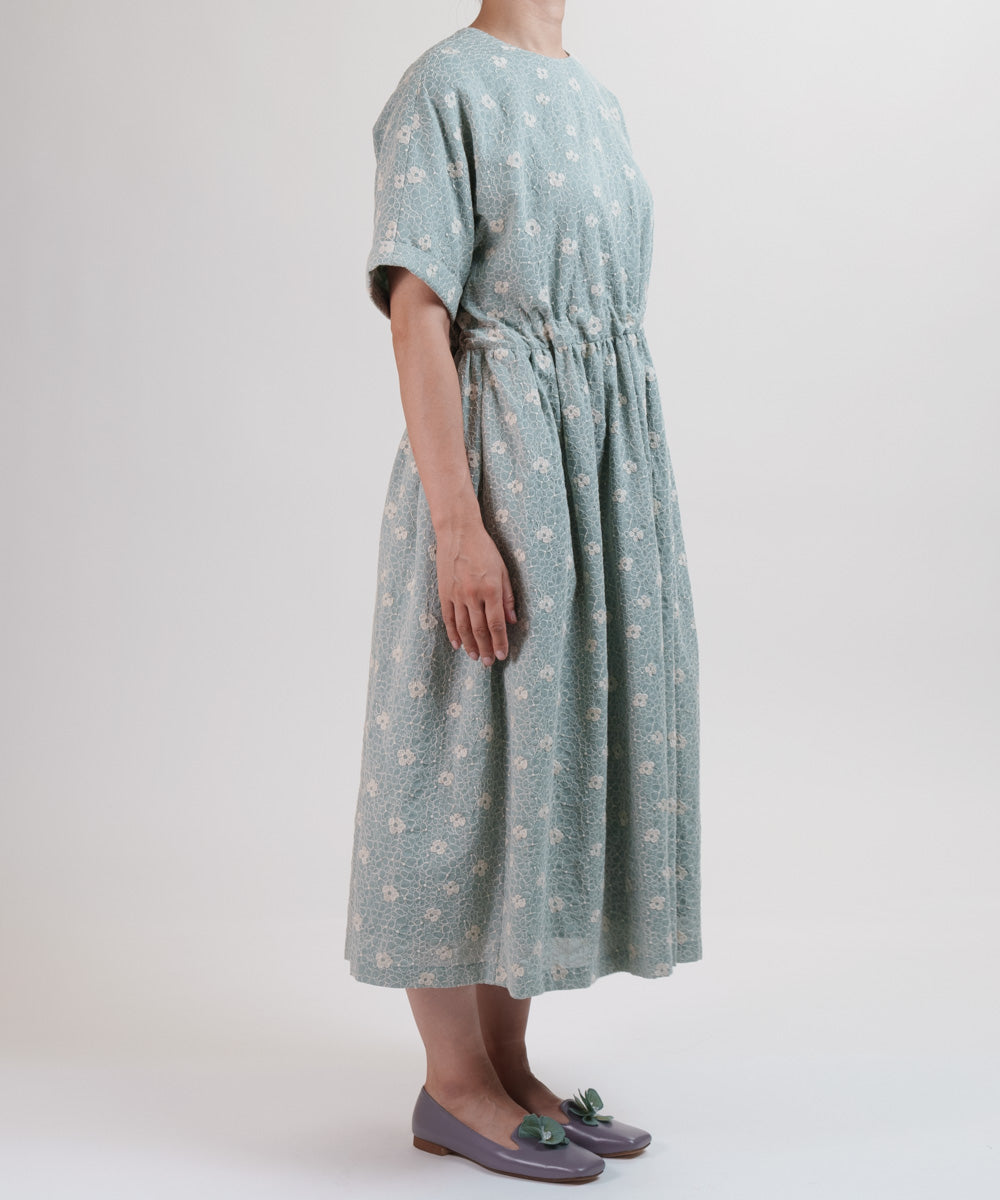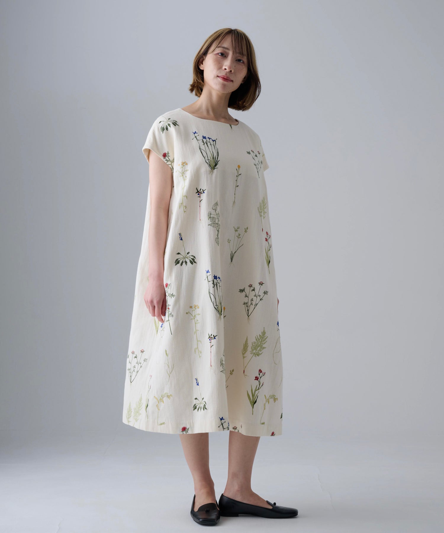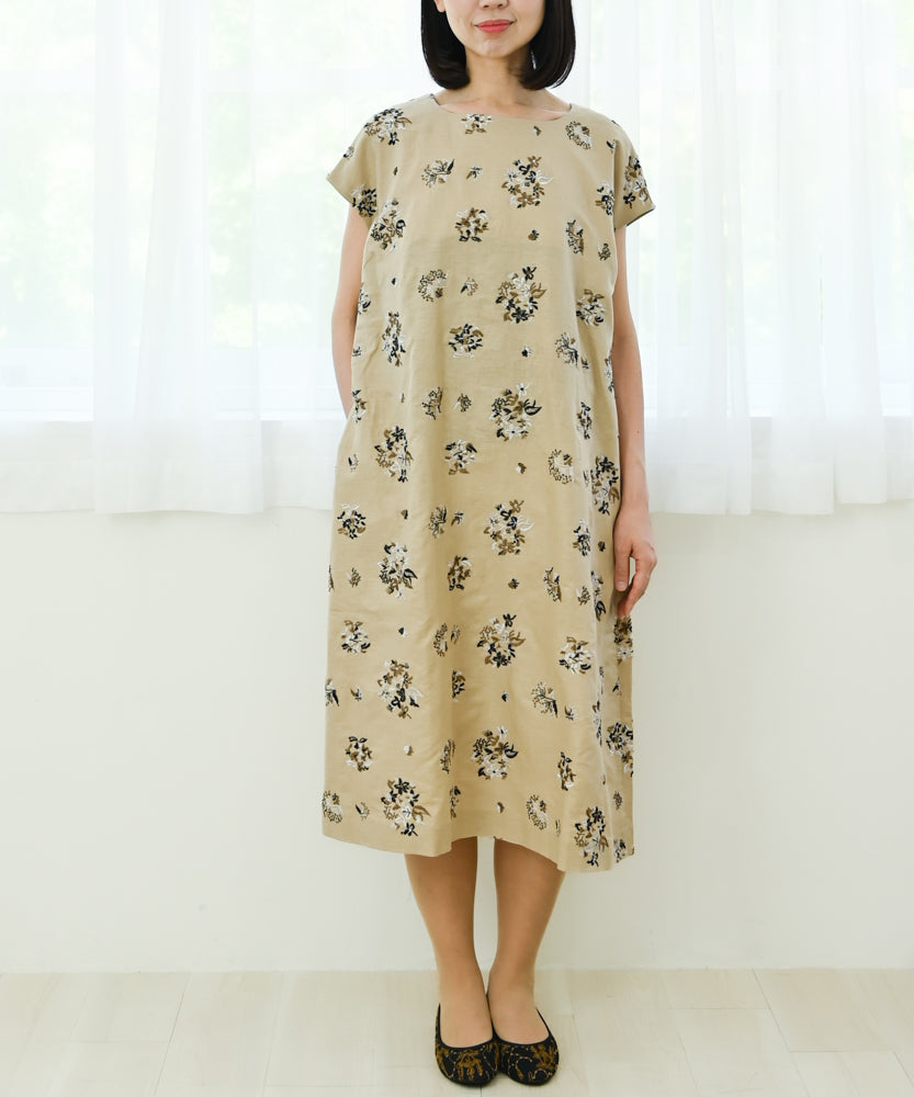 〈遠州織物 コットンリネン〉野小花刺繍 フレンチスリーブワンピース (muh603)