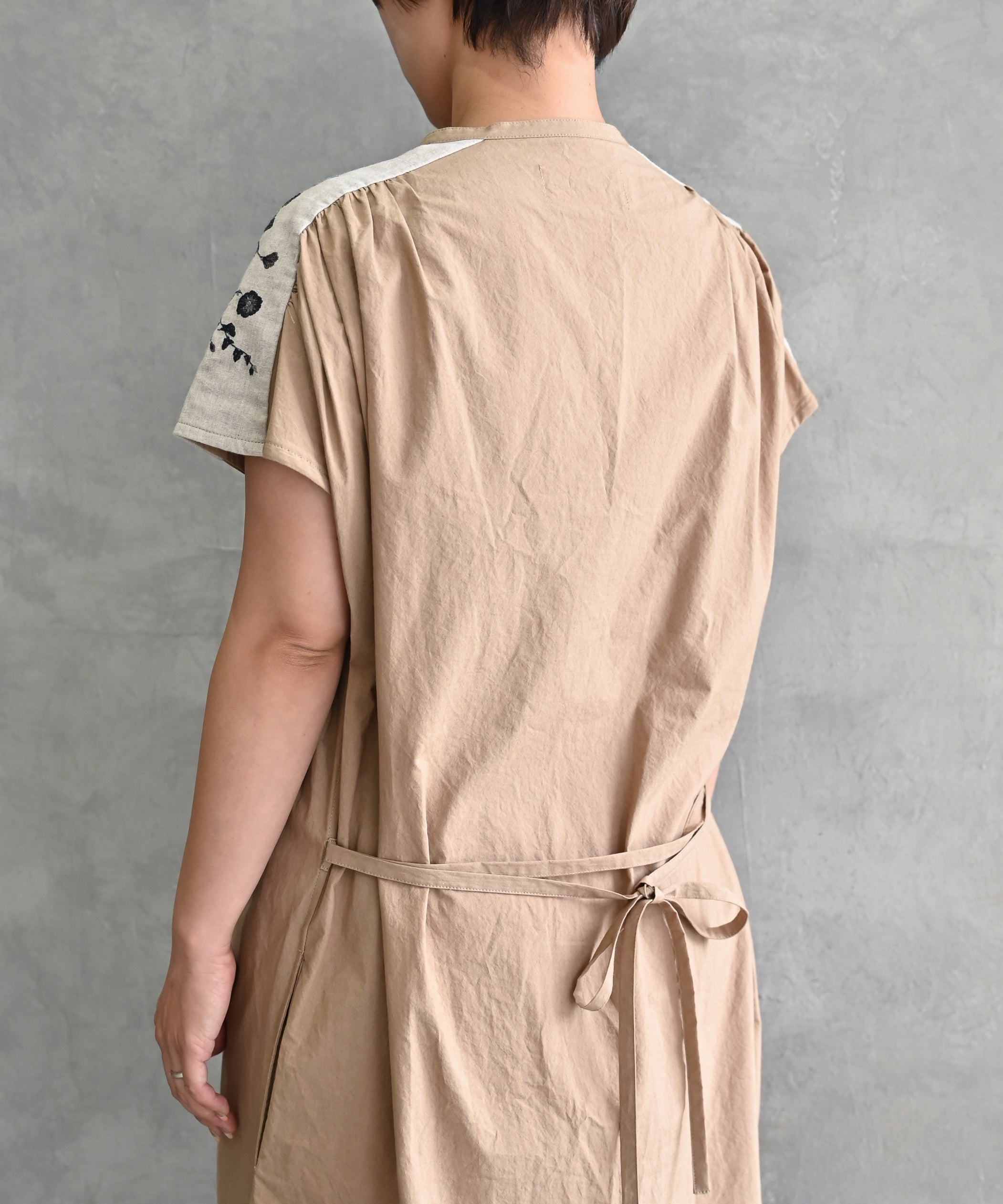 〈遠州織物 コットン生地〉ウエスト紐付き フレンチスリーブ フロントギャザー ポピーの花刺繍 ワンピースドレス (mud613)
