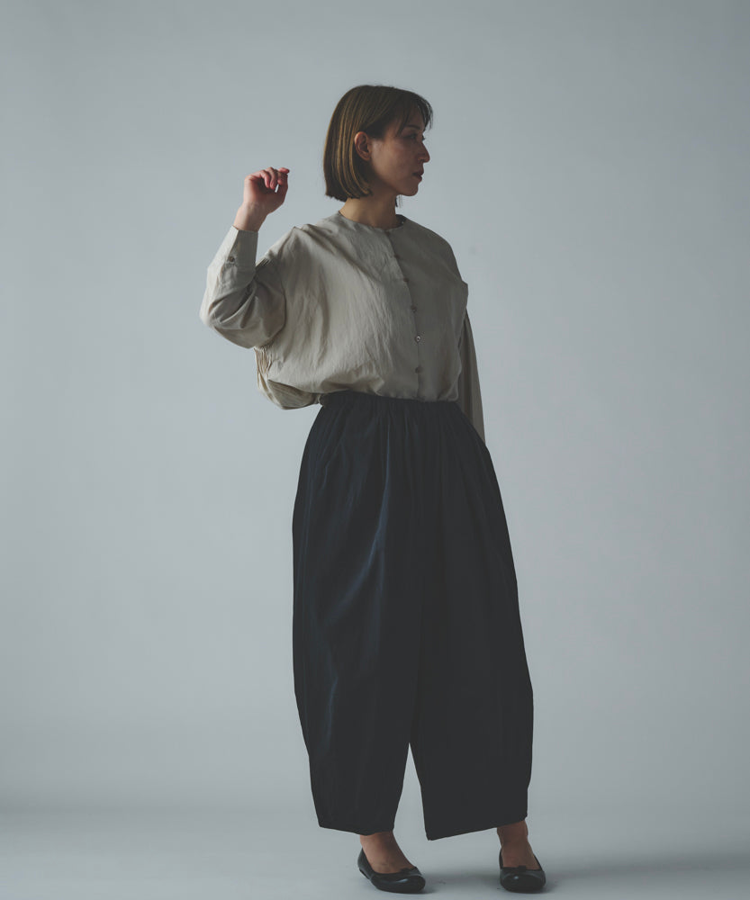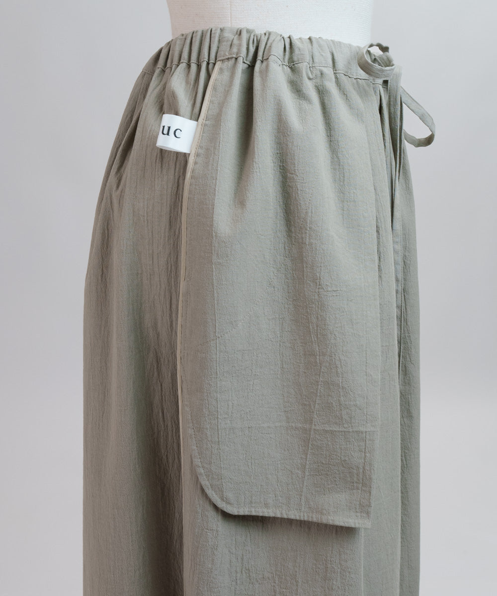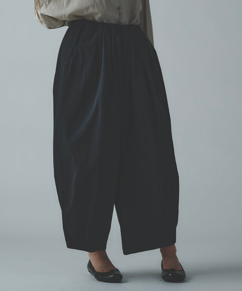 裾にダーツを入れて、やウエストヒップまわりのシルエットにこだわることで、muucらしい”ひと味違う”ボトムスに仕上げています。ウエスト総はゴム&ひもです。