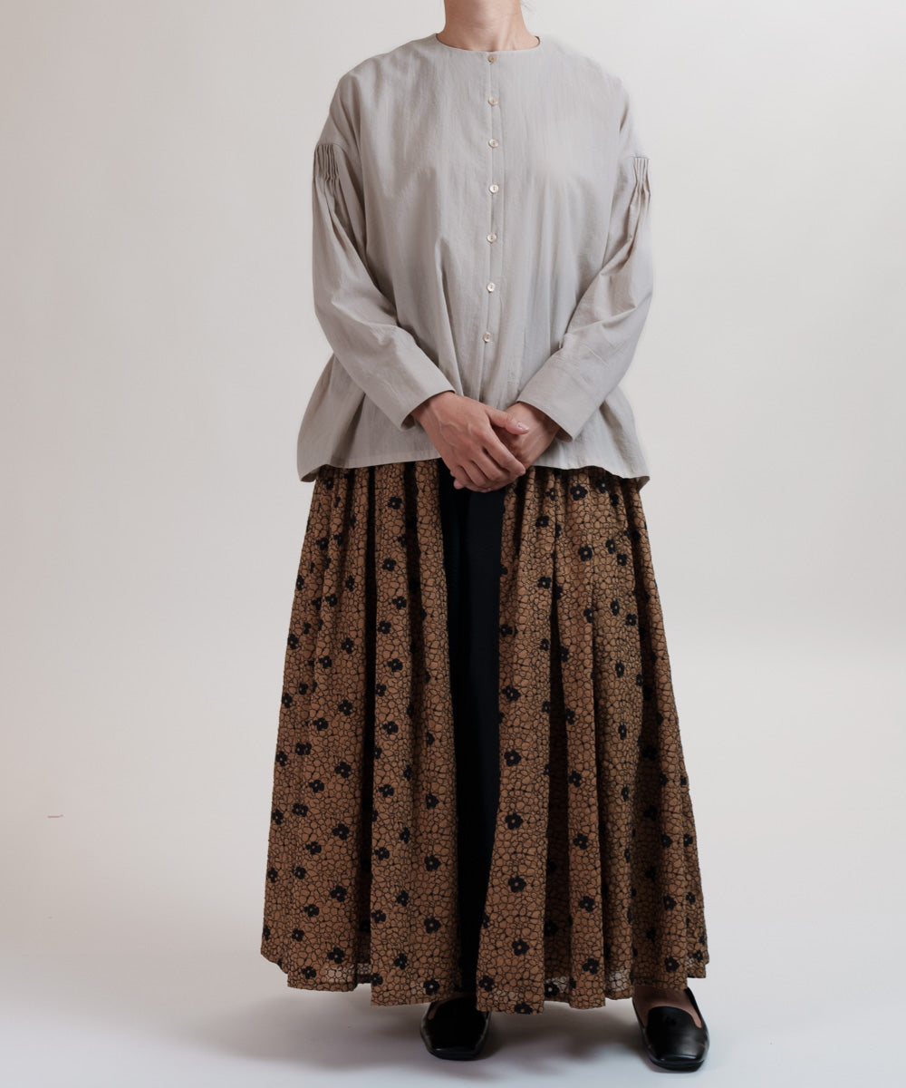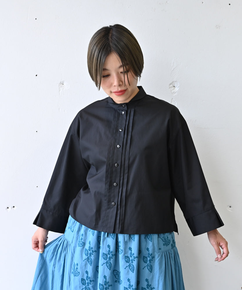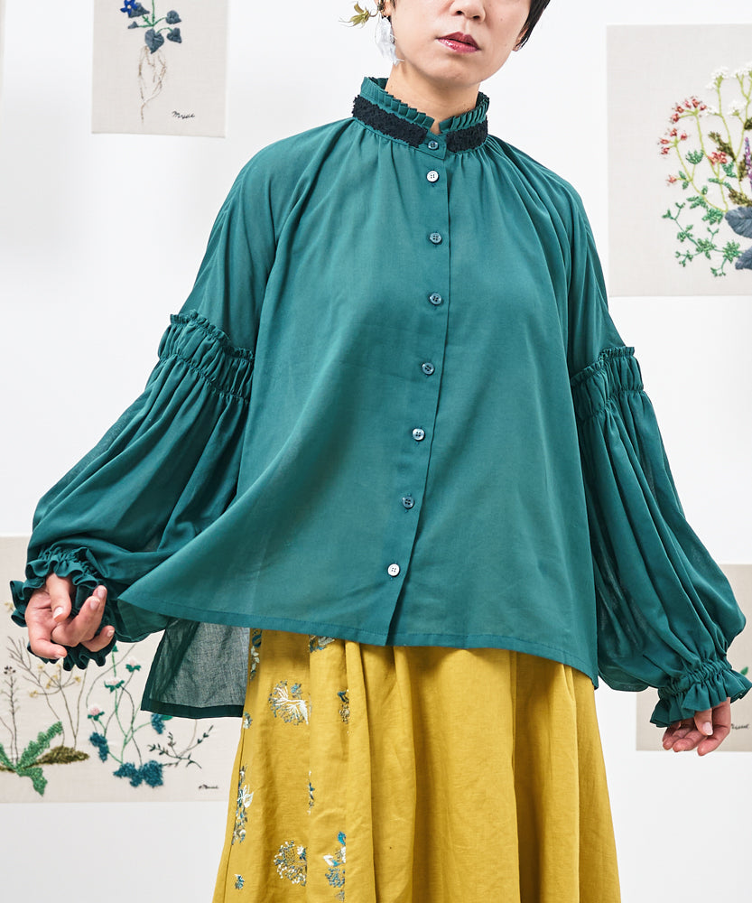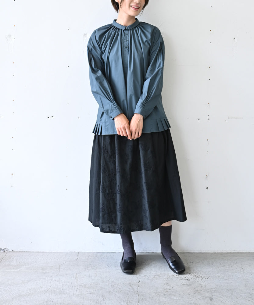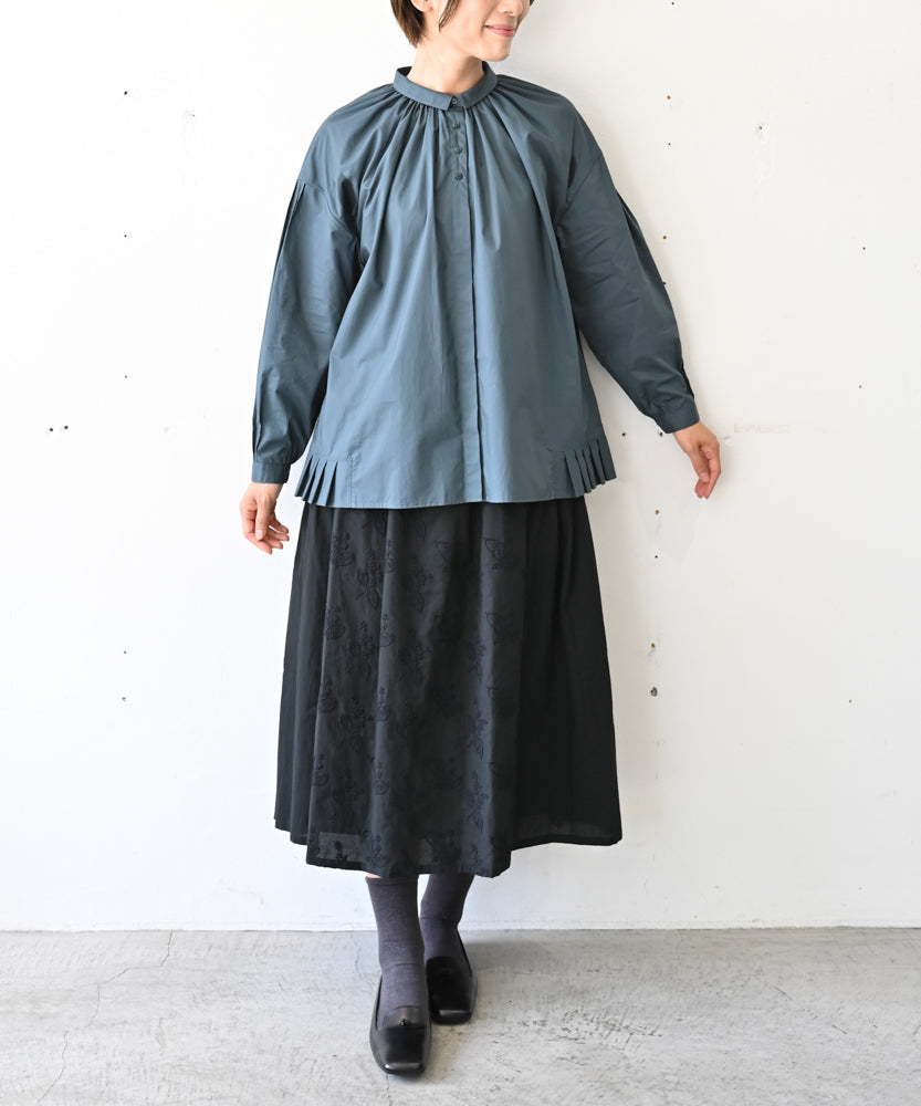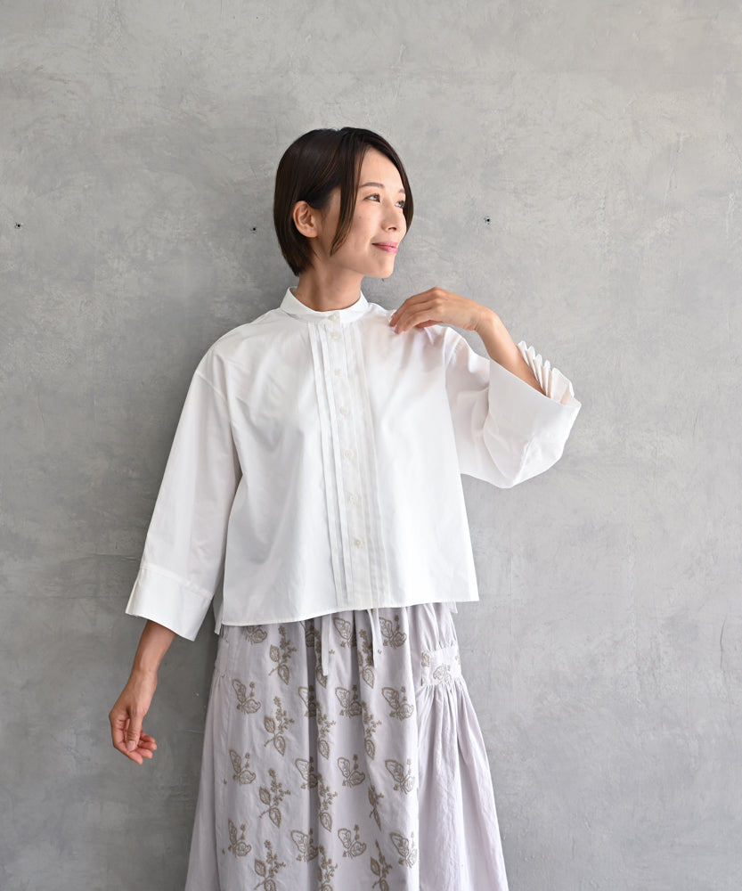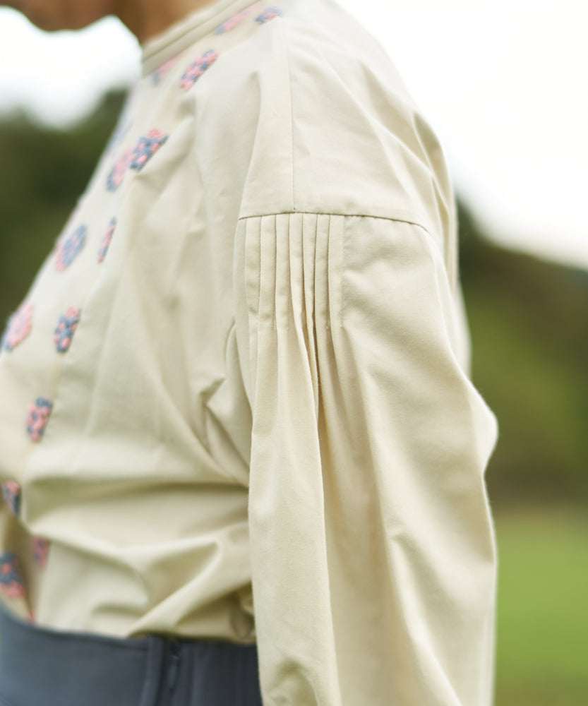 〈綿ローン生地〉梅小花刺繍 スタンドカラーブラウス (muk112)