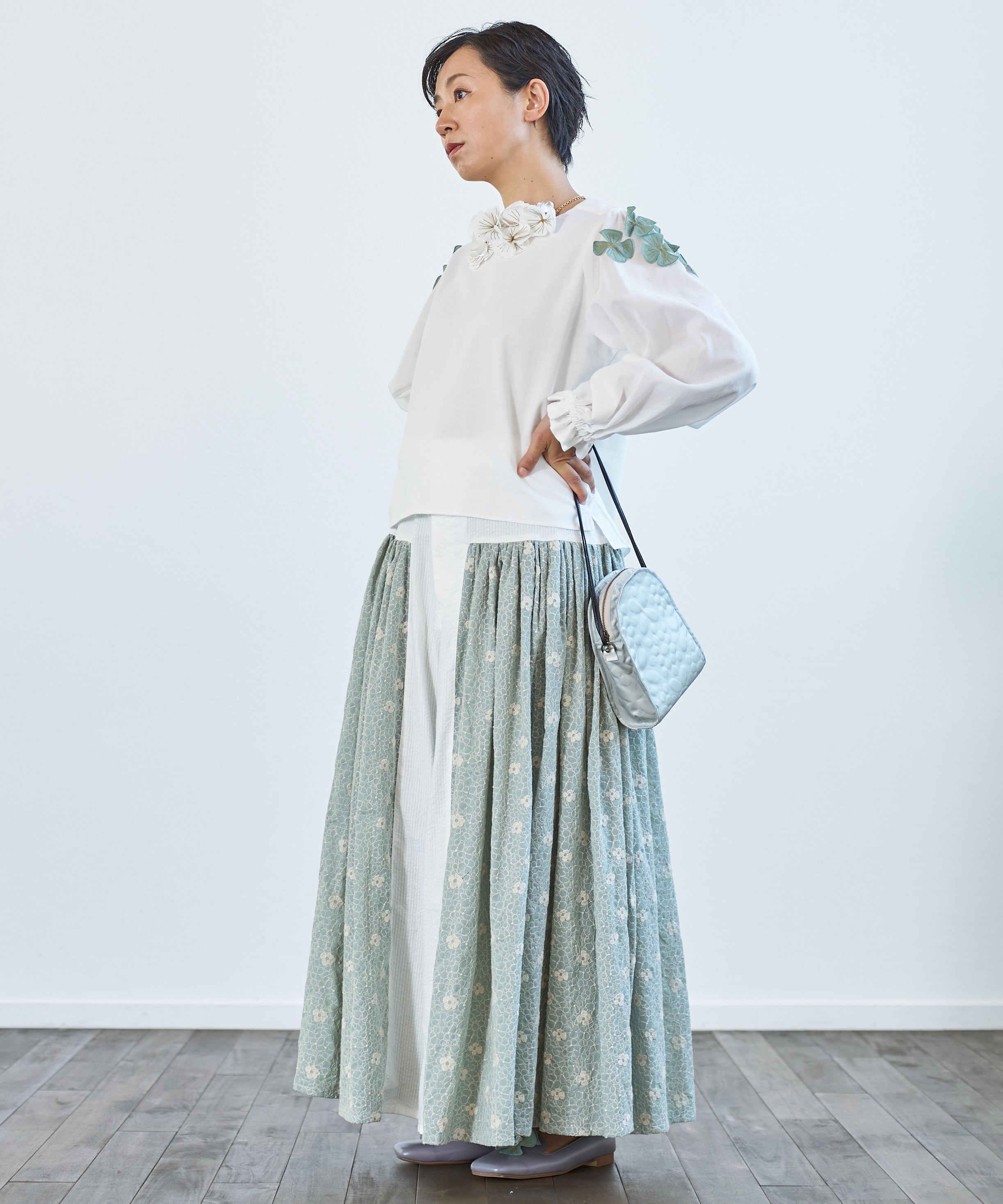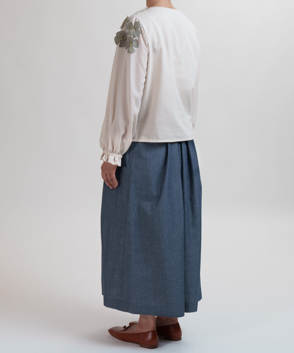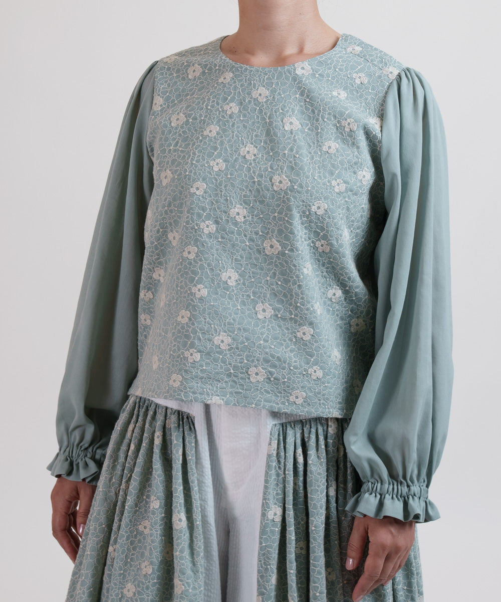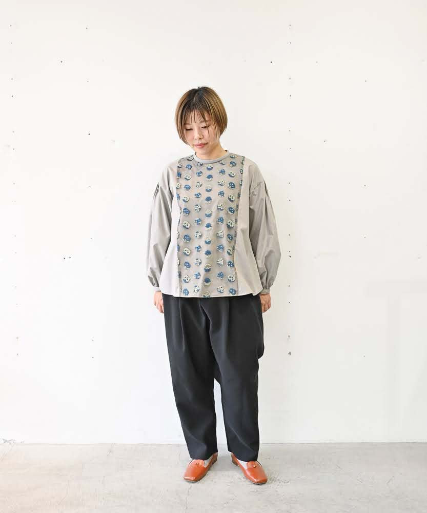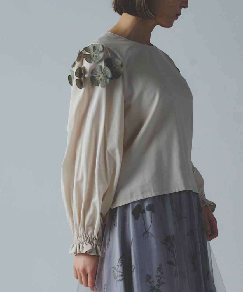 〈遠州織物〉あじさい小花柄刺繍切り替え ボリューム袖 プルオーバーブラウス (muk921)