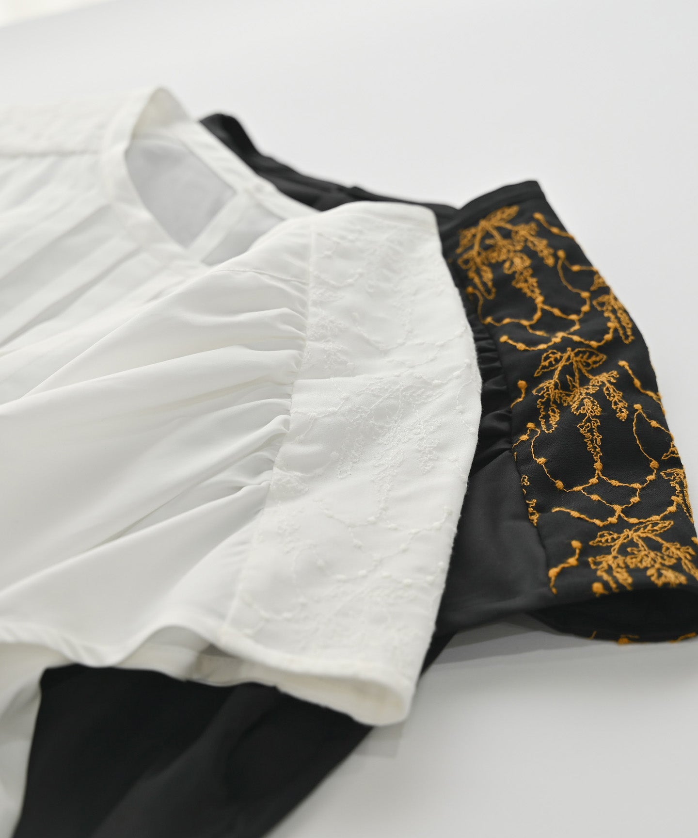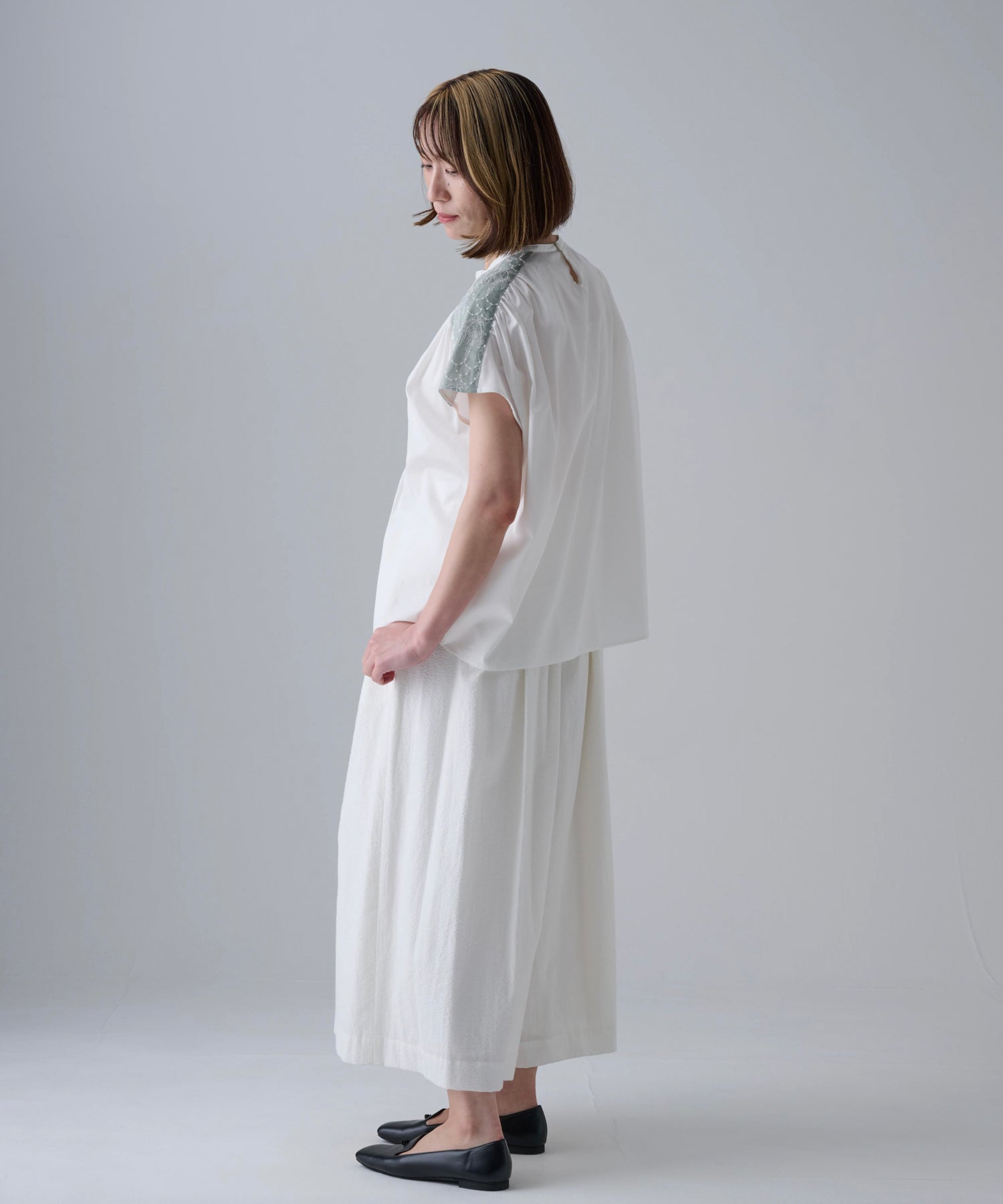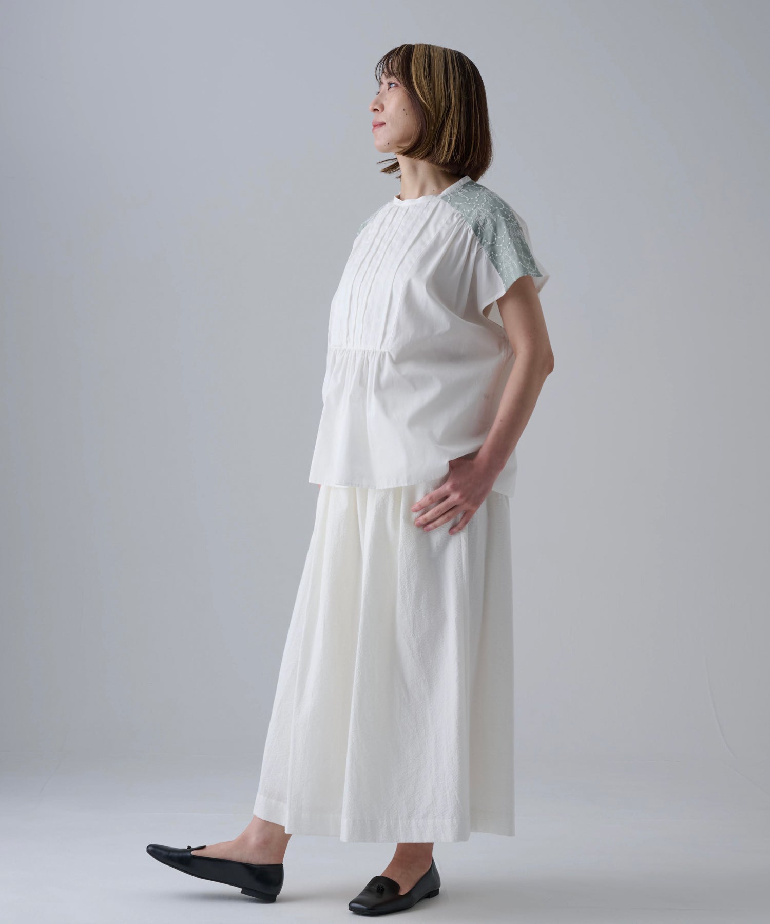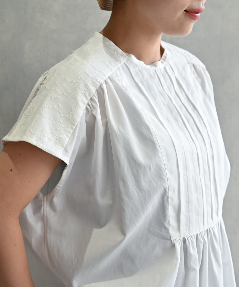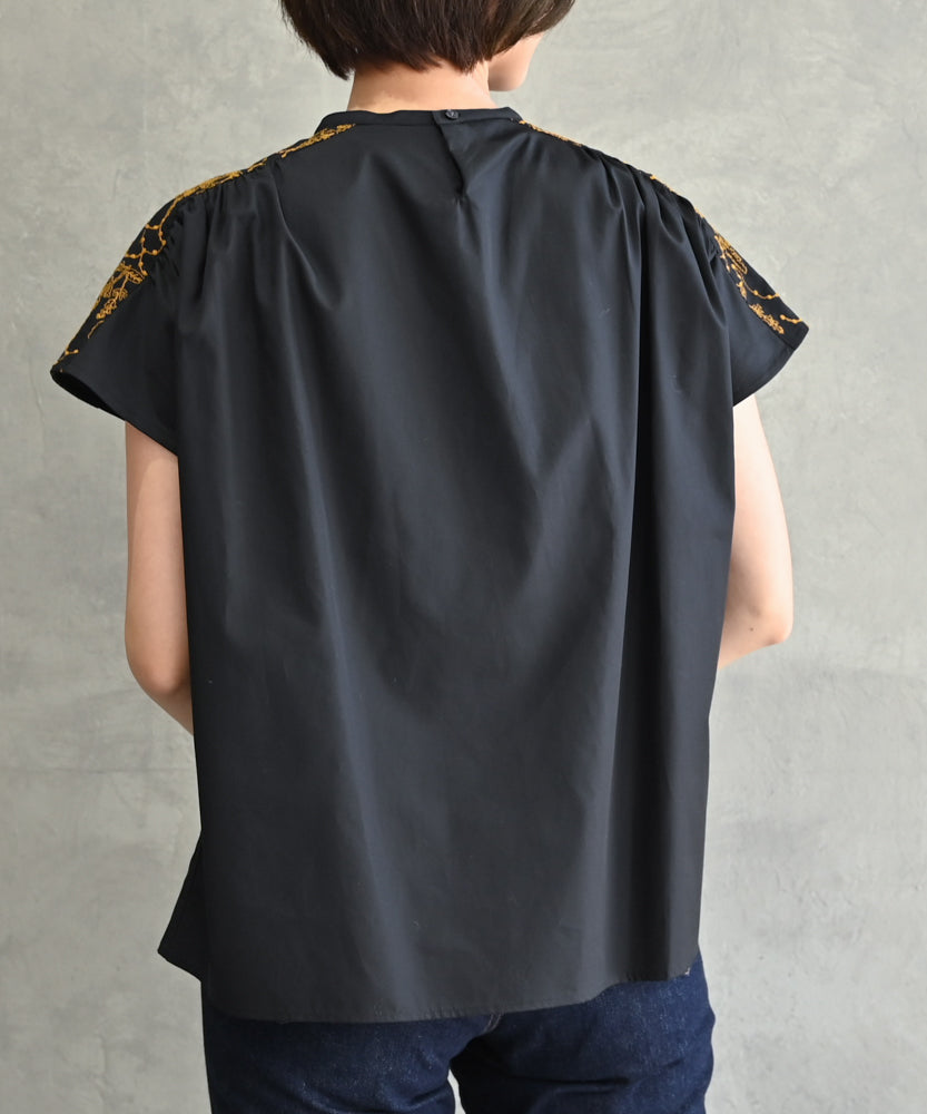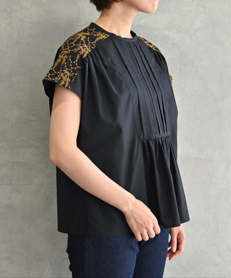 〈遠州織物 コットンシフォン生地〉イラカ刺繍 フロントタック フレンチスリーブ ブラウス (muf906)