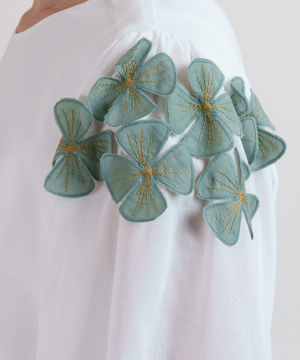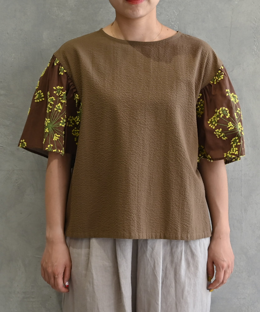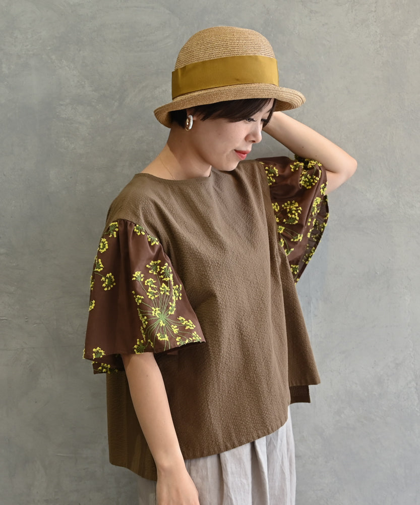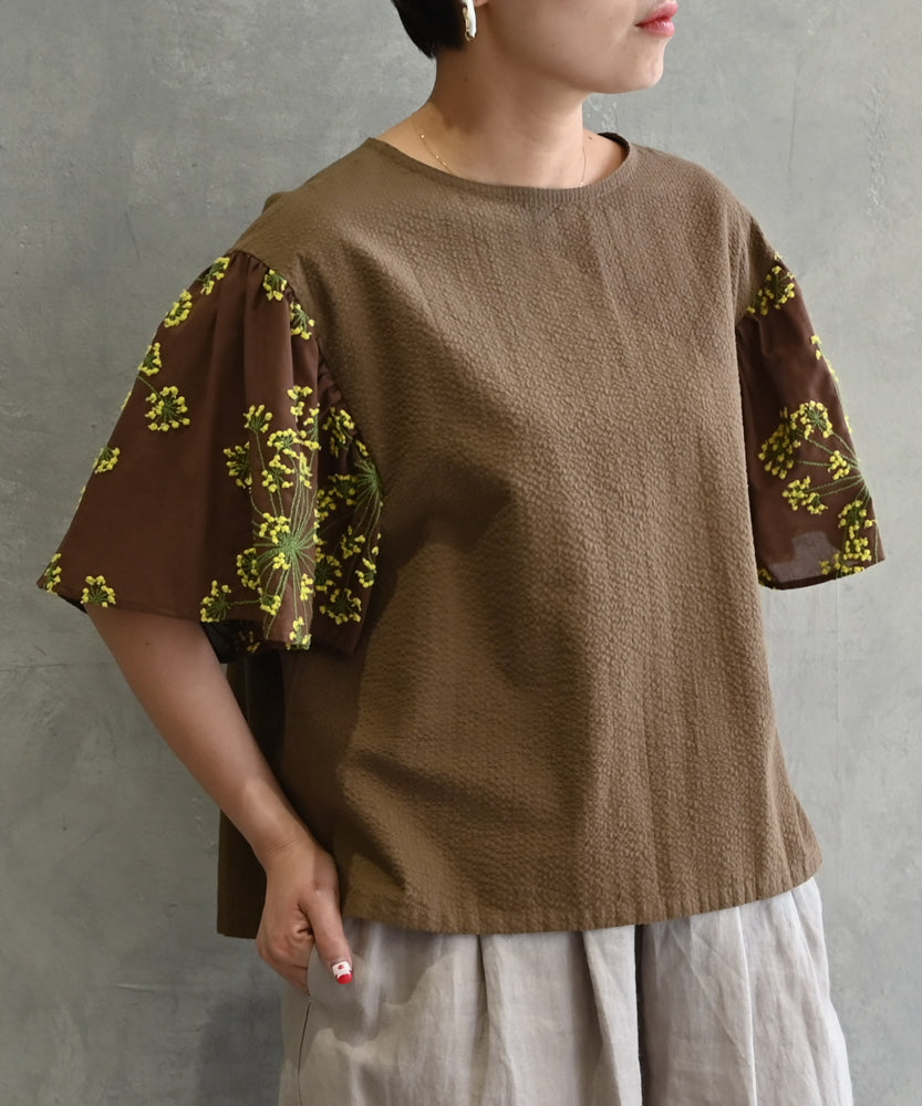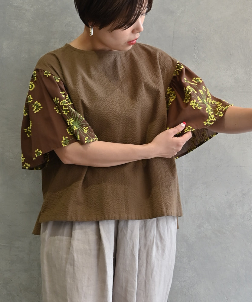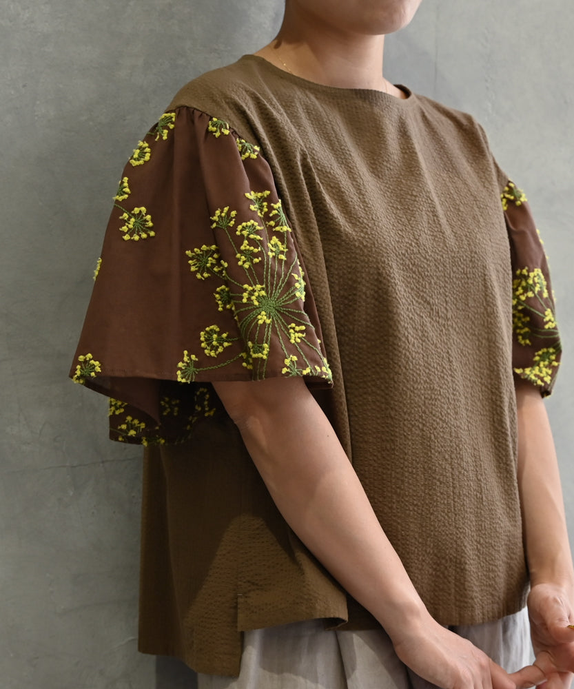 〈涼しいサッカー生地〉〈遠州織物〉フェンネルの花刺繍フレアー袖のプルオーバーブラウス (mud931)