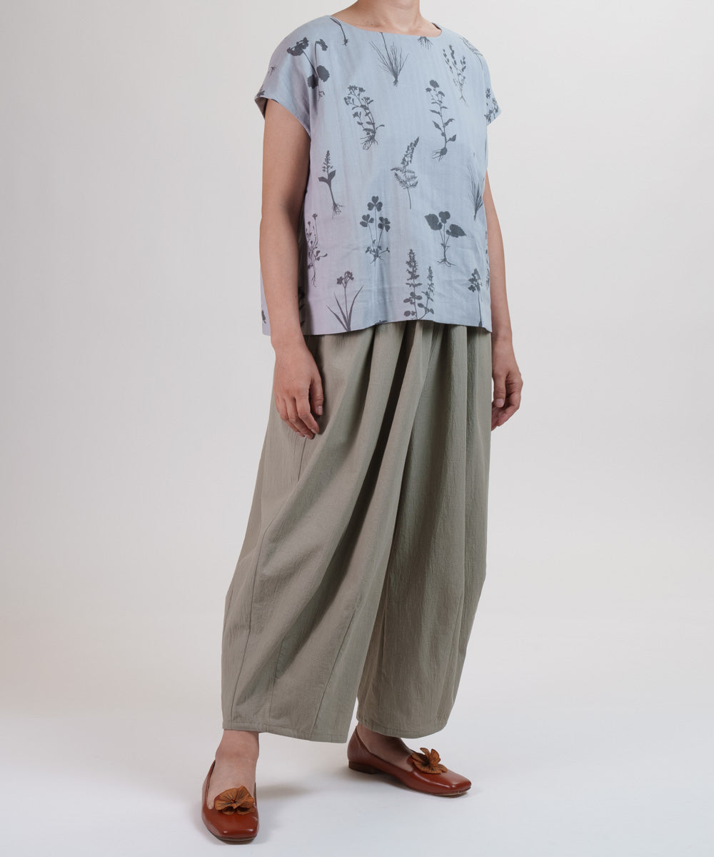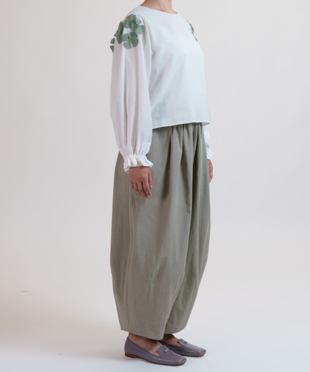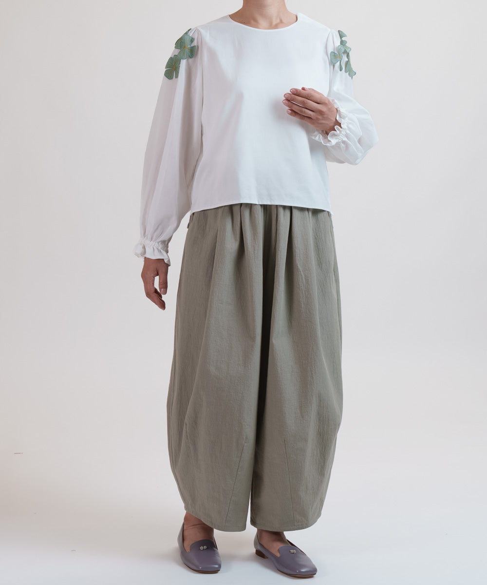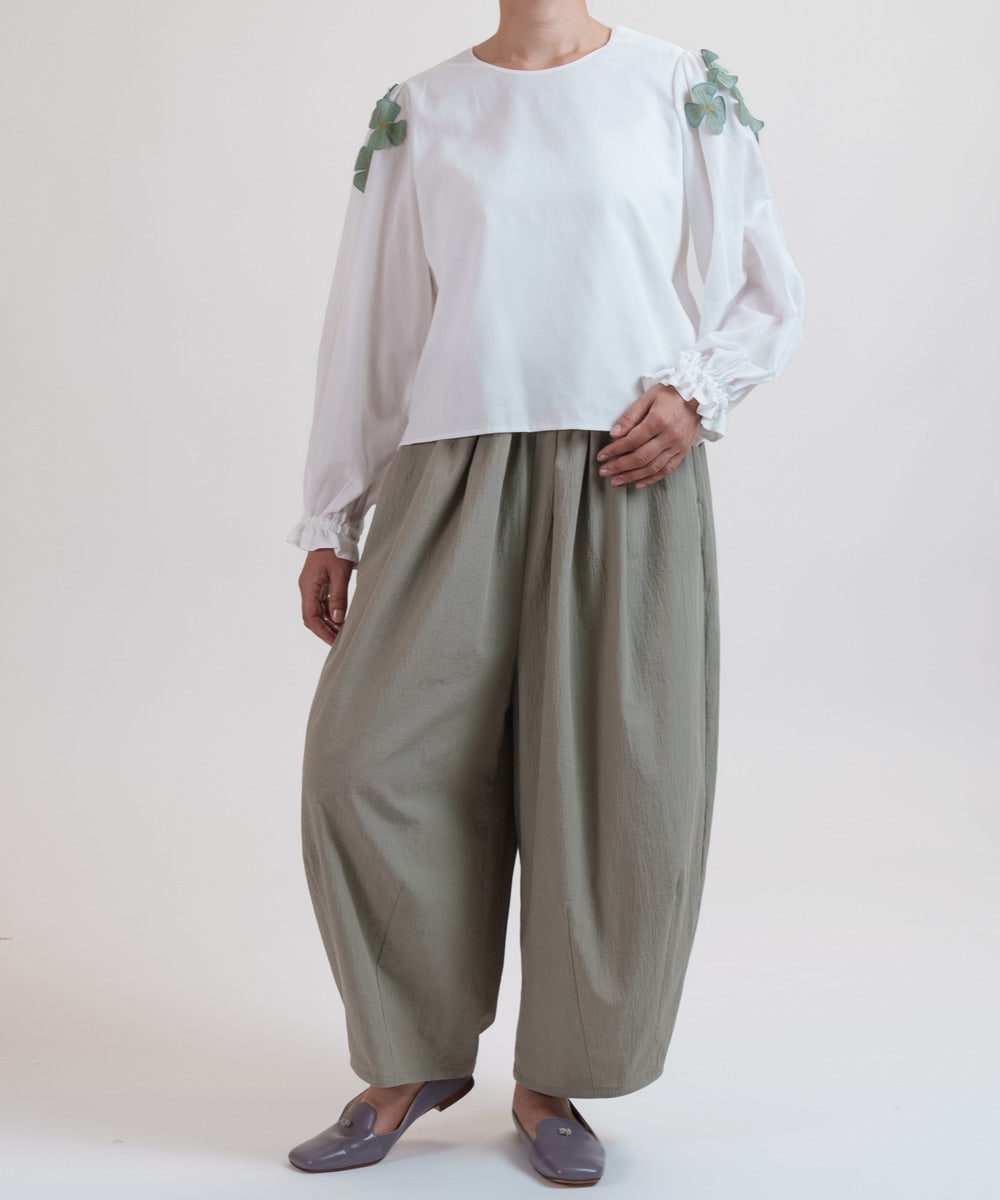 〈涼しいサッカー生地〉〈遠州織物〉フェンネルの花刺繍フレアー袖のプルオーバーブラウス (mud931)
