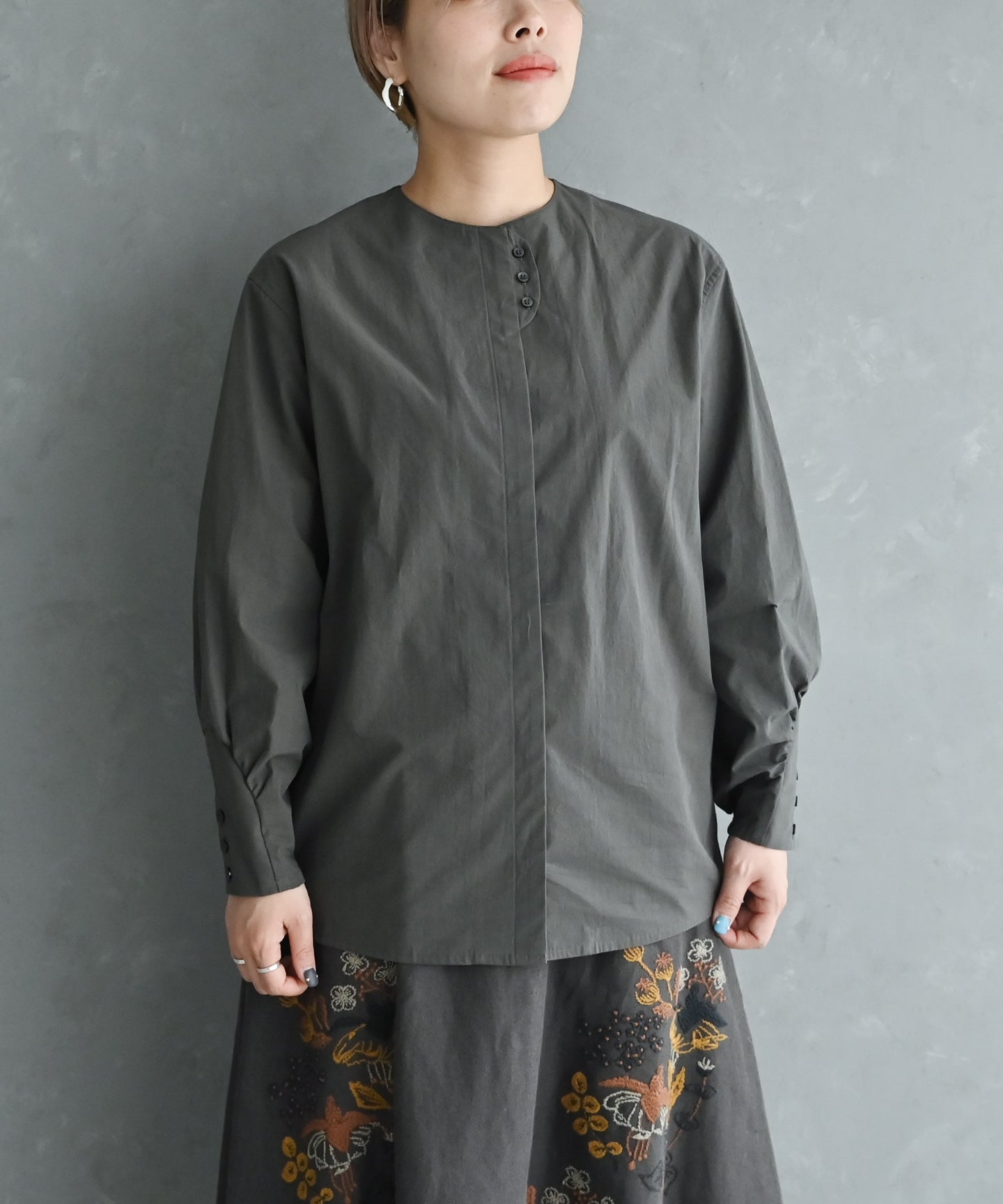 〈心地よいコットン・シアサッカー生地〉筆記帳刺繍ノーカラー左肩開きブラウス (mud906)