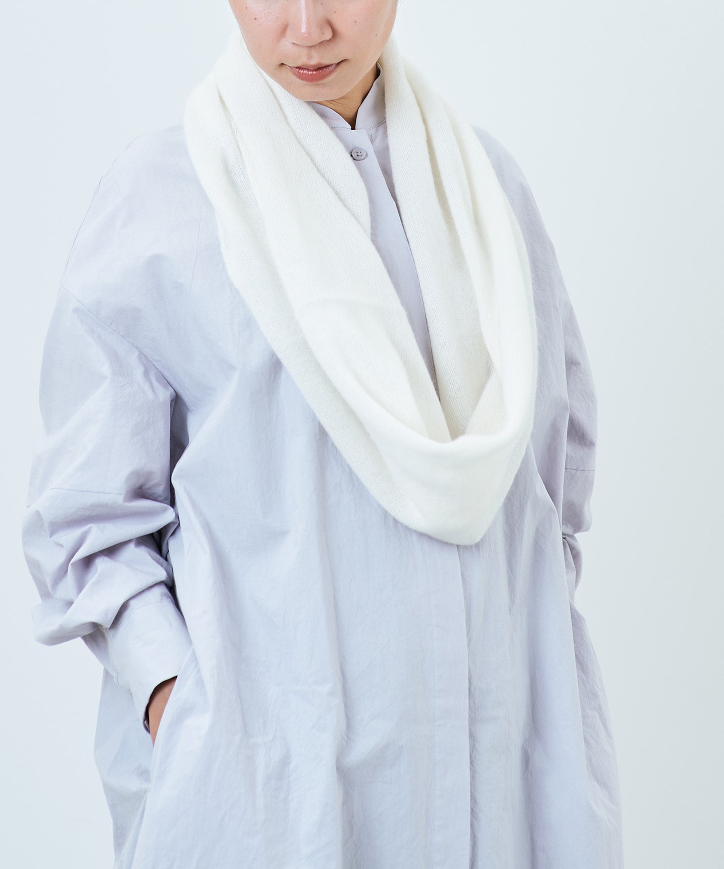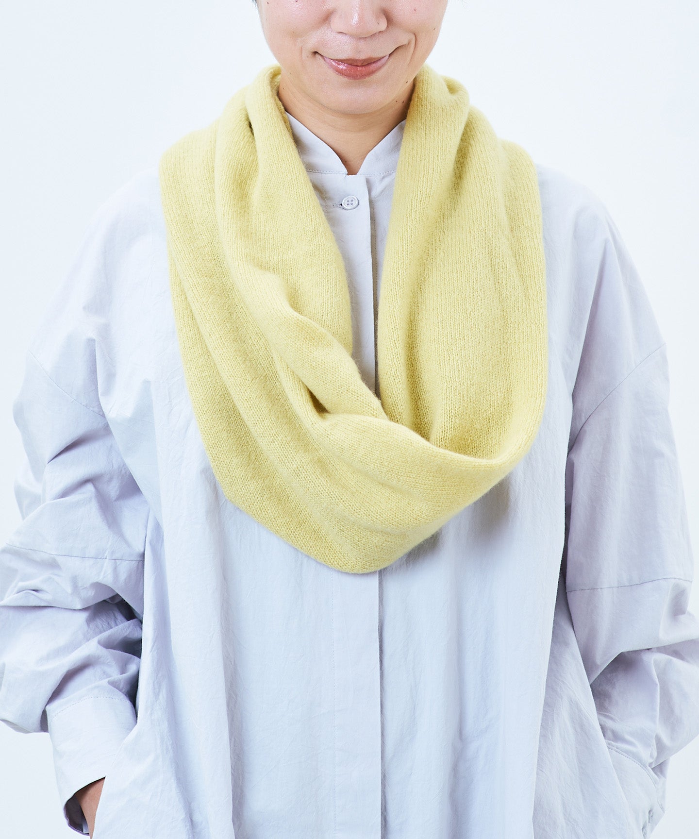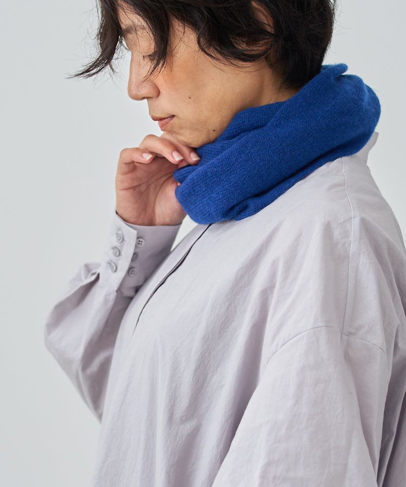 手編み機で編むことにより、非常に柔らかい肌さわりが改善し、発現もキレイなスヌードに仕上がりました。 編み立てから仕上げまですべて