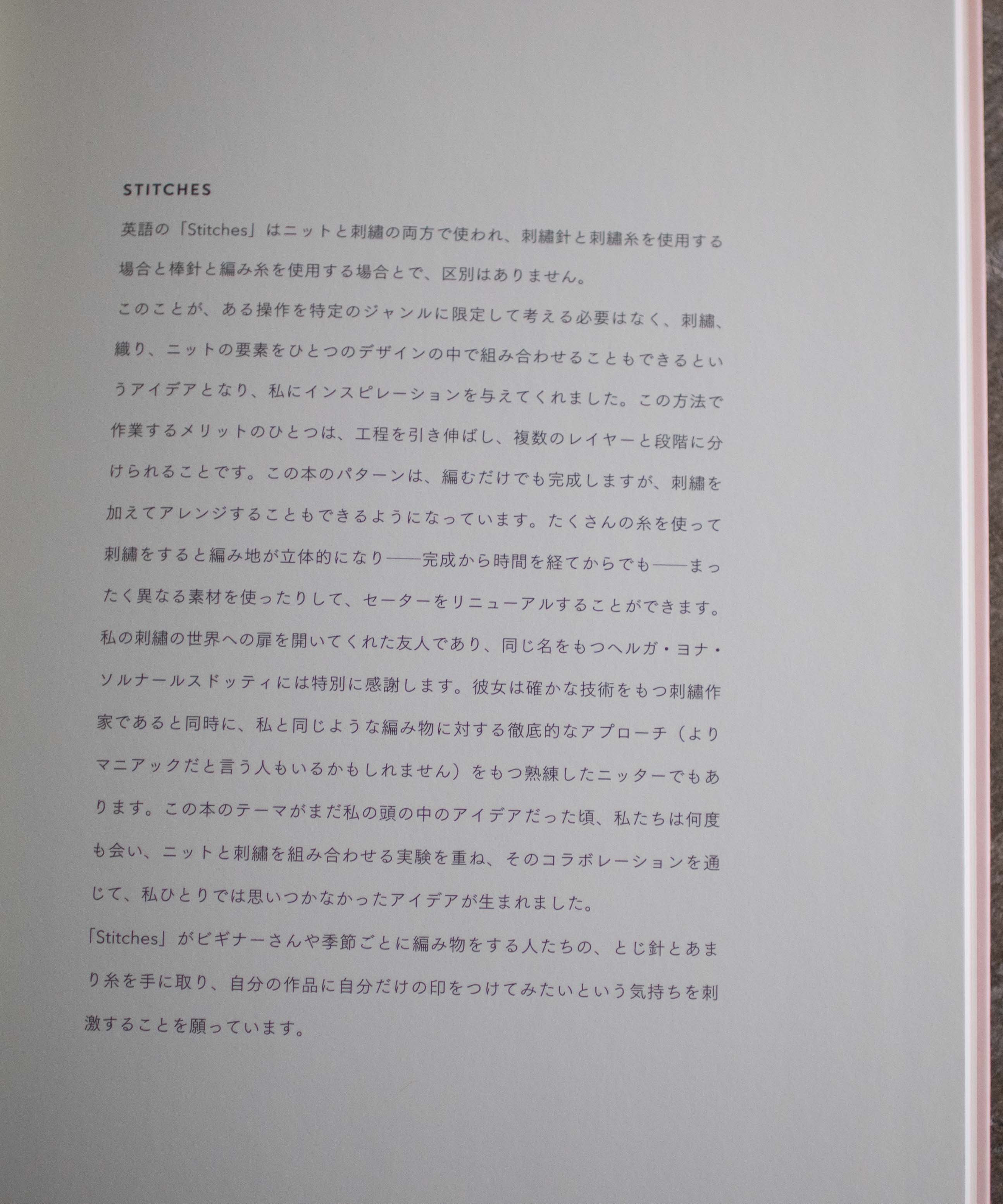 パターンブック「Stitches」は、ヘルガさんがニットでも刺繡でも“1目”は“Stitch”であることからインスピレーションを得て、ニットと刺繡の融合をテーマに作品をデザインされた一冊です。