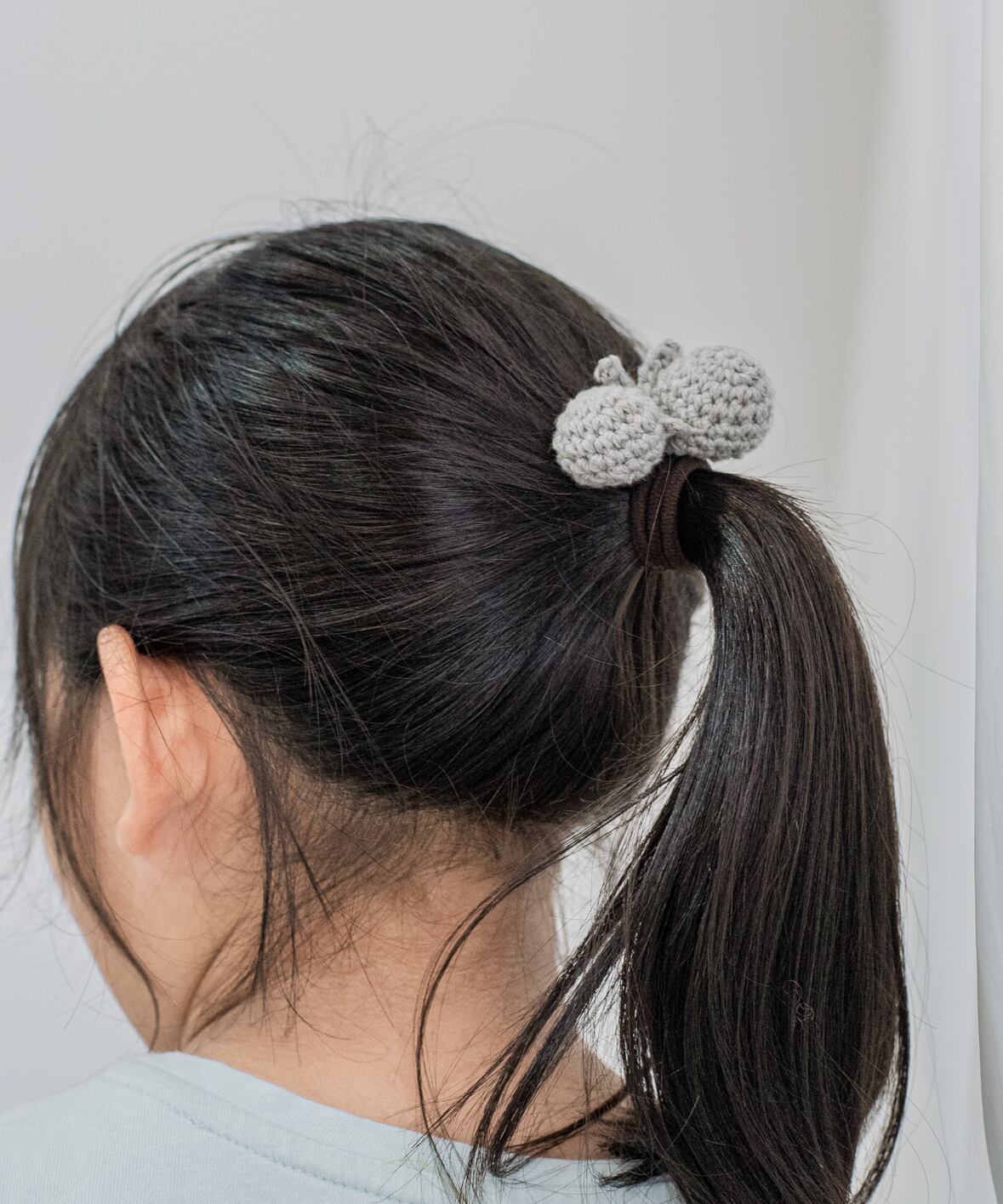 立体的な まんまる羽を付けたチョウチョモチーフを編んで、最後にブヘアゴムをまつり付ける手順です。