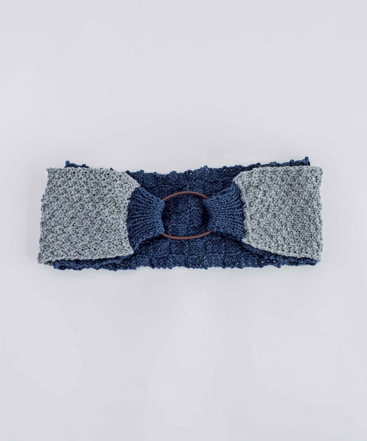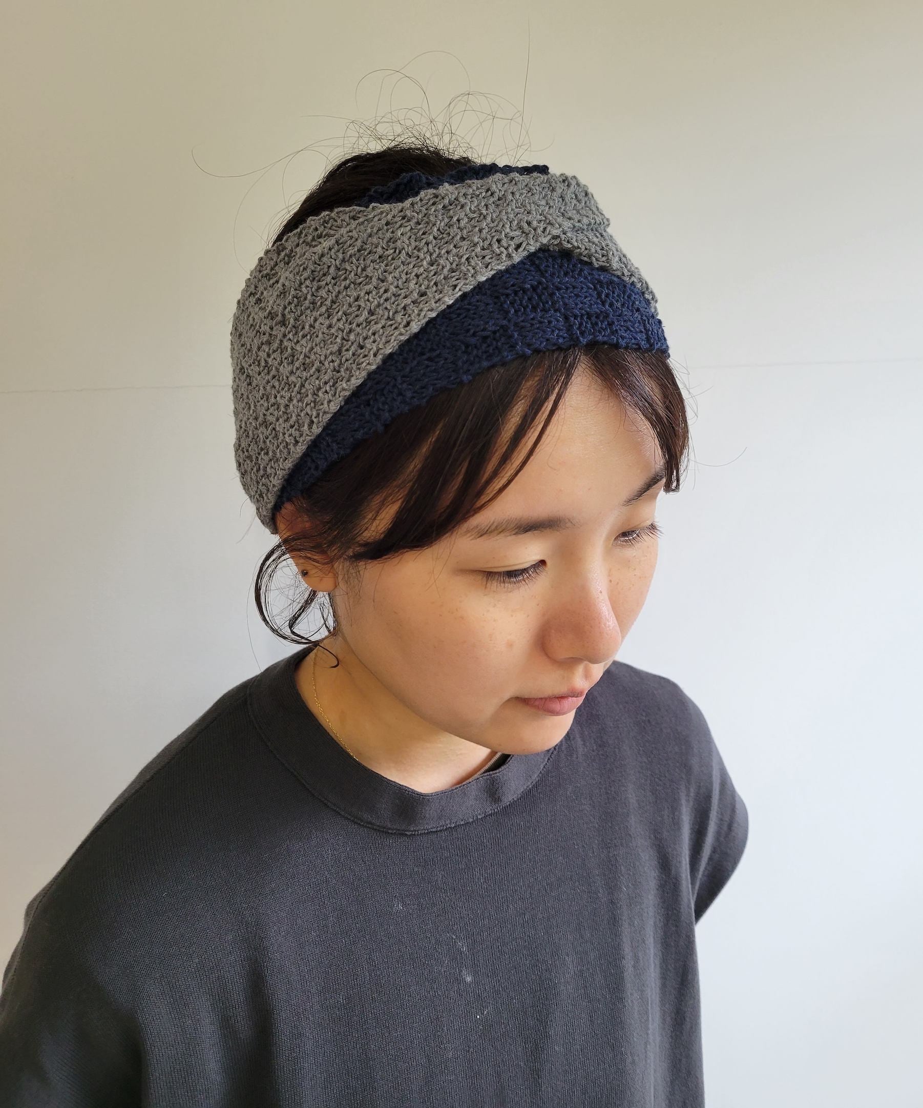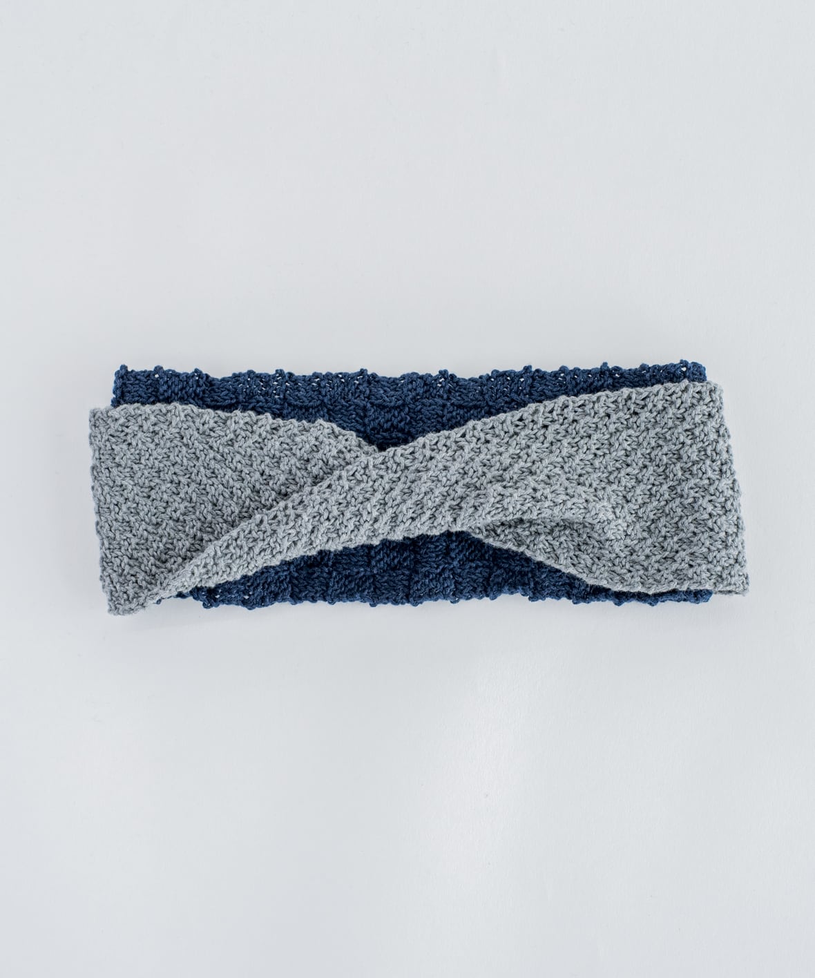 表編み、裏編みだけを使った編み地を2枚組み合わせたヘアバンドです。