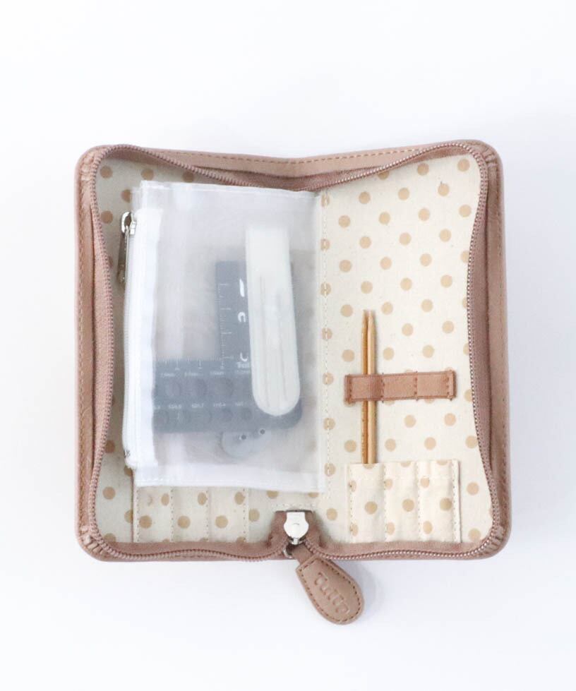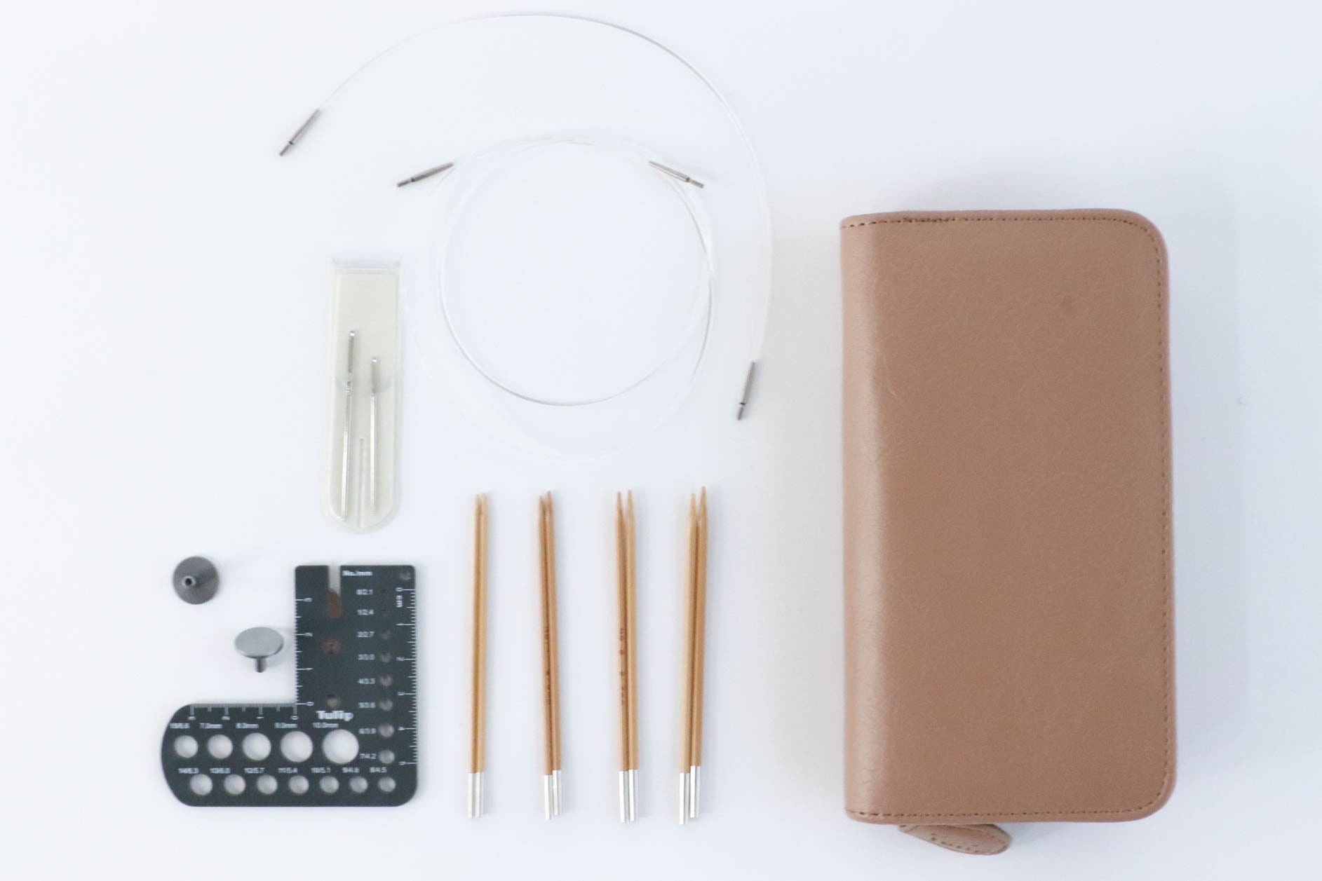 各サイズの針先、コード、コードの接続アダプター、ストッパー、とじ針、毛糸カッター付きゲージが入っており、組み合わせ自在でコードを延長したり、ストッパーを使用することで玉付2本棒針の様に様々な使い方が可能です。