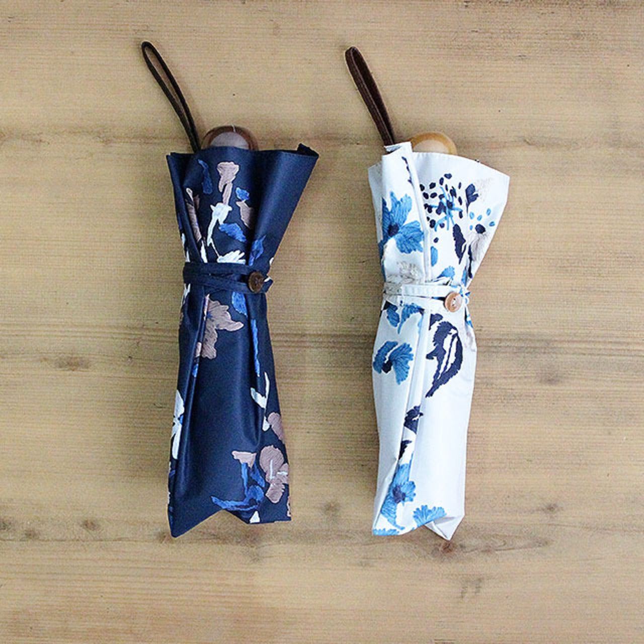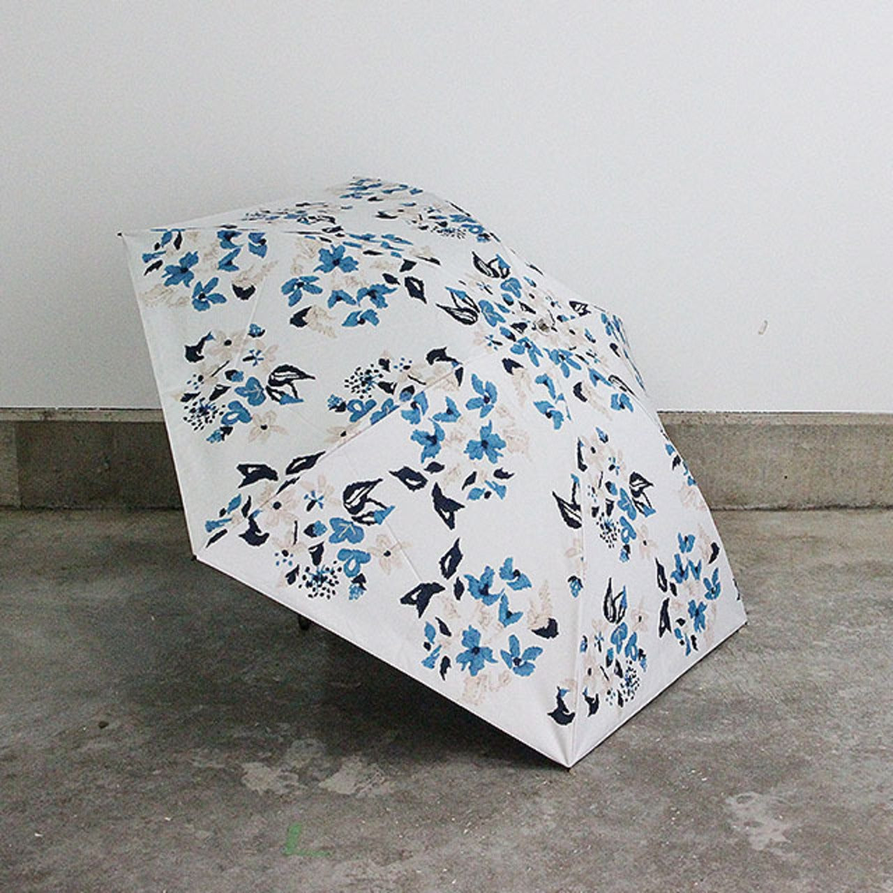 野小花刺繍柄をプリントした雨天兼用日傘(折りたたみ傘) ブルー
