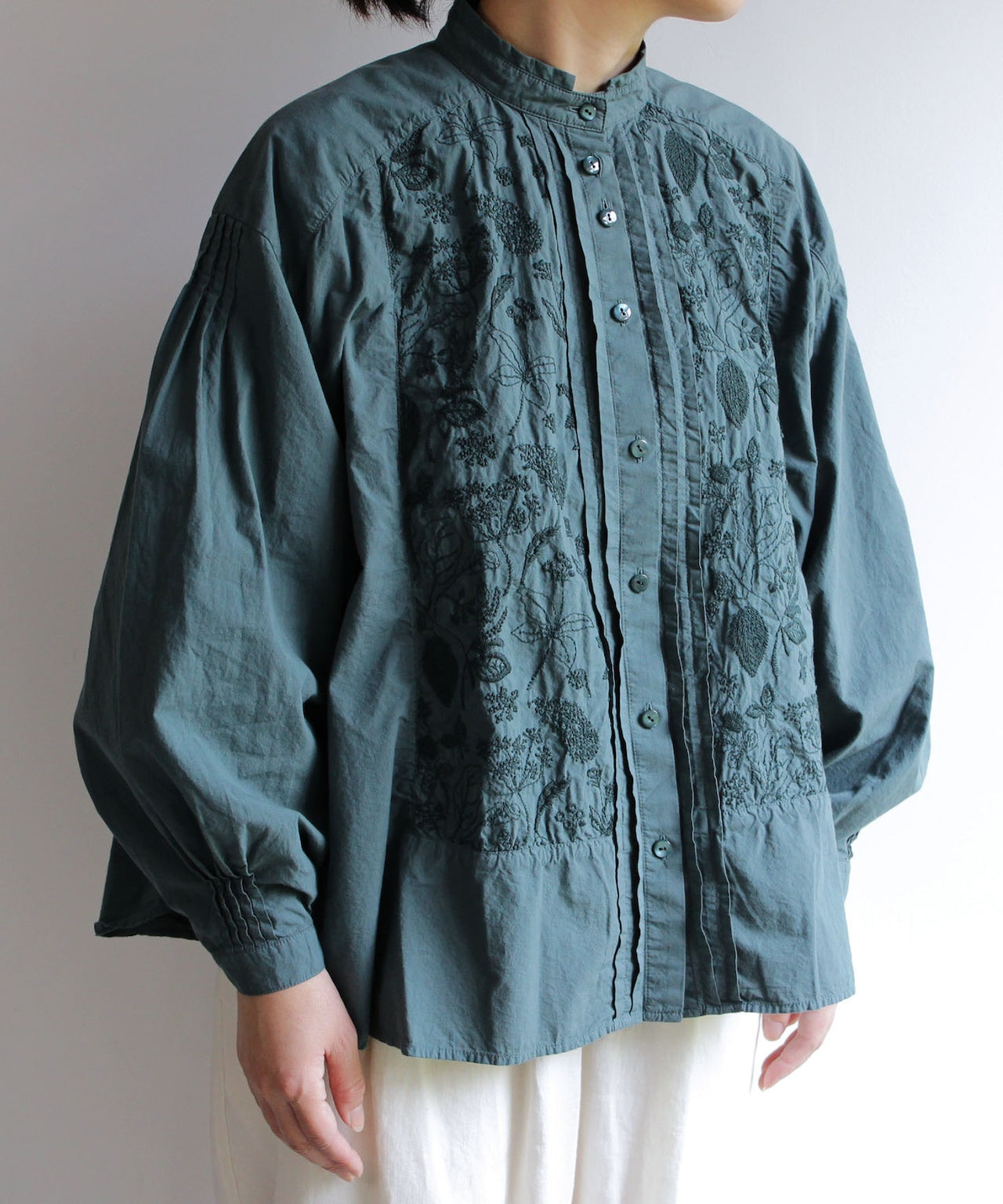 オーガニックコットン生地をメインに使用し、筆記帳刺繍生地とドッキングした、ゆったりサイズのスタンドカラーブラウスです。