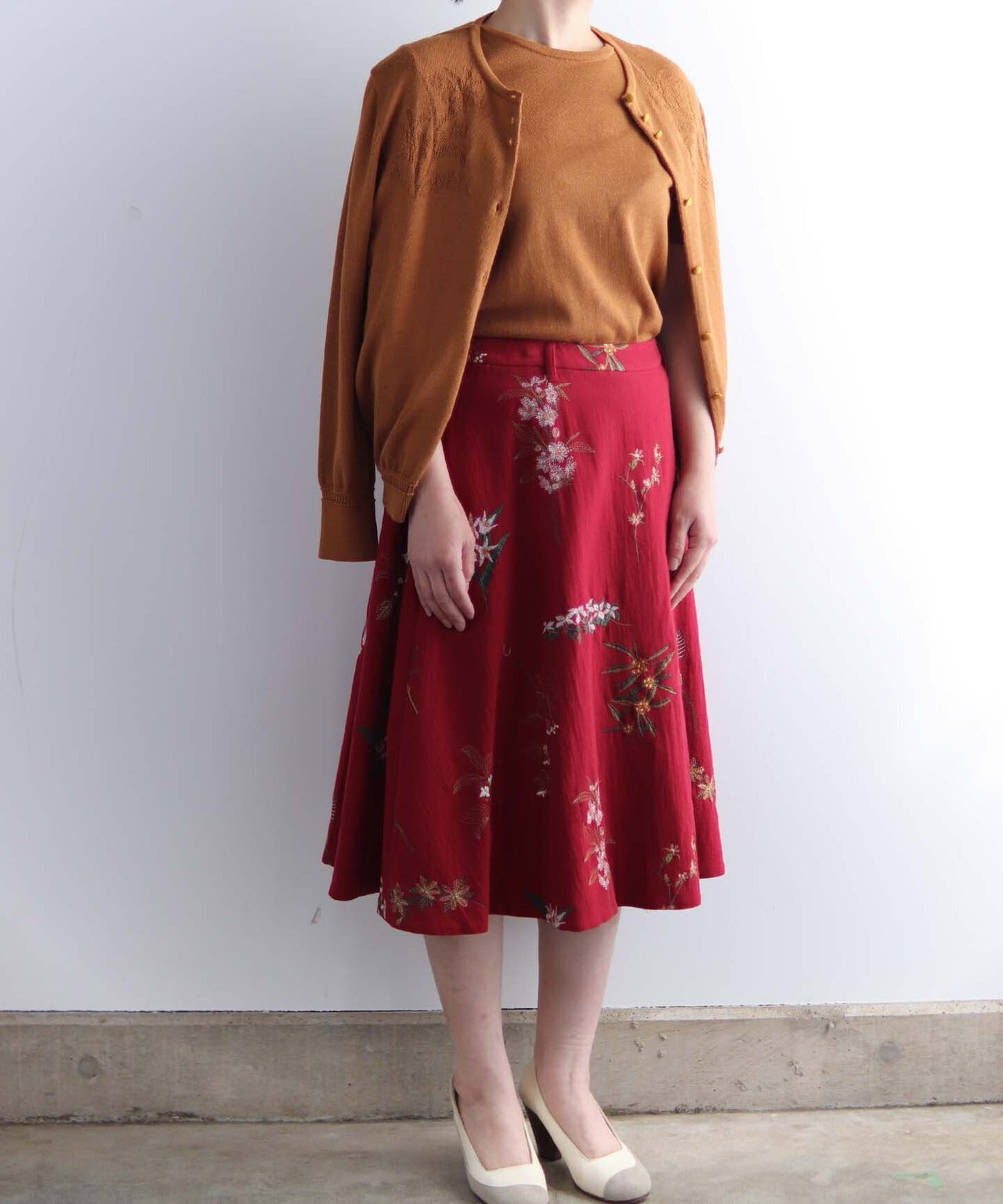 「果実花」・・・様々な果物の花(=ナツメ・ヤマボウシ・カキ・カリン・クチナシ・ナシ・アケビ・グミ・ミカン・クワ・ビワ)がモチーフになったオリジナル生地です。(洋服の個体差により、どの花が、どの位置に刺繍されているか多少変わります。)
