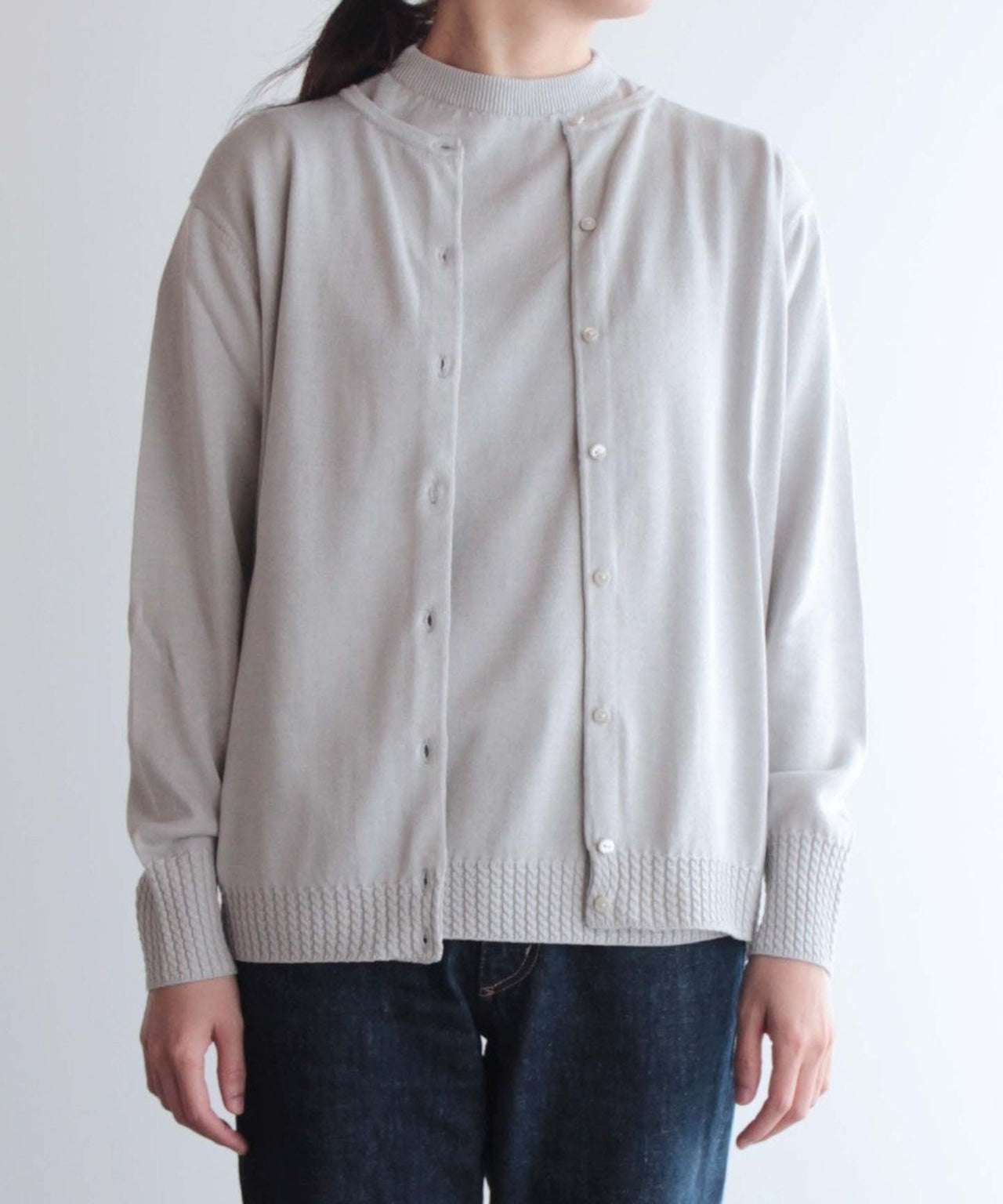 首元は丸襟で、年齢を問わずオフィスシーンやカジュアルシーンのコーディネートにもおすすめです。(同素材のシルクコットンのプルオーバーと合わせた アンサンブルのコーディネートもお勧めです。)